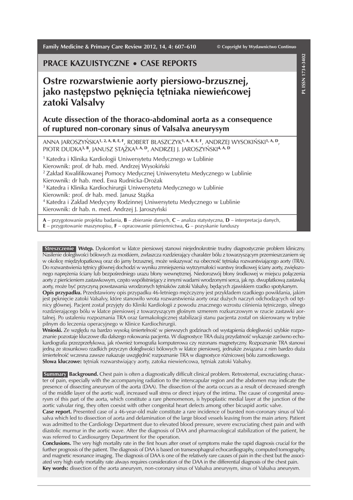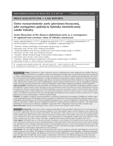 Ostre rozwarstwienie aorty piersiowo-brzusznej Family Medicine & Primary Care Review 2012, 14, 4: 607–610 Prace kazuistyczne © Copyright by Wydawnictwo Continuo • case reports Ostre rozwarstwienie aorty piersiowo-brzusznej, jako następstwo pęknięcia tętniaka niewieńcowej zatoki Valsalvy pl issn 1734-3402 A. Jaroszyńska i wsp. Acute dissection of the thoraco-abdominal aorta as a consequence of ruptured non-coronary sinus of Valsalva aneurysym Anna Jaroszyńska1, 2, A, B, E, F, Robert Błaszczyk1, A, B, E, F, Andrzej Wysokiński1, A, D, Piotr Dudka3, B, Janusz Stążka3, A, D, Andrzej J. Jaroszyński4, A, D 1 Katedra i Klinika Kardiologii Uniwersytetu Medycznego w Lublinie Kierownik: prof. dr hab. med. Andrzej Wysokiński 2 Zakład Kwalifikowanej Pomocy Medycznej Uniwersytetu Medycznego w Lublinie Kierownik: dr hab. med. Ewa Rudnicka-Drożak 3 Katedra i Klinika Kardiochirurgii Uniwersytetu Medycznego w Lublinie Kierownik: prof. dr hab. med. Janusz Stążka 4 Katedra i Zakład Medycyny Rodzinnej Uniwersytetu Medycznego w Lublinie Kierownik: dr hab. n. med. Andrzej J. Jaroszyński A – przygotowanie projektu badania, B – zbieranie danych, C – analiza statystyczna, D – interpretacja danych, E – przygotowanie maszynopisu, F – opracowanie piśmiennictwa, G – pozyskanie funduszy Streszczenie Wstęp. Dyskomfort w klatce piersiowej stanowi niejednokrotnie trudny diagnostycznie problem kliniczny. Nasilenie dolegliwości bólowych za mostkiem, zwłaszcza rozdzierający charakter bólu z towarzyszącym przemieszczaniem się w okolicę międzyłopatkową oraz do jamy brzusznej, może wskazywać na obecność tętniaka rozwarstwiającego aorty (TRA). Do rozwarstwienia tętnicy głównej dochodzi w wyniku zmniejszenia wytrzymałości warstwy środkowej ściany aorty, zwiększonego naprężenia ściany lub bezpośredniego urazu błony wewnętrznej. Niedorozwój błony środkowej w miejscu połączenia aorty z pierścieniem zastawkowym, często współistniejący z innymi wadami wrodzonymi serca, jak np. dwupłatkową zastawką aorty, może być przyczyną powstawania wrodzonych tętniaków zatoki Valsalvy, będących zjawiskiem rzadko spotykanym. Opis przypadku. Przedstawiony opis przypadku 46-letniego mężczyzny jest przykładem rzadkiego powikłania, jakim jest pęknięcie zatoki Valsalvy, które stanowiło wrota rozwarstwienia aorty oraz dużych naczyń odchodzących od tętnicy głównej. Pacjent został przyjęty do Kliniki Kardiologii z powodu znacznego wzrostu ciśnienia tętniczego, silnego rozdzierającego bólu w klatce piersiowej z towarzyszącym głośnym szmerem rozkurczowym w rzucie zastawki aortalnej. Po ustaleniu rozpoznania TRA oraz farmakologicznej stabilizacji stanu pacjenta został on skierowany w trybie pilnym do leczenia operacyjnego w Klinice Kardiochirurgii. Wnioski. Ze względu na bardzo wysoką śmiertelność w pierwszych godzinach od wystąpienia dolegliwości szybkie rozpoznanie pozostaje kluczowe dla dalszego rokowania pacjenta. W diagnostyce TRA dużą przydatność wykazuje zarówno echokardiografia przezprzełykowa, jak również tomografia komputerowa czy rezonans magnetyczny. Rozpoznanie TRA stanowi jedną ze stosunkowo rzadkich przyczyn dolegliwości bólowych w klatce piersiowej, jednakże związana z nim bardzo duża śmiertelność wczesna zawsze nakazuje uwzględnić rozpoznanie TRA w diagnostyce różnicowej bólu zamostkowego. Słowa kluczowe: tętniak rozwarstwiający aorty, zatoka niewieńcowa, tętniak zatoki Valsalvy. Summary Background. Chest pain is often a diagnostically difficult clinical problem. Retrosternal, excruciating character of pain, especially with the accompanying radiation to the interscapular region and the abdomen may indicate the presence of dissecting aneurysm of the aorta (DAA). The dissection of the aorta occurs as a result of decreased strength of the middle layer of the aortic wall, increased wall stress or direct injury of the intima. The cause of congenital aneurysm of this part of the aorta, which constitute a rare phenomenon, is hypoplastic medial layer at the junction of the aortic valvular ring, they often coexist with other congenital heart defects among other bicuspid aortic valve. Case report. Presented case of a 46-year-old male constitute a rare incidence of bursted non-coronary sinus of Valsalva which led to dissection of aorta and delamination of the large blood vessels leaving from the main artery. Patient was admitted to the Cardiology Department due to elevated blood pressure, severe excruciating chest pain and with diastolic murmur in the aortic wave. After the diagnosis of DAA and pharmacological stabilization of the patient, he was referred to Cardiosurgery Department for the operation. Conclusions. The very high mortality rate in the first hours after onset of symptoms make the rapid diagnosis crucial for the further prognosis of the patient. The diagnosis of DAA is based on transesophageal echocardiography, computed tomography, and magnetic resonance imaging. The diagnosis of DAA is one of the relatively rare causes of pain in the chest but the associated very high early mortality rate always requires consideration of the DAA in the differential diagnosis of the chest pain. Key words: dissection of the aorta aneurysm, non-coronary sinus of Valsalva aneurysym, sinus of Valsalva aneurysm. Family Medicine & Primary Care Review 2012, 14, 4 608 A. Jaroszyńska i wsp. Ostre rozwarstwienie aorty piersiowo-brzusznej Wstęp Opis przypadku Tętniak rozwarstwiający aorty (TRA) jest to rozwarstwienie aorty w obrębie jej błony środkowej spowodowane między innymi przez krwiak śródścienny. Do oddzielenia warstw ściany tętnicy głównej prowadzić może pęknięcie błony wewnętrznej lub krwawienie z vasa vasorum błony środkowej aorty. Przerwanie ciągłości błony wewnętrznej i środkowej powoduje wytworzenie w świetle naczynia dwóch kanałów: prawdziwego i rzekomego, komunikujących si