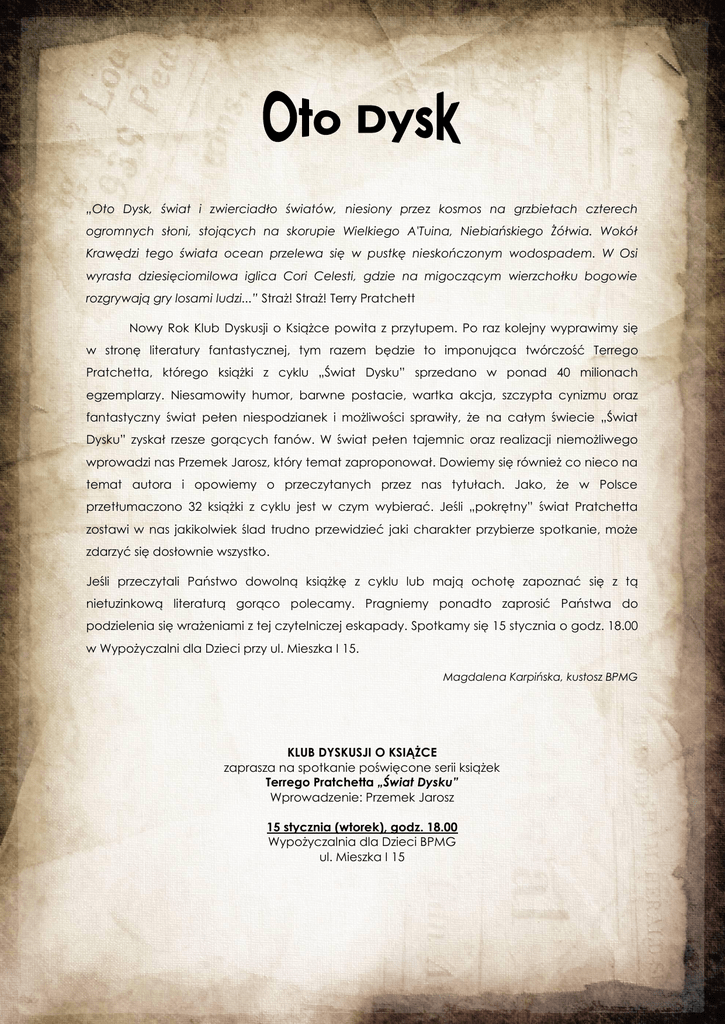„Oto Dysk, świat i zwierciadło światów, niesiony przez kosmos na grzbietach czterech ogromnych słoni, stojących na skorupie Wielkiego A'Tuina, Niebiańskiego Żółwia. Wokół Krawędzi tego świata ocean przelewa się w pustkę nieskończonym wodospadem. W Osi wyrasta dziesięciomilowa iglica Cori Celesti, gdzie na migoczącym wierzchołku bogowie rozgrywają gry losami ludzi...” Straż! Straż! Terry Pratchett Nowy Rok Klub Dyskusji o Książce powita z przytupem. Po raz kolejny wyprawimy się w stronę literatury fantastycznej, tym razem będzie to imponująca twórczość Terrego Pratchetta, którego książki z cyklu „Świat Dysku” sprzedano w ponad 40 milionach egzemplarzy. Niesamowity humor, barwne postacie, wartka akcja, szczypta cynizmu oraz fantastyczny świat pełen niespodzianek i możliwości sprawiły, że na całym świecie „Świat Dysku” zyskał rzesze gorących fanów. W świat pełen tajemnic oraz realizacji niemożliwego wprowadzi nas Przemek Jarosz, który temat zaproponował. Dowiemy się również co nieco na temat autora i opowiemy o przeczytanych przez nas tytułach. Jako, że w Polsce przetłumaczono 32 książki z cyklu jest w czym wybierać. Jeśli „pokrętny” świat Pratchetta zostawi w nas jakikolwiek ślad trudno przewidzieć jaki charakter przybierze spotkanie, może zdarzyć się dosłownie wszystko. Jeśli przeczytali Państwo dowolną książkę z cyklu lub mają ochotę zapoznać się z tą nietuzinkową literaturą gorąco polecamy. Pragniemy ponadto zaprosić Państwa do podzielenia się wrażeniami z tej czytelniczej eskapady. Spotkamy się 15 stycznia o godz. 18.00 w Wypożyczalni dla Dzieci przy ul. Mieszka I 15. Magdalena Karpińska, kustosz BPMG KLUB DYSKUSJI O KSIĄŻCE zaprasza na spotkanie poświęcone serii książek Terrego Pratchetta „Świat Dysku” Wprowadzenie: Przemek Jarosz 15 stycznia (wtorek), godz. 18.00 Wypożyczalnia dla Dzieci BPMG ul. Mieszka I 15