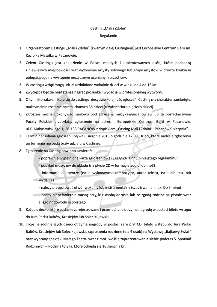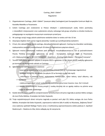 Casting „Mali i Zdolni” Regulamin 1. Organizatorem Castingu „Mali i Zdolni” (zwanym dalej Castingiem) jest Europejskie Centrum Bajki im. Koziołka Matołka w Pacanowie. 2. Celem Castingu jest znalezienie w Polsce młodych i utalentowanych osób, które pochodzą z niewielkich miejscowości oraz wyłonienie artysty solowego lub grupy artystów w drodze konkursu polegającego na występnie muzycznym ocenianym przed jury. 3. W castingu wziąć mogą udział uzdolnione wokalnie dzieci w wieku od 4 do 15 lat. 4. Zwycięzca będzie miał szanse nagrać piosenkę i wydać ją w profesjonalnej wytwórni. 5. O tym, kto zakwalifikuje się do castingu, decyduje kolejność zgłoszeń. Casting ma charakter zamknięty, maksymalnie zostanie przesłuchanych 35 dzieci (trzydzieścioro pięcioro dzieci). 6. Zgłoszeń można dokonywać mailowo pod adresem: [email protected] lub za pośrednictwem Poczty Polskiej przesyłając zgłoszenie na adres : Europejskie Centrum Bajki w Pacanowie, ul K. Makuszyńskiego 1; 28-133 PACANÓW z dopiskiem „Casting Mali i Zdolni – Pacanów 9 sierpnia”. 7. Termin nadsyłania zgłoszeń upływa 6 sierpnia 2015 o godzinie 12:00. Dzieci, które nadeślą zgłoszenia po terminie nie będą brały udziału w Castingu. 8. Zgłoszenie na Casting powinno zawierać: - poprawnie wypełnioną kartę zgłoszeniową (ZAŁĄCZNIK nr 1 niniejszego regulaminu) - podkład muzyczny do układu (na płycie CD w formacie audio lub mp3) - informację o utworze (tytuł, wykonawca, kompozytor, autor tekstu, tytuł albumu, rok wydania) - należy przygotować utwór wokalny lub instrumentalny (czas trwania: max. Do 5 minut) - osoby niepełnoletnie muszą przyjść z osobą dorosłą lub ze zgodą rodzica na piśmie wraz z jego nr dowodu osobistego 9. Każde dziecko, które zostanie zarejestrowane i przesłuchane otrzyma nagrodę w postaci biletu wstępu do Jura Parku Bałtów, Krasiejów lub Solec Kujawski, 10. Troje najzdolniejszych dzieci otrzyma nagrody w postaci serii płyt CD, biletu wstępu do Jura Parku Bałtów, Krasiejów lub Solec Kujawski, zaproszenia rodzinne (dla 4 osób) na Wystawę „Bajkowy Świat” oraz wybrany spektakl Małego Teatru wraz z możliwością zaprezentowania siebie podczas 5. Spotkań Rodzinnych – Rodzina to Siła, które odbędą się 16 sierpnia br. 11. Dodatkowo jedno z trojga wyróżnionych dzieci przejdzie do kolejnego etapu i otrzyma nagrody specjalne w postaci: Vouchera gwarantującego zagranie recitalu w duecie z gwiazdą wieczoru w trakcie Jubileuszowych X Spotkań Mistrzów Muzyki w czerwcu 2016 oraz rodzinny bilet wstępu All Inclusive (2 osoby dorosłe i 2 dzieci) do Europejskiego Centrum Bajki w Pacanowie ważny do końca czerwca 2016 roku. 12. Zwycięzca finału nagra autorską płytę z 10 piosenkami i wyda ją w wytwórni Happy Kids. 13. Nagrodą dla miejsca 2 jest nagranie singla. 14. Do finału może zakwalifikować się 25 uczestników z całej Polski. Finał odbędzie się w Jura Parku na przełomie września i października 2015r. 15. Placówki patronujące wokaliście wyrażają zgodę na rejestrację występów lub ich fragmentów na współcześnie dostępne nośniki obrazów i dźwięków oraz ich wykorzystanie przez Organizatorów – bez roszczeń finansowych z tym związanych. 16. Koszty związane z przyjazdem oraz inne poniesione w trakcie pobytu w dniu Castingu ponosi instytucja patronująca wokalistom, uczestnicy bądź ich opiekunowie. 17. Wypełnienie i podpisanie karty zgłoszenia jest wyrazem akceptacji regulaminu i warunków udziału w Castingu. 18. Kontakt w sprawie Konkursu: Europejskie Centrum Bajki im. Koziołka Matołka w Pacanowie, ul. Kornela Makuszyńskiego 1, 28-133 Pacanów, tel.: 41 376 50 88 tel. kom.: 516 357 047 e-mail: [email protected] [email protected] PRZEBIEG CASTINGU: 1. Przesłuchania rozpoczną się w niedzielę 9 sierpnia od godziny 15:00. 2. W ramach Castingu uczestnik zaprezentuje przygotowany przez siebie utwór zgodnie z deklaracją w zgłoszeniu – maksymalny czas trwania utworu do 5 minut. 4. Przewidywany czas trwania castingu: do godziny 18:00, jednakże z przyczyn organizacyjnych Casting może potrwać do godzin wczesnowieczornych. 5. W trakcie trwania Castingów jurorzy wyłonią 3 najzdolniejszych dzieci, które zrobiły na nich największe wrażenie. Jedno dziecko przechodzi o kolejnego etapu. 5. Organizator zapewnia uczestnikom Spotkania: niezbędne warunki do prezentacji (scena z nagłośnieniem); wodę mineralną w trakcie przesłuchań w ilości 0,5l/ osoba dyplomy pamiątkowe oraz niespodzianki. ZAŁĄCZNIK NR 1 – KARTA ZGŁOSZENIOWA: KARTA ZGŁOSZENIOWA - CASTING MALI I ZDOLNI 9 sierpnia 2015 Wypełnione zgłoszenie wraz z podpisem należy przesłać w postaci skanu na adres e-mail: [email protected] lub pocztą pod adres: Europejskie Centrum Bajki im. Koziołka Matołka w Pacanowie 28-133 Pacanów; ul. Kornela Makuszyńskiego 1 1. Imię i nazwisko uczestnika: ......................................................................................... 2. Wiek uczestnika (klasa): ......................................................................................... 3. Instytucja patronująca/ opiekun (nazwa, adres, seria i nr dowodu osobistego): ................................................................................................................................................. ................................................................................................................................................. 4. Repertuar: …….................................................................................. 5. Autor słów: ......................................................................................... 6. Autor muzyki:......................................................................................... 7. Instruktor: ......................................................................................... 8. Kontakt do opiekuna (tel./a