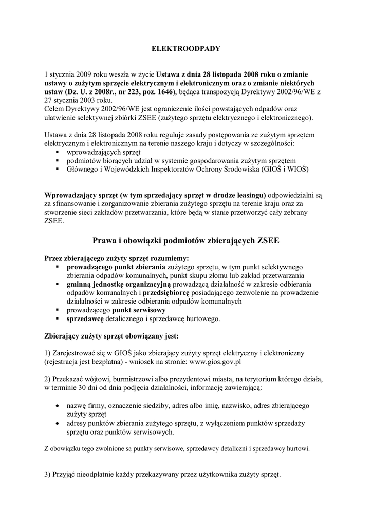ELEKTROODPADY 1 stycznia 2009 roku weszła w życie Ustawa z dnia 28 listopada 2008 roku o zmianie ustawy o zużytym sprzęcie elektrycznym i elektronicznym oraz o zmianie niektórych ustaw (Dz. U. z 2008r., nr 223, poz. 1646), będąca transpozycją Dyrektywy 2002/96/WE z 27 stycznia 2003 roku. Celem Dyrektywy 2002/96/WE jest ograniczenie ilości powstających odpadów oraz ułatwienie selektywnej zbiórki ZSEE (zużytego sprzętu elektrycznego i elektronicznego). Ustawa z dnia 28 listopada 2008 roku reguluje zasady postępowania ze zużytym sprzętem elektrycznym i elektronicznym na terenie naszego kraju i dotyczy w szczególności: wprowadzających sprzęt podmiotów biorących udział w systemie gospodarowania zużytym sprzętem Głównego i Wojewódzkich Inspektoratów Ochrony Środowiska (GIOŚ i WIOŚ) Wprowadzający sprzęt (w tym sprzedający sprzęt w drodze leasingu) odpowiedzialni są za sfinansowanie i zorganizowanie zbierania zużytego sprzętu na terenie kraju oraz za stworzenie sieci zakładów przetwarzania, które będą w stanie przetworzyć cały zebrany ZSEE. Prawa i obowiązki podmiotów zbierających ZSEE Przez zbierającego zużyty sprzęt rozumiemy: prowadzącego punkt zbierania zużytego sprzętu, w tym punkt selektywnego zbierania odpadów komunalnych, punkt skupu złomu lub zakład przetwarzania gminną jednostkę organizacyjną prowadzącą działalność w zakresie odbierania odpadów komunalnych i przedsiębiorcę posiadającego zezwolenie na prowadzenie działalności w zakresie odbierania odpadów komunalnych prowadzącego punkt serwisowy sprzedawcę detalicznego i sprzedawcę hurtowego. Zbierający zużyty sprzęt obowiązany jest: 1) Zarejestrować się w GIOŚ jako zbierający zużyty sprzęt elektryczny i elektroniczny (rejestracja jest bezpłatna) - wniosek na stronie: www.gios.gov.pl 2) Przekazać wójtowi, burmistrzowi albo prezydentowi miasta, na terytorium którego działa, w terminie 30 dni od dnia podjęcia działalności, informację zawierającą: nazwę firmy, oznaczenie siedziby, adres albo imię, nazwisko, adres zbierającego zużyty sprzęt adresy punktów zbierania zużytego sprzętu, z wyłączeniem punktów sprzedaży sprzętu oraz punktów serwisowych. Z obowiązku tego zwolnione są punkty serwisowe, sprzedawcy detaliczni i sprzedawcy hurtowi. 3) Przyjąć nieodpłatnie każdy przekazywany przez użytkownika zużyty sprzęt. Sprzedawca detaliczny, sprzedawca hurtowy oraz prowadzący punkt serwisowy może odmówić przyjęcia zużytego sprzętu w przypadku, gdy stwarza on zagrożenie dla zdrowia lub życia osób przyjmujących zużyty sprzęt. Punkty serwisowe, zajmujące się naprawą zepsutych urządzeń elektrycznych i elektronicznych, muszą przyjąć sprzęt w przypadku, gdy jego naprawa jest niemożliwa ze względów technicznych lub w razie stwierdzenia, że naprawa sprzętu jest nieopłacalna, np kiedy cena serwisu przewyższa wartość nowego urządzenia. 4) Do selektywnego składowania, przechowywania przyjętego sprzętu. 5) Przekazać zebrany ZSEE prowadzącemu zakład przetwarzania, wpisanemu do rejestru prowadzonego przez GIOŚ. 6) Zapewnić odpowiedni transport zużytego sprzętu do zakładu przetwarzania. 7) Każdego roku sporządzać i przedkładać Głównemu Inspektorowi Ochrony Środowiska sprawozdania, o masie zebranego i przekazanego do prowadzącego zakład przetwarzania zużytego sprzętu, w terminie: do dnia 31 lipca (za okres od 1 stycznia do 30 czerwca) do dnia 15 marca (za okres od 1 lipca do 31 grudnia) Ponadto do obowiązków sprzedawców detalicznych i hurtowych należy: Sprzedaż wyłącznie sprzętu wprowadzanego do obrotu przez zarejestrowanego w rejestrze GIOŚ wprowadzającego sprzęt. Sprzedaż sprzętu przeznaczonego dla gospodarstw domowych wraz z dołączoną informacją dotyczącą: zakazu umieszczania zużytego sprzętu łącznie z innymi odpadami oraz interpretacją symbolu „przekreślonego kosza” potencjalnych skutków dla środowiska i zdrowia ludzi wynikających z obecności składników niebezpiecznych w sprzęcie masy sprzętu. Umieszczenie w punktach sprzedaży informacji o punktach zbierania zużytego sprzętu. Nieodpłatne przyjęcie zużytego sprzętu elektrycznego i/lub elektronicznego w ilości nie większej niż sprzedawany nowy sprzęt, jeżeli zużyty sprzęt jest tego samego rodzaju. Sprzedawca przy sprzedaży nowego odbiornika telewizyjnego ma, zatem, obowiązek przyjąć stary odbiornik telewizyjny bez względu na jego rozmiar, markę czy wykorzystaną w nim technologię. Nieodpłatne przekazanie przyjętego zużytego sprzętu prowadzącemu zakład przetwarzania lub sprzedawcy hurtowemu (sprzedawca detaliczny) lub prowadzącemu zakład przetwarzania (sprzedawca hurtowy). Sklep/hurtownia nie ma obowiązku odbioru starego sprzętu z domu klienta, może jednak zaoferować klientowi bezpłatną usługę transportową i przeniesienie oraz załadowanie starego sprzętu do samochodu, jako element przewagi konkurencyjnej nad innymi punktami handlowymi. Sklepy mogą próbować oferować odpłatną usługę odbioru sprzętu od klienta. W praktyce będzie to trudne, ponieważ klient płacąc KGO (Koszty Gospodarowania Odpadami) będzie wymagał odbioru starego urządzenia od siebie z domu. Trudno będzie mu zrozumieć, że opłata recyklingowa finansuje jedynie koszty transportu sprzętu z punktu zbierania do przetwarzającego oraz cały proces przetwarzania i unieszkodliwiania. Prawa i obowiązki konsumentów Konsument zobowiązany jest oddawać zużyty sprzęt elektryczny i elektroniczny zbierającemu ZSEE Konsument ma prawo do nieodpłatnego oddania swojego zużytego sprzętu elektrycznego lub elektronicznego w sklepie, który przyjmuje zużyty sprzęt w ilości nie większej niż sprzedawany nowy sprzęt na zasadzie 1 za 1. W przypadku, gdy sklep odmówi przyjęcia zużytego sprzętu elektrycznego lub elektronicznego, na zasadzie 1 za 1 w ilości nie większej niż sprzedawany n