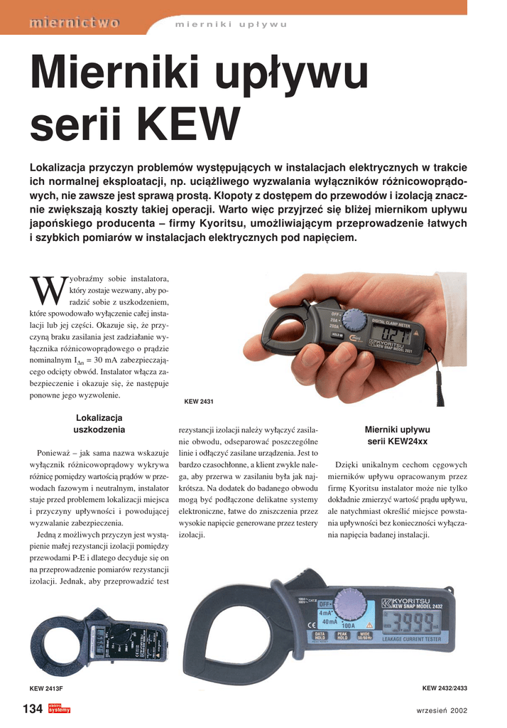 mierniki up≥ywu Mierniki up≥ywu serii KEW Lokalizacja przyczyn problemÛw wystÍpujπcych w instalacjach elektrycznych w trakcie ich normalnej eksploatacji, np. uciπøliwego wyzwalania wy≥πcznikÛw rÛønicowoprπdowych, nie zawsze jest sprawπ prostπ. K≥opoty z dostÍpem do przewodÛw i izolacjπ znacznie zwiÍkszajπ koszty takiej operacji. Warto wiÍc przyjrzeÊ siÍ bliøej miernikom up≥ywu japoÒskiego producenta ñ firmy Kyoritsu, umoøliwiajπcym przeprowadzenie ≥atwych i szybkich pomiarÛw w instalacjach elektrycznych pod napiÍciem. yobraümy sobie instalatora, ktÛry zostaje wezwany, aby poradziÊ sobie z uszkodzeniem, ktÛre spowodowa≥o wy≥πczenie ca≥ej instalacji lub jej czÍúci. Okazuje siÍ, øe przyczynπ braku zasilania jest zadzia≥anie wy≥πcznika rÛønicowoprπdowego o prπdzie nominalnym I∆n = 30 mA zabezpieczajπcego odciÍty obwÛd. Instalator w≥πcza zabezpieczenie i okazuje siÍ, øe nastÍpuje ponowne jego wyzwolenie. W Lokalizacja uszkodzenia Poniewaø ñ jak sama nazwa wskazuje wy≥πcznik rÛønicowoprπdowy wykrywa rÛønicÍ pomiÍdzy wartoúciπ prπdÛw w przewodach fazowym i neutralnym, instalator staje przed problemem lokalizacji miejsca i przyczyny up≥ywnoúci i powodujπcej wyzwalanie zabezpieczenia. Jednπ z moøliwych przyczyn jest wystπpienie ma≥ej rezystancji izolacji pomiÍdzy przewodami P-E i dlatego decyduje siÍ on na przeprowadzenie pomiarÛw rezystancji izolacji. Jednak, aby przeprowadziÊ test KEW 2413F 134 KEW 2431 rezystancji izolacji naleøy wy≥πczyÊ zasilanie obwodu, odseparowaÊ poszczegÛlne linie i od≥πczyÊ zasilane urzπdzenia. Jest to bardzo czasoch≥onne, a klient zwykle nalega, aby przerwa w zasilaniu by≥a jak najkrÛtsza. Na dodatek do badanego obwodu mogπ byÊ pod≥πczone delikatne systemy elektroniczne, ≥atwe do zniszczenia przez wysokie napiÍcie generowane przez testery izolacji. Mierniki up≥ywu serii KEW24xx DziÍki unikalnym cechom cÍgowych miernikÛw up≥ywu opracowanym przez firmÍ Kyoritsu instalator moøe nie tylko dok≥adnie zmierzyÊ wartoúÊ prπdu up≥ywu, ale natychmiast okreúliÊ miejsce powstania up≥ywnoúci bez koniecznoúci wy≥πczania napiÍcia badanej instalacji. KEW 2432/2433 wrzesieÒ 2002 mierniki up≥ywu mostkowaÊ. NastÍpnie instalator po prostu zaciska szczÍki miernika up≥ywnoúci KEW wokÛ≥ przewodÛw fazowego i neutralnego ≥πcznie (w uk≥adzie trÛjfazowym obejmuje siÍ razem trzy przewody fazowe i neutralny). Wyúwietlacz miernika pokaøe precyzyjnie wartoúÊ prπdu up≥ywu, np. 43,5 mA. Idπc dalej wzd≥uø instalacji za zmierzonym prπdem up≥ywu zlokalizujemy miejsce usterki. Rysunek zmieszczony obok przedstawia przyk≥ad lokalizacji miejsca uszkodzenia. Zwykle zastosowanie tej metody prowadzi do wykrycia miejsca uszkodzenia, ale czasami up≥ywnoúÊ nie jest wy≥πcznie wynikiem ma≥ej rezystancji izolacji. W praktyce zdarza siÍ, øe podczas testu izolacji wartoúÊ jej rezystancji jest w normie, a wy≥πcznik nadal ulega wyzwoleniu. Miernik rejestruje prπd up≥ywu Miernik nie rejestruje prπdu up≥ywu Tymczasowe mostkowanie Do PE Kabel z uszkodzonπ izolacjπ Up≥yw o charakterze pojemnoúciowym Lokalizacja miejsca uszkodzenia Do wyboru sπ cztery modele tej serii: KEW 2431, KEW 2413F, KEW 2432 i KEW 2433. Na pierwszy rzut oka cÍgowe mierniki up≥ywu serii KEW 24xx wydajπ siÍ byÊ zwyk≥ymi miernikami cÍgowymi prπdu przemiennego. Jednak wyrÛønia je najwyøszy stopieÒ ekranowania szczÍk miernika, pozwalajπcy na pomiar niewielkich wartoúci prπdu rÛønicowego pomiÍdzy przewodami zamkniÍtymi wewnπtrz szczÍk miernika. SposÛb uøycia miernikÛw serii KEW 24xx W przypadku wyzwalania wy≥πcznika rÛønicowoprπdowego naleøy go czasowo R E K L A M A W rzeczywistoúci wystÍpuje rÛwnieø up≥yw na elementach instalacji o charakterze pojemnoúciowym, szczegÛlnie w obwodach rozleg≥ych albo z duøπ iloúciπ maszyn biurowych i komputerÛw. Przy czÍstotliwoúci sieci (50 lub 60Hz) zjawisko to ma pomijalnie ma≥e znaczenie, jednak w przypadku wyøszych czÍstotliwoúci, np. w systemach zasilania sieci komputerowych lub urzπdzeÒ mikrofalowych, elementy pojemnoúciowe instalacji mogπ byÊ przyczynπ znacznego up≥ywu. mierniki Prπd pierwotny up≥ywu Prπd wtÛrny Pozycja ÑWIDEî, odczyt: 56mA Pozycja Ñ50/60Hzî, odczyt: 3mA Up≥yw o charakterze pojemnoúciowym Up≥yw Pomiar up≥ywu wyøszych czÍstotliwoúci na mierniku i uzyskuje bezpoúredni odczyt obu tych wielkoúci. Przyk≥ad obok przedstawia wyniki pomiarÛw prπdu zmiennego w przewodzie ochronnym rozdzielni z pod≥πczonym klimatyzatorem. Jeøeli miernik wykaøe obecnoúÊ prπdu up≥ywu o wyøszych czÍstotliwoúciach instalator moøe wnioskowaÊ, øe wyzwalanie wy≥πcznika rÛønicowoprπdowego nie jest skutkiem z≥ego stanu izolacji, ale up≥ywem, Mierniki up≥ywnoúci KEW posiadajπ rzadko spotykanπ funkcjÍ pomiaru up≥ywu z wyborem pasma czÍstotliwoúci: sk≥adowej podstawowej (50/60 Hz) lub ≥πcznie z up≥ywem o wyøszych czÍstotliwoúciach (pozycja WIDE ñ pasmo do 1 kHz). Operator po prostu naciska przycisk umieszczony Pomiar prπdu up≥ywu w obwodach jednofazowych W uk≥adzie trÛjkπta W uk≥adzie gwiazdy R E K L A M Pomiar prπdu up≥ywu w obwodach trÛjfazowych A Wyniki pomiarÛw prπdu zmiennego w przewodzie ochronnym rozdzielni z pod≥πczonym klimatyzatorem ktÛrego prawdopodobnym ürÛd≥em sπ np. filtry sieciowe urzπdzeÒ elektronicznych. Funkcje przyrzπdÛw CÍgowe mierniki up≥ywu firmy Kyoritsu umoøliwiajπ: ï Pomiar prπdÛw up≥ywu zarÛwno w systemach jednofazowych jak i trÛjfazowych. ï Okreúlenie przyczyny wystπpienia up≥ywu. ï Szybkπ lokalizacjÍ miejsca wystπpienia problemu bez potrzeby wy≥πczania obwodu. ï Oszacowanie stanu izolacji pracujπcych obwodÛw (pod napiÍciem) bez koniecznoúci przeprowadzania testu izolacji. ï Pomiar prπdu przemiennego, tak ja