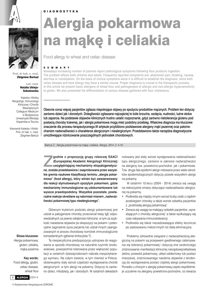 d i a g n o s t y k a Alergia pokarmowa na mąkę i celiakia Food allergy to wheat and celiac disease S U M M A R Y Prof. dr hab. n. med. Zbigniew Bartuzi Lek. med. Natalia UklejaSokołowska Katedra i Klinika Alergologii, Immunologii Klinicznej i Chorób Wewnętrznych Collegium Medicum w Bydgoszczy Uniwersytet Mikołaja Kopernika w Toruniu Kierownik Katedry i Kliniki: Prof. dr hab. n. med. Zbigniew Bartuzi Nowadays increasing number of patients report pathological symptoms following flour products ingestion. The problem affects both children and adults. Frequently reported complaints are: abdominal pain, bloating, nausea, diarrhea or constipation. On the basis of clinical symptoms alone it is difficult to establish the diagnosis, since both celiac disease and food allergy may have a similar course. Proper diagnosis is crucial in the therapeutic process. In this article we present basic allergens of wheat flour and pathogenesis of allergic and non-allergic hypersensitivity to gluten. We also presented the differentiation of various disease gathered with flour intolerance. ............................... Obecnie coraz więcej pacjentów zgłasza niepokojące objawy po spożyciu produktów mącznych. Problem ten dotyczy zarówno dzieci jak i dorosłych. Dolegliwości zgłaszane najczęściej to bóle brzucha, wzdęcia, nudności, luźne stolce lub zaparcia. Na podstawie objawów klinicznych trudno ustalić rozpoznanie, gdyż zarówno nietolerancja glutenu pod postacią choroby trzewnej, jak i alergia pokarmowa mogą mieć podobny przebieg. Właściwa diagnoza ma kluczowe znaczenie dla procesu terapeutycznego.W artykule przybliżono podstawowe alergeny mąki pszennej oraz patomechanizm nadwrażliwości o charakterze alergicznym i niealergicznym. Przedstawiono także narzędzia diagnostyczne umożliwiające różnicowanie poszczególnych jednostek chorobowych. Bartuzi Z.: Alergia pokarmowa na mąkę i celiakia. Alergia, 2014, 2: 4-10 Z godnie z propozycją grupy roboczej EAACI (Europejskiej Akademii Alergologii Klinicznej) uwzględniającej mechanizmy etiopatogenetyczne, została przedstawiona i zaaprobowana przez wszystkie gremia naukowe klasyfikacja terminu „alergia pokarmowa” (food allergy), który winien być zarezerwowany dla reakcji stymulowanych spożytym pokarmem, gdzie mechanizmy immunologiczne są udokumentowane lub wysoce prawdopodobny. Wszystkie pozostałe, powtarzalne reakcje określane są natomiast mianem „nadwrażliwości pokarmowej typu niealergicznego”. Słowa kluczowe: Alergia pokarmowa, gluten, celiakia, mąka pszenna Key words: Food allergy, gluten, celiac disease, wheat flour 4 Głównym kryterium podziału alergii pokarmowej jest udział w patogenezie choroby przeciwciał klasy IgE odpowiedzialnych za pewne odrębności kliniczne, w tym za szybkość narastania objawów po ekspozycji na pokarm i potencjalne zagrożenie życia pacjenta lub udział innych zaangażowanych w proces chorobowy komórek immunologicznie kompetentnych (głównie limfocytów T) . Ta niespecyficzna predyspozycja ustrojowa do reagowania w sposób chorobowy na naturalne czynniki środowiskowe, powszechnie tolerowana przez większość populacji w ostatnich dziesięcioleciach nabrała niespotykanego wymiaru. Na całym świecie, w tym również w Polsce, obserwujemy stały wzrost częstości występowania chorób alergicznych, w tym alergii na pokarmy. Dotyczy to zarówno dzieci, młodzieży, jak i dorosłych. W ostatnich dekadach ALERGIA 2/2014 © Wydawnictwo Alergologiczne ZDROWIE notowany jest stały wzrost występowania nadwrażliwości typu alergicznego, zarówno w zakresie nadwrażliwości na alergeny tzw. powietrzno-pochodne, jak i pokarmowe. Tzw. druga fala epidemii alergii notowana przez wiele ośrodków epidemiologicznych dotyczy przede wszystkim alergii na pokarmy. W ostatnim 10.leciu (2004 - 2014) zwraca się uwagę na niekorzystne zmiany dotyczące nadwrażliwości alergicznej na pokarmy. • Podkreśla się między innymi wzrost liczby osób z ciężkim przebiegiem choroby a także wzrost odsetka pacjentów z „przetrwałą alergią pokarmową”. • Zwraca się uwagę na malejący odsetek pacjentów „wyrastających z choroby alergicznej” a także wydłużający się czas nabywania immunotolerancji. • Podkreśla się także niezadowalające efekty lecznicze po zastosowaniu metod innych niż dieta eliminacyjna. Problemy zdrowotne związane z nadwrażliwością alergiczną na pokarm są przejawem gwałtownego załamywania się tolerancji pokarmowej i dotyczą one osobniczego zróżnicowania manifestacji klinicznej narządowej/układowej (skóra, przewód pokarmowy, układ oddechowy lub postaci mieszane), zróżnicowanego nasilenia objawów z tendencją do występowania postaci ciężkiej alergii pokarmowej. Ponadto u chorych z alergię pokarmową często współistnieje uczulenie na alergeny powietrzno-pochodne, co stwarza d i a g n o s t y k a duże prawdopodobieństwo wystąpienia krzyżowych reakcji alergicznych. Zgodnie z powszechnie akceptowanym poglądem diagnostyka alergii na pokarmy stanowi jeden z największych problemów przed jakim staje współczesna alergologia. Wynika to z faktu, że brak jest jednej, uniwersalnej metody diagnostycznej, której użycie w każdym przypadku pozwoliłoby ustalić właściwe rozpoznanie. Wśród przyczyn trudności diagnostycznych należy wymienić różnorodność spożywanych pokarmów, zmienność ich siły uczulającej (potrawy przetworzone), różne drogi przenikania pokarmu do organizmu, warunki przechowywania żywności, współistnienie nadwrażliwości na kilka składników pokarmowych, równoczesne występowanie mechanizmów immunologicznych i nieimmunologicznych czy zjawisko reakcji krzyżowych. Wszystkie te okoliczności sprawiają, że w diagnostyce alergii pokarmowej, zwłaszcza ich postaciach najcięższych do każdego chorego należy podchodzić indywidualnie, precyzyjnie i krytycznie dobierając metody diagnostycz
