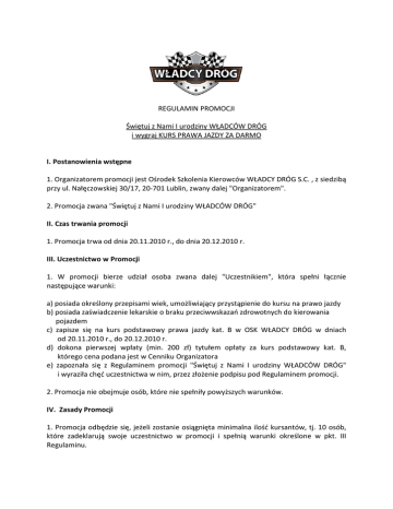 REGULAMIN PROMOCJI Świętuj z Nami I urodziny WŁADCÓW DRÓG i wygraj KURS PRAWA JAZDY ZA DARMO I. Postanowienia wstępne 1. Organizatorem promocji jest Ośrodek Szkolenia Kierowców WŁADCY DRÓG S.C. , z siedzibą przy ul. Nałęczowskiej 30/17, 20-701 Lublin, zwany dalej "Organizatorem". 2. Promocja zwana "Świętuj z Nami I urodziny WŁADCÓW DRÓG" II. Czas trwania promocji 1. Promocja trwa od dnia 20.11.2010 r., do dnia 20.12.2010 r. III. Uczestnictwo w Promocji 1. W promocji bierze udział osoba zwana dalej "Uczestnikiem", która spełni łącznie następujące warunki: a) posiada określony przepisami wiek, umożliwiający przystąpienie do kursu na prawo jazdy b) posiada zaświadczenie lekarskie o braku przeciwwskazań zdrowotnych do kierowania pojazdem c) zapisze się na kurs podstawowy prawa jazdy kat. B w OSK WŁADCY DRÓG w dniach od 20.11.2010 r., do 20.12.2010 r. d) dokona pierwszej wpłaty (min. 200 zł) tytułem opłaty za kurs podstawowy kat. B, którego cena podana jest w Cenniku Organizatora e) zapoznała się z Regulaminem promocji "Świętuj z Nami I urodziny WŁADCÓW DRÓG" i wyraziła chęć uczestnictwa w nim, przez złożenie podpisu pod Regulaminem promocji. 2. Promocja nie obejmuje osób, które nie spełniły powyższych warunków. IV. Zasady Promocji 1. Promocja odbędzie się, jeżeli zostanie osiągnięta minimalna ilość kursantów, tj. 10 osób, które zadeklarują swoje uczestnictwo w promocji i spełnią warunki określone w pkt. III Regulaminu. 2. W przypadku, kiedy liczba Uczestników będzie mniejsza niż 10 osób, promocja nie obowiązuje, chyba, że Organizator uzna inaczej. 3. W przypadku zgłoszenia się większej liczby Uczestników niż 10 osób, ilość nagród nie ulega zmianie. 3. Jednemu z Uczestników promocji, wyłonionemu na drodze losowania, który spełni warunki określone w Regulaminie, przysługuje bezpłatne uczestnictwo w kursie podstawowym na prawo jazdy kat. B. Darmowy kurs prawa jazdy stanowi nagrodę główną promocji. 4. Losowanie nagrody głównej odbędzie się dnia 20.12.2010 r., w siedzibie firmy Organizatora. 5. Uczestnik promocji wyłoniony jako zwycięzca nagrody głównej, otrzyma zwrot wniesionych do dnia losowania wpłat tytułem opłaty za kurs podstawowy prawa jazdy. 6. Uczestnik, który po podpisaniu Regulaminu promocji zrezygnuje z uczestnictwa w promocji, utraci wniesione wpłaty z tytułu opłaty za kurs podstawowy prawa jazdy. 7. Każdy Uczestnik bierze udział w losowaniu tylko raz podczas kursu, na który został zapisany. 8. Każdy Uczestnik niniejszej promocji otrzyma nagrodę pocieszenia w postaci gadżetu z logo OSK WŁADCY DRÓG. 9. Nagrody pocieszenia zostaną rozdane przed datą ukończenia kursu. 10. Promocja dotyczy wyłącznie usługi kurs podstawowy w OSK WŁADCY DRÓG. 11. Cenę kursu dla Uczestników, którzy nie wygrają nagrody głównej, określa Cennik usług OSK WŁADCY DRÓG, umieszczony na stronie internetowej Organizatora www.wladcydrog.pl. V. Postanowienia końcowe 1. Treść niniejszego Regulaminu dostępna jest w siedzibie Organizatora oraz na stronie www.wladcydrog.pl 2. Niniejszy Regulamin jest jedynym dokumentem określającym szczegółowe zasady promocji "Świętuj z Nami I urodziny WŁADCÓW DRÓG". 3. Integralną częścią Regulaminu jest aktualny Cennik usług Organizatora. WŁADCY DRÓG S.C. UL.NAŁĘCZOWSKA 30/17 20-701 LUBLIN TEL. 508 600 301 www.wladcydrog.pl
