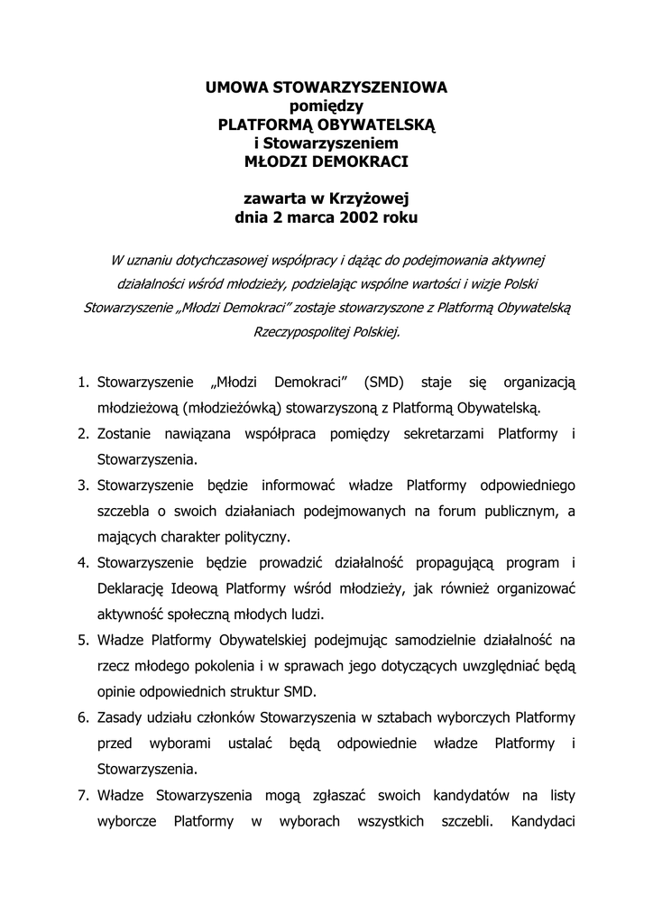 UMOWA STOWARZYSZENIOWA pomiędzy PLATFORMĄ OBYWATELSKĄ i Stowarzyszeniem MŁODZI DEMOKRACI zawarta w Krzyżowej dnia 2 marca 2002 roku W uznaniu dotychczasowej współpracy i dążąc do podejmowania aktywnej działalności wśród młodzieży, podzielając wspólne wartości i wizje Polski Stowarzyszenie „Młodzi Demokraci” zostaje stowarzyszone z Platformą Obywatelską Rzeczypospolitej Polskiej. 1. Stowarzyszenie „Młodzi Demokraci” (SMD) staje się organizacją młodzieżową (młodzieżówką) stowarzyszoną z Platformą Obywatelską. 2. Zostanie nawiązana współpraca pomiędzy sekretarzami Platformy i Stowarzyszenia. 3. Stowarzyszenie będzie informować władze Platformy odpowiedniego szczebla o swoich działaniach podejmowanych na forum publicznym, a mających charakter polityczny. 4. Stowarzyszenie będzie prowadzić działalność propagującą program i Deklarację Ideową Platformy wśród młodzieży, jak również organizować aktywność społeczną młodych ludzi. 5. Władze Platformy Obywatelskiej podejmując samodzielnie działalność na rzecz młodego pokolenia i w sprawach jego dotyczących uwzględniać będą opinie odpowiednich struktur SMD. 6. Zasady udziału członków Stowarzyszenia w sztabach wyborczych Platformy przed wyborami ustalać będą odpowiednie władze Platformy i Stowarzyszenia. 7. Władze Stowarzyszenia mogą zgłaszać swoich kandydatów na listy wyborcze Platformy w wyborach wszystkich szczebli. Kandydaci Stowarzyszenia będą traktowani na równi z innymi kandydatami zgłoszonymi na listy wyborcze Platformy. 8. Stowarzyszenie nie będzie wystawiało swoich kandydatów na innych listach wyborczych niż Platformy, ani prowadziło kampanii dla innych komitetów wyborczych niż Platforma, chyba że odpowiednie władze Platformy i Stowarzyszenia wspólnie postanowią inaczej. 9. Platforma w miarę posiadanych możliwości będzie udostępniać lokale i inne środki dla działalności Stowarzyszenia. 10. Przewodniczący SMD będzie zapraszany na posiedzenia Prezydium Klubu Parlamentarnego PO jako obserwator. 11. W przypadku zarządów regionów i powiatów oraz kół lokalnych PO przepis pkt.10 stosuje się odpowiednio. 12. Prezydium Klubu Parlamentarnego rekomenduje strukturom regionalnym i powiatowym PO wybór do rad regionalnych i powiatowych PO przewodniczących odpowiednich struktur SMD. 13. Wszelkie zmiany w niniejszej umowie będą dokonywane na drodze uzgodnień przez odpowiednie władze Platformy i Stowarzyszenia. Przewodniczący Platformy Obywatelskiej Przewodniczący Stowarzyszenia „Młodzi Demokraci” /-/ Maciej Płażyński /-/ Sławomir Nowak