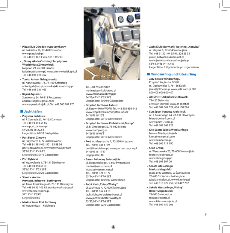 • Jacht Klub Marynarki Wojennej „Kotwica” ul. Steyera 6, 72-604 Świnoujście Tel. +48 91 321 94 35 91, 324 25 35 [email protected] www.jkmwkotwica-swinoujscie.pl 53°54,14’N 14°14,44E Liegeplätze: 25/gościnnie po uzgodnieniu • Plaża Klub Ośrodek wypoczynkowy ul. Kościelna 16, 72-420 Dziwnów www.plazaklub.pl Tel. +48 91 38 13 545, 501 139 713 • „Zimny Włodek”– Usługi Turystyczne Włodzimierz Zimnowłocki Iwięcino 29, 76-004 Sianów [email protected], www.zimnywlodek.tp1.pl Tel. +48 696 016 362 • Tonio: Antoni Gabryjałowicz ul. Narutowicza 1/3, 78-100 Kołobrzeg [email protected], www.kajaki.kolobrzeg.pl Tel. +48 608 331 463 • Kajaki Aquarius Staniewice 24, 76-113 Postomino [email protected] www.aquariuskajaki.pl, Tel. +48 500 187 770 QQ Jachthäfen • Przystań Jachtowa ul. J. Conrada 27, 76-153 Darłowo Tel. +48 94 314 51 85 www.port.darlowo.pl 54°26,4N 16°22,8’E Liegeplätze: 67/10 Gästeplätze • Port Basen Zimowy ul. Przymorze 4, 72-420 Dziwnów Tel. +48 91 3814061 501, 95 88 36 [email protected], www.dziwnow.pl/port 53°01,2’N 14°43,8’E Liegeplätze: 30/10 Gästeplätze • Port Rybacki ul. Wyzwolenia 1, 78-131 Dźwirzyno Tel. +48 94 358 6119 53°9,27’N 15°23,29’E Liegeplätze: 20/20 Gästeplätze • Stanica Wodna Przystań Jachtowa i Surfingowa ul. Janka Krasickiego 40, 78-131 Dźwirzyno Tel. +48 94 35 103 85, [email protected] www.stanica-wodna.pl 54°15’N 15°39’E Liegeplätze: 60 • Marina Solna Port Jachtowy ul. Warzelnicza 1, Kołobrzeg QQ Windsurfing und Kitesurfing Tel. +48 785 882 842 [email protected] www.marinakolobrzeg.pl 54°10,47’N 15°33,34’E Liegeplätze: 100/50 Gästeplätze • Przystań Jachtowa Łabusz ul. Ratowników WOPR, Tel. +48 503 856 442 www.wopr.koszalin/przystan-labusz 54°16’N 16°10’E Liegeplätze: 50/10 Gästeplätze • Przystań Jachtowa Klub Morski „Tramp” ul. B. Chrobrego 32, 76-032 Mielno www.tramp.org.pl 54°26’N 16°06’E Liegeplätze: 60/10 Gästeplätze • Port, ul. Marynarska 1, 72-330 Mrzeżyno Tel. +48 91 386 6119 [email protected], www.port.mrzezyno.pl 54°09’N 15°17’ E Liegeplätze: 40 • Basen Północny Świnoujście ul. Rogozińskiego 72-600 Świnoujście [email protected] www.osir.uznam.net.pl Tel. +48 91 321 91 77 53°54,48’N 14°16,28’E Liegeplätze: 300/300 Gästeplätze • Jacht Klub „Cztery Wiatry” ul. Jachtowa 4, 72-600 Świnoujście Tel. +48 91 852 43 19 [email protected] www.jachtklubczterywiatry.pl 53°55,03’N 14°16,51’E Liegeplätze: 52/0 Gästeplätze • Jot2 Szkoła Windsurfingu Przystań Żeglarska GOSiR ul. Dąbkowicka 7, 76-156 Dąbki [email protected] www.jot2.com.pl 600 800 405 600 800 407 • AR-SPORT Arkadiusz Ziółkowski 72-420 Dziwnów [email protected], www.ar-sport.pl Tel. +48 607 067 024, 604 150 274 • Sun Sport Ireneusz Aleksiejuk ul. J. Krasickiego 44, 78-131 Dźwirzyno [email protected] www.point-7.com.pl Tel. +48 608 348 825 • Kite Saints Szkoła Windsurfingu baza w Międzyzdrojach [email protected] www.saints.com.pl Tel. +48 666 111 190 • Siloe Group ul. Warszawska 20, 72-600 Świnoujście [email protected] www.siloegroup.pl Tel. +48 601 307 06 • Szkoła kitesurfingu Mariusz Magoński plaża przy Wiatraku w Świnoujściu 70-406 Szczecin – Świnoujście [email protected], www.kitefort.pl Tel. +48 516 929 959, 503 447 702 • Szkoła kitesurfingu „Viking” Robert Zapędowski 72-600 Świnoujście [email protected] www.kiteswinoujscie.pl Tel. +48 509 159 266 9