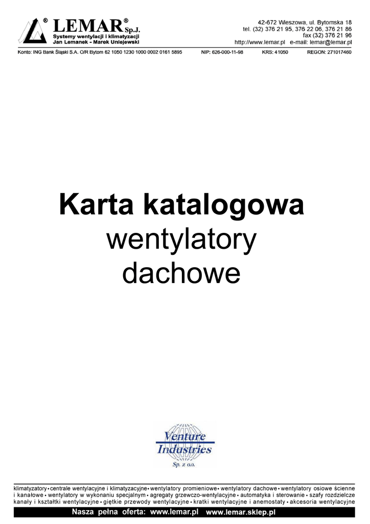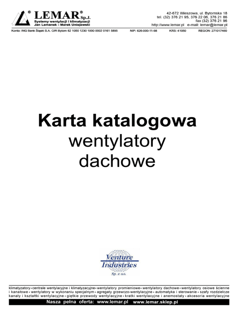 Karta katalogowa wentylatory dachowe wentylatory dachowe TH Zastosowanie Wentylacja nawiewno-wywiewna biur, sklepów, magazynów. Współpraca z kuchennymi okapami wyposażonymi w separatory tłuszczu. Konstrukcja Wentylator dachowy wywiewny lub nawiewny przeznaczony do wentylacji pomieszczeń o niskim stopniu zanieczyszczenia powietrza. Wirnik z tworzywa sztucznego (TH 500, 800) lub z blachy stalowej (TH 1300, 2000). Czasza modeli TH 500 i 800 jest wykonana z blachy stalowej, a TH 1300 i 2000 z aluminium, płyta podstawy wykonana z blachy stalowej. Metalowe elementy chronione są przed korozją farbą poliestrową. Standardowo wentylatory są montowane do pracy wyciągowej (wywiew powietrza). W celu zmiany pracy na nawiew należy moduł z wirnikiem obrócić o 180 , usunąć kierownicę i ponownie skręcić elementy wentylatora. Silnik elektryczny Wentylatory TH wyposażone są w jednofazowe silniki indukcyjne o stopniu ochrony IP 44 i klasie izolacji B. W wykonaniu standardowym silniki te przystosowane są do pracy na dwóch prędkościach obrotowych i posiadają termiczne zabezpieczenie uzwojenia przed przeciążeniem. Silniki przystosowane do napięciowej regulacji prędkości obrotowej. Schemat podłączenia elektrycznego: rys... str... Dane techniczne prędkość obrotowa wyższy niższy bieg bieg [obr./min] Typ TH-500/150 TH-500/160 TH-800 TH-800N TH-1300 TH-2000 pobór mocy max. wyższy niższy bieg bieg [W] natężenie wyższy bieg niższy bieg [A] wydajność max. wyższy niższy bieg bieg [m3/h] dopuszcz. poziom ciśnienia temp. max. akustycznego masa [oC] [dB(A)] [kg] Wywiew 2450 1800 50 45 0,23 0,18 470 355 -20 +60 50 3,8 Nawiew 2450 1800 50 45 0,23 0,18 505 380 -20 +60 45 3,8 Wywiew 2450 1800 50 45 0,23 0,18 470 355 -20 +60 50 3,8 Nawiew 2450 1800 50 45 0,23 0,18 505 380 -20 +60 45 3,8 Wywiew 2500 2100 90 75 0,4 0,31 790 630 -20 +60 50 5,6 Nawiew 2500 2050 90 75 0,4 0,31 880 695 -20 +60 48 5,6 Wywiew 2500 2100 120 118 0,52 0,5 775 620 -20 +60 53 5,6 Nawiew 2500 2000 120 118 0,52 0,5 860 695 -20 +60 52 5,6 Wywiew 2400 1800 170 120 0,83 0,52 1100 780 -40 +60 60 11,2 Nawiew 2400 1800 172 110 0,76 0,49 1150 845 -40 +60 59 11,2 Wywiew 2480 1750 255 160 1,27 0,79 1725 1200 -40 +60 67 17,2 Nawiew 2480 1800 300 190 1,27 0,79 1650 1245 -40 +60 64 17,2 nr artykułu 43520015 43520010 43520020 43520025 43520030 43520040 *poziom ciśnienia akustycznego mierzony w odległości 3m Akcesoria Podstawa dachowa RS str. 243 Podstawa dachowa RSS str. 243 Klapa zwrotna JCA str. 245 regulator REB str. 742 regulator RMB str. 742 higrostat HIG-2 str. 745 Złącze JPA str. 245 czujnik SQA str. 745 www.venture.pl Króciec JBR str. 245 termostat TS-3 str. 745 Złącze p-drg. JAE str. 245 Reb 4 - Auto Reb 5 - Auto str. 743 str. 743 termostat TK-1 str. 745 211 wentylatory dachowe TH Wymiary [mm] B C OD E OF G H I 400 349 300 150 245 10 20 274 33 33 500/160 400 349 300 160 245 10 20 274 800 400 371 300 198 245 10 20 306 36 800N 400 371 300 198 245 10 20 306 36 546 457 435 248 330 12 20 372 42 735 544 560 312 450 12 20 450 50 4x OF I G 1300 2000 OA H OA 500/150 B Typ OD E C Montaż Typ podstawa podstawa dachowa dachowa krótka 1 2 TH-500 RSS-300 TH-800 RS-300 klapa zwrotna przewód elastyczny 3 CAR-150 CAR-160 opaski zaciskowe 4 izolowany przewód elastyczny 5 VENTAL-165 VENTAL-THERM-165 SBF-215 6 RSS-300 RS-300 CAR-200 VENTAL-203 VENTAL-THERM-203 SBF-215 TH-1300 RSS-435 RS-435 CAR-250 VENTAL-254 VENTAL-THERM-254 SBF-325 TH-2000 RSS-560 RS-560 CAR-315 VENTAL-315 VENTAL-THERM-315 SBF-325 przewód w celu zapobiegnięcia bezpośredniego kontaktu klapy z wirnikiem wentylatora Charakterystyka akustyczna Aby wyliczyć poziom dźwięku dla poszczególnych częstotliwości, należy dodać odpowiedni współczynnik korekcyjny z tabeli poniżej, do wartości odczytanej z tabeli "Dane techniczne". Typ TH-500 TH-800N TH-800 TH-1300 TH-2000 A 125 -7,5 250 -3,0 Poziom ciśnienia akustycznego rozpiętość częstotliwości 500 1000 2000 9,0 6,0 11,0 4000 4,0 8000 -2,0 -3,0 B -7,5 6,0 13,5 17,5 14,5 4,5 A -7,5 3,5 8,0 9,5 14,0 9,0 0,0 B -4,0 7,5 15,0 16,0 14,5 9,0 1,5 A -7,5 3,5 8,0 9,5 14,0 9,0 0,0 B -4,0 7,5 15,0 16,0 14,5 9,0 1,5 A -13.5 0,0 1 12,0 9,0 4,0 0,0 B -11,0 5,5 11,5 17,5 15,0 7,0 -0,5 A -21,5 -7,0 -3,0 7,0 5,5 -2,0 -8,5 B -16,5 2,5 7,0 20,0 7,5 1,0 -8,0 211 Venture Industries Sp. z o.o. ul. Mokra 27, 05-092 Łomianki - Kiełpin tel. +48 22 751 95 50, 751 20 31 fax +48 22 751 22 59, 751 12 02 e-mail: [email protected] wentylatory dachowe TH Charakterystyki pracy - wywiew Q - wydajnośc w m3/h i m3/s P - ciśnienie statyczne w mmH2O i Pa Suche powietrze w 20oC i 760 mmHg charakterystyki wyznaczone wg norm: ISO 5801 i AMCA 210-99 TH-500/150, TH-500/160 HS - wyższa prędkość LS - niższa prędkość [m3/h] [m3/s] TH-800 N TH-800 [m3/h] [m3/h] 3 [m3/s] [m /s] TH-1300 www.venture.pl TH-2000 [m3/h] [m3/h] [m3/s] [m3/s] 212 wentylatory dachowe TH Charakterystyki pracy - nawiew Q - wydajnośc w m3/h i m3/s P - ciśnienie statyczne w mmH2O i Pa Suche powietrze w 20oC i 760 mmHg charakterystyki wyznaczone wg norm: ISO 5801 i AMCA 210-99 TH-500/160 HS - wyższa prędkość LS - niższa prędkość [m3/h] [m3/s] TH-800 N TH-800 [m3/h] [m3/h] 3 [m3/s] [m /s] TH-1300 TH-2000 [m3/h] [m3/h] 3 [m3/s] [m /s] 214 Venture Industries Sp. z o.o. ul. Mokra 27, 05-092 Łomianki - Kiełpin tel. +48 22 751 95 50, 751 20 31 fax +48 22 751 22 59, 751 12 02 e-mail: [email protected]
