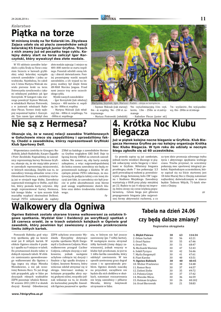 11 24-26.06.2014 r. .RODUVWZR 3LÇWNDQDWRU]H :PLQLRQÇĝURGÛQD7RU.RODUVNLLP=E\VĄDZD =DMÇFDXGDĄRVLÛDľSLÛFLX]DZRGQLNµZVHNFML NRODUVNLHM.6(QHUJHW\N-XQLRU*U\ቺQR7U]HFK ]QLFK]QDP\MXľRGSRF]ÇWNXWHJRF\NOX.ROHMQ\ GREU\ VWDUW QD WRU]H ]DOLF]\Ą ,JRU .RUF]\ĆVNLNWµU\Z\ZDOF]\ĄGZD]ĄRWHPHGDOH Ï × c ϐÑ ¦Ï × Ǥ Ïǡ ͷ Ï Ǥ ÏĂ Ï ÑǤĂ Ï ǡ Ï ǡ Ï Ï Ǥ ä Ï ¸ Ǥ ÑǤ Ï Ï¦ ͳ ͶͲͲͺͲͲ××Ǥ ¦ ¸ ä Ǥ Ă ×ǡ ¸ Ă Ï ¸ ϐ Ǧ Ǥ Ñ Ǥ ×ǣ Ǧ ÑȋĂÏȌ ͳ Ȃ ͶͲͲ × Ǥ ×ǡͳǦͺͲͲǤ× Ǧ ȋĂ ÏȌǦͶͲͲǤ×ǡ ǦͺͲͲǤ× 1LHVÇ]+HUPHVD" 0DUW\QND6]\PHN,JRU0DULXV]L5DGHN૱HNLSDZNRPSOHFLH Ǧ ȋĂ Ȍ ͺǦǤ×ǡͻǦʹͷͲǤ Ǧ ȋÏȌ ͻǦäǤ ǡͳͳǦäǤ ǡ ͳ͵ Ǧ ʹͷͲ Ǥ Ǧ Ï ȋ ÏǤȌ ǦäǤǡͺǦäǤǡͺǦʹͲͲǤ .UµWND1RF.OXEX %LHJDF]D 2ND]XMH VLÛ ľH Z QDV]HM UHODFML ]DZRGµZ 7ULDWKORQRZ\FK Z*RĄXFKRZLHQLHFRVLÛ]DSÛG]LOLĝP\LXSU]HG]LOLĝP\IDNW\&KRG]LR]DZRGQLNµZNWµU]\UHSUH]HQWRZDOL*U\ቺĆVNL -XľZSLÇWHNNROHMQHQRFQHELHJDQLHZ*U\ቺQLH.OXE%LHJDF]D+HUPHVD*U\ቺQRSRUD]NROHMQ\RUJDQL]XMH.UµWNÇ .OXE6SRUWRZ\'HOI 1RF .OXEX %LHJDF]D : W\P URNX GR XG]LDĄ\ Z QRFQ\P × - ʹͷͲÏĂ×- ELHJX]JĄRVLĄRVLÛDľXF]HVWQLNµZ ÑǡÑǡ Ï ÑǤäǡĂ ¦ ϐǡ¸ǡæ ¦ ä ǡ × ¦Ǥ Ï ǡ Ă ¦ǡצ Ă Ǥ ×ϐǡ ǡ × Ǥ © ǡ Ï Ï © Ǥ ¦ ¦Ï Ï ϐ ¸ Ǥ Ϧ ¦¸ͳͲͲͲÏ ×Ǥ ¸ǡ Ï ǡ ¸ Ñ ¸¦ Ă ×Ǥ ϐ ä ǡ Ă ¦¸ ǡĂ Ï Ï ¸ ×Ï × × ä Ǥ :DONRZHU\GOD2JQLZD ¦ Ă ¸ǡ © ¦ ϐǤ Ïä ¦ Ï ¦ ͵ǡͷ ¸¦ ÏǤǡ ¦ ¦ Ï Ǥ ¦ Ă ʹʹǤ¸ĂͶ ǡ× ¸ ¸¦ä ¦Ǥ Ï× ä ǡ 2JQLZR%DELQHN]RVWDĄRXNDUDQHWU]HPDZDONRZHUDPL]DRVWDWQLHOLJRZH VSRWNDQLD :\G]LDĄ *LHU L (ZLGHQFML SR ZHU\ቺNDFML VSRWNDĆ ] F]HUZFD RU]HNĄ ľH Z WU]HFK RVWDWQLFK NROHMNDFK Z 2JQLZLH JUDĄ ]DZRGQLN NWµU\ SRZLQLHQ E\É ]DZLHV]RQ\ ] SRZRGX SU]HNURF]HQLD OLPLWXľµĄW\FKNDUWHN Ï ¸ ǡ Ï Ă ͺ Ă×Ï Ǥ ÏͶÏͻ Ǥ ÑÏĂ Ǥ ¦ Ă ¸ ǡ ä ǤĂ ǡ ×Ă Ï× Ïä Ǥ ʹͲͳͳȀʹͲͳ͵ Ï ZZZGQLJU\¿QDD]SO Ï ¦ ä ä Ǥ Ï ǡ ¸ ¸ǡ ¸ ¸ ϐ Ï Ă ǡ ǡ × × ÏÏ©¸ ¸Ǥ ¦ ©ǡ ǡ Ă Ï ÏǤÏ- ǡ × Ï ȋĂ×Ï ȌǤ ¸ Ï Ă×Ï ȋ× ¦ Ȍǡ ǡĂ ͳĂ×Ïǡ× ÏĂÏ Ǥ × Ï Ï Ǥ Ï ¸ Ïä©ǡ ¸ä ¸ ǡ ¦ Ï ǡ × ä¸ Ǥ Ă ¸ Ǥ ©ǡ Ă ¦ ÑǤÏ ǡ× Ï ¸ ä ͳͺǦ ǡ ä ¸ × ǡ ͳǦ ×ĂǤ pp 7DEHODQDG]LHĆ F]\EÛGÇGDOV]H]PLDQ\" 5HJLRQDOQDRNUÛJµZND ͳǤϸ ʹǤ Ñ ͵Ǥϸ 4.ÏǤ ͷǤ 6.×Ï 7.ää ͺǤ ͻǤ ͳͲǤ 11. 12. ͳ͵Ǥ Ă ͳͶǤǤ ͳͷǤ ͳǤÏ ͵Ͳ ͵Ͳ ͵Ͳ ͵Ͳ ͵Ͳ ͵Ͳ ͵Ͳ ͵Ͳ ͵Ͳ ͵Ͳ ͵Ͳ ͵Ͳ ͵Ͳ ͵Ͳ ͵Ͳ ͵Ͳ ͵ ͷ ͷͷ ͷͳ Ͷ Ͷʹ Ͷͳ ͶͲ ͶͲ ͵ͺ ͵ ͵ͷ ͵ ͵ ʹ ʹͳ ͳͳͶǣ͵Ͷ Ͷʹǣʹͳ ǣͶ ͺǣͶ ͷʹǣͶ͵ ͷǣͶ Ͷǣͳ Ͷ͵ǣͷͳ ͶͲǣͶͷ ͷͶǣͶͺ ͶͶǣͷ Ͷͻǣʹ ͵ǣͶʹ Ͷǣͷͻ ͶͲǣͳͲʹ ͷͺǣͺ͵