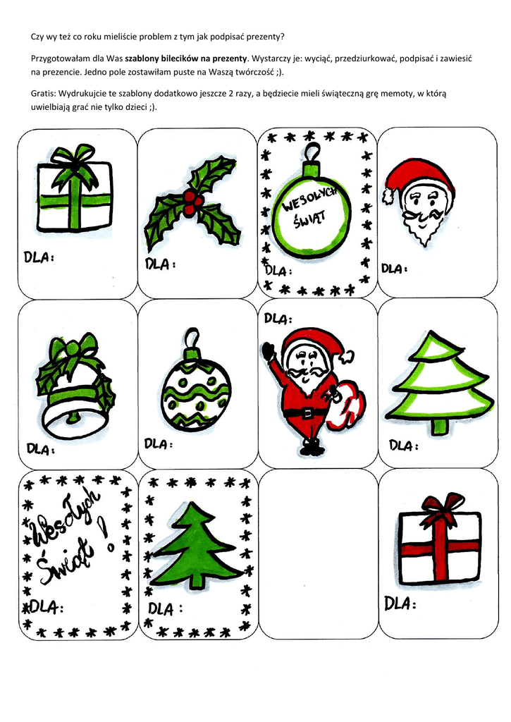 Czy wy też co roku mieliście problem z tym jak podpisad prezenty? Przygotowałam dla Was szablony bilecików na prezenty. Wystarczy je: wyciąd, przedziurkowad, podpisad i zawiesid na prezencie. Jedno pole zostawiłam puste na Waszą twórczośd ;). Gratis: Wydrukujcie te szablony dodatkowo jeszcze 2 razy, a będziecie mieli świąteczną grę memoty, w którą uwielbiają grad nie tylko dzieci ;).