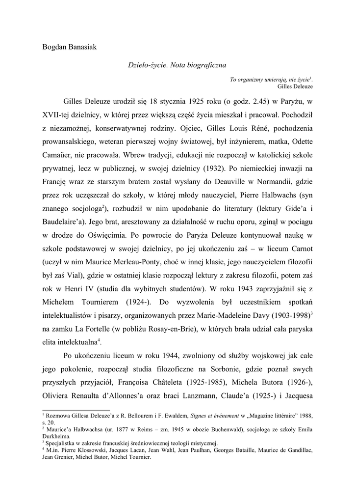 Bogdan Banasiak Dzieło-życie. Nota biograficzna To organizmy umierają, nie życie1. Gilles Deleuze Gilles Deleuze urodził się 18 stycznia 1925 roku (o godz. 2.45) w Paryżu, w XVII-tej dzielnicy, w której przez większą część życia mieszkał i pracował. Pochodził z niezamożnej, konserwatywnej rodziny. Ojciec, Gilles Louis Réné, pochodzenia prowansalskiego, weteran pierwszej wojny światowej, był inżynierem, matka, Odette Camaüer, nie pracowała. Wbrew tradycji, edukacji nie rozpoczął w katolickiej szkole prywatnej, lecz w publicznej, w swojej dzielnicy (1932). Po niemieckiej inwazji na Francję wraz ze starszym bratem został wysłany do Deauville w Normandii, gdzie przez rok uczęszczał do szkoły, w której młody nauczyciel, Pierre Halbwachs (syn znanego socjologa2), rozbudził w nim upodobanie do literatury (lektury Gide’a i Baudelaire’a). Jego brat, aresztowany za działalność w ruchu oporu, zginął w pociągu w drodze do Oświęcimia. Po powrocie do Paryża Deleuze kontynuował naukę w szkole podstawowej w swojej dzielnicy, po jej ukończeniu zaś – w liceum Carnot (uczył w nim Maurice Merleau-Ponty, choć w innej klasie, jego nauczycielem filozofii był zaś Vial), gdzie w ostatniej klasie rozpoczął lektury z zakresu filozofii, potem zaś rok w Henri IV (studia dla wybitnych studentów). W roku 1943 zaprzyjaźnił się z Michelem Tournierem (1924-). Do wyzwolenia był uczestnikiem spotkań intelektualistów i pisarzy, organizowanych przez Marie-Madeleine Davy (1903-1998)3 na zamku La Fortelle (w pobliżu Rosay-en-Brie), w których brała udział cała paryska elita intelektualna4. Po ukończeniu liceum w roku 1944, zwolniony od służby wojskowej jak całe jego pokolenie, rozpoczął studia filozoficzne na Sorbonie, gdzie poznał swych przyszłych przyjaciół, Françoisa Châteleta (1925-1985), Michela Butora (1926-), Oliviera Renaulta d’Allonnes’a oraz braci Lanzmann, Claude’a (1925-) i Jacquesa 1 Rozmowa Gillesa Deleuze’a z R. Bellourem i F. Ewaldem, Signes et événement w „Magazine littéraire” 1988, s. 20. 2 Maurice’a Halbwachsa (ur. 1877 w Reims – zm. 1945 w obozie Buchenwald), socjologa ze szkoły Emila Durkheima. 3 Specjalistka w zakresie francuskiej średniowiecznej teologii mistycznej. 4 M.in. Pierre Klossowski, Jacques Lacan, Jean Wahl, Jean Paulhan, Georges Bataille, Maurice de Gandillac, Jean Grenier, Michel Butor, Michel Tournier. (1927-2006), uczęszczał zaś głównie na wykłady Ferdinanda Alquié (1906-1985), Jeana Hippolyte’a (1907-1968), Maurice’a de Gandillaca (1906-2006) i Georgesa Canguilhema (1904-1995), z którymi także zachował więzy przyjaźni5. W roku 1947, po napisaniu pod kierunkiem Hippolyte’a i Canguilhema pracy Empirisme et subjectivité. Essai sur la nature humaine selon Hume, opublikowanej w roku 1953, otrzymał dyplom ukończenia studiów wyższych, a w roku kolejnym – agregację. W tym też okresie zetknął się z Jeanem-Paulem Sartre’em, ogromnie przezeń podziwianym6. W latach 1948-1952 wykładał filozofię w liceum w Amiens, w latach 1953-1955 – w liceum Pothier w Orléans, a następnie w słynnym kolegium Louis-leGrand w Paryżu (1955-1957). W sierpniu 1956 roku zawarł związek małżeński z „Fanny” Denise Paule Grandjouan (tłumaczką na francuski Apocalypse D. H. Lawrence’a, 1978, pracującą w domu mody Balmain), z którą będzie miał dwoje dzieci: Juliena (ur. 1960; tłumacz z języka angielskiego) i Emilie (ur. 1964; reżyser filmowy). W latach 1957-1960 był asystentem na Sorbonie, na kierunku historia filozofii, w latach 1960-1964 pracował w Centre national de la recherche scientifique (CNRS). W roku 1962, po dłuższym okresie milczenia7, opublikował książkę Nietzsche et la philosophie, a w kolejnych latach następne prace z zakresu historii filozofii (o Nietzschem, Kancie, Bergsonie, Spinozie) oraz o literaturze (Proust, Sacher-Masoch). Także w roku 1962 u Julesa Vuillemina (1920-2001) w ClermontFerrand spotkał Michela Foucaulta (1926-1984) – który chciał go sprowadzić na tamtejszy uniwersytet, choć bezskutecznie – co zaowocowało ich długotrwałą przyjaźnią oraz ogromnym wzajemnym uznaniem8. Wraz z nim napisał krótkie Introduction générale9 do Œuvres philosophiques complètes Nietzschego (1967), początkujące francuski przekład klasycznego wydania dzieł Nietzschego pod red. 5 „Ukształtowali mnie dwaj profesorowie, których lubiłem i bardzo podziwiałem, Alquié i Hyppolite”, G. Deleuze, Dialogues (avec C. Parnet), Flammarion, Paris 1977, s. 18. 6 Po wyzwoleniu „na szczęście był Sartre”. […] „Sartre to było […] trochę świeżego powietrza”, ibidem, s. 18. 7 Nazwie on ten okres „ośmioletnią dziurą”, G. Deleuze, Pourparlers 1972-1990, Minuit, Paris 1990, s. 189; opublikował w tym czasie tylko dwa artykuły. 8 Deleuze uważał Foucaulta za „największego współczesnego myśliciela” (ibidem, s. 139), a Foucault Deleuze’a – za „jedyny filozoficzny umysł we Francji” (D. Eribon, Michel Foucault, Paris 1989, s. 278), i zapowiadał, że „nadejdzie wiek deleuzjański” (M. Foucault, Theatrum philosophicum, „Critique” 1970, nr 282, s. 885), na co Deleuze odparł: „chciał on niewątpliwie powiedzieć, że byłem najbardziej niewinny, że w największym stopniu byłem filozofem”. 9 Przekład polski: http://nietzsche.ph-f.org/pl/teksty oraz http://bb.ph-f.org/?id=5 Colliego i Montinariego, które wspólnie przygotowywali (po śmierci Foucaulta z Deleuze’em współpracował de Gandillac). W roku 1964 współorganizował w opactwie Royaumont nieopodal Paryża VII międzynarodowe kolokwium filozoficzne poświęcone Nietzschemu, rozpoczął też trwającą pięć lat pracę na uniwersytecie w Lyonie. W roku 1968 obronił państwową pracę doktorską (Différence et répétition jako teza główna, pod kierunkiem de Gandillaca, oraz Spinoza et le problème de l’expression – teza uzu