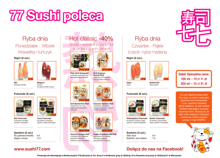 77 Sushi poleca Ryba dnia Hot classic -40% Ryba dnia Poniedzia³ek - Wtorek Krewetka i tuñczyk Środa – wybrane pozycje hot w promocyjnych cenach Czwartek - Pi¹tek £osoś i ryba maślana Nigiri (2 szt.) Nigiri (2 szt.) 21 zł 12 zł Futo Grill Kabayaki 7 zł 9 zł 6x futomaki z grillowanym łososiem polane sosem kabayaki 27 zł 16 zł Grill Salmon Surimi Roll 4x grillowany roll z łososiem oraz paluszkiem krabowym 7 zł 5 zł Ebi Maguro Sake Butterfish Gotowana krewetka Tuńczyk do wyboru również na ostro Łosoś Ryba maślana Futomaki (6 szt.) Futomaki (6 szt.) 27 zł 16 zł 11 zł 27 zł 16 zł Grill Butterfish Roll Vulcano Salmon Roll 4x grillowany roll z rybą maślaną oraz paluszkiem krabowym 4x grillowany roll z łososiem, paluszkiem krabowym, melonem i serkiem philadelphia 13 zł 11 zł 9 zł Ebi Futomaki Tuna Futomaki Philadelphia Futomaki Butter Futomaki 6x futomaki z krewetką, awokado i dressingiem 6x futomaki z tuńczykiem, ogórkiem, sałatą i dressingiem 6x futomaki z łososiem, sałatą, ogórkiem i serkiem philadelphia 6x futomaki z rybą maślaną, sałatą, ogórkiem i dressingiem 29 zł 17 zł Sashimi (3 szt.) Ebi, gotowana krewetka Maguro, tuńczyk 9 zł 11 zł www.sushi77.com Sake! Specjalna cena: 100 ml – 19 zł 11 zł 250 ml – 35 zł 21 zł Do sushi idealnie pasuje sake! Czy wiesz, że sake to tradycyjne japońskie wino produkowane z ryżu. Japońscy naukowcy odkryli niedawno, że sake zawiera składniki wpływające na proces zapamiętywania. Okazuję się, że sake może zwiększyć możliwości uczenia się a także poprawia pamięć. A więc KAMPAI! 29 zł 17 zł Vulcano Anago Roll Fusion Cranberry Ebi Roll 4x grillowany roll z węgorzem, paluszkiem krabowym, melonem i serkiem philadelphia 4x grillowany roll z krewetką, mozzarellą, węgorzem oraz paluszkiem krabowym Sashimi (3 szt.) Sake, łosoś Butterfish, ryba maślana 9 zł 7 zł Dołącz do nas na Facebook! Promocja nie obowiązuje w Restauracjach 77Sushi przy ul. Św. Anny 5 w Krakowie, przy ul. Woźnej 10 w Poznaniu oraz przy ul. Żelaznej 41 w Warszawie.