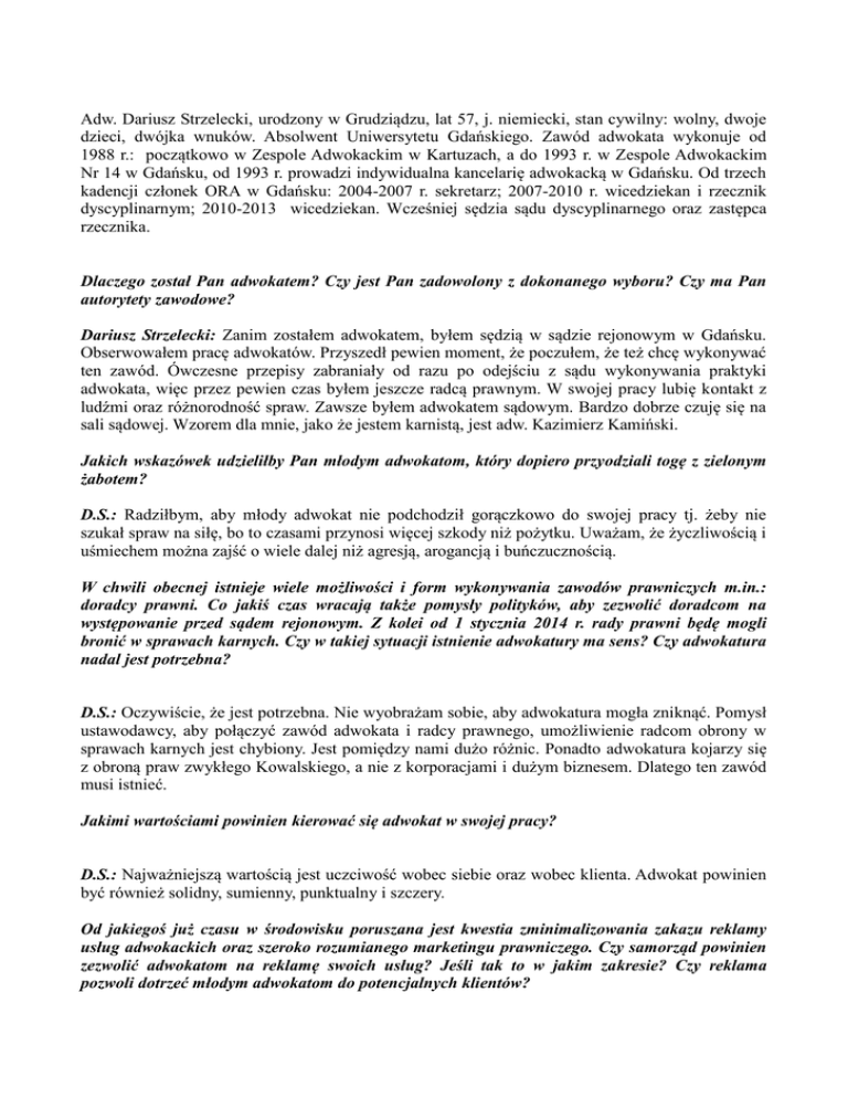 Adw. Dariusz Strzelecki, urodzony w Grudziądzu, lat 57, j. niemiecki, stan cywilny: wolny, dwoje dzieci, dwójka wnuków. Absolwent Uniwersytetu Gdańskiego. Zawód adwokata wykonuje od 1988 r.: początkowo w Zespole Adwokackim w Kartuzach, a do 1993 r. w Zespole Adwokackim Nr 14 w Gdańsku, od 1993 r. prowadzi indywidualna kancelarię adwokacką w Gdańsku. Od trzech kadencji członek ORA w Gdańsku: 2004-2007 r. sekretarz; 2007-2010 r. wicedziekan i rzecznik dyscyplinarnym; 2010-2013 wicedziekan. Wcześniej sędzia sądu dyscyplinarnego oraz zastępca rzecznika. Dlaczego został Pan adwokatem? Czy jest Pan zadowolony z dokonanego wyboru? Czy ma Pan autorytety zawodowe? Dariusz Strzelecki: Zanim zostałem adwokatem, byłem sędzią w sądzie rejonowym w Gdańsku. Obserwowałem pracę adwokatów. Przyszedł pewien moment, że poczułem, że też chcę wykonywać ten zawód. Ówczesne przepisy zabraniały od razu po odejściu z sądu wykonywania praktyki adwokata, więc przez pewien czas byłem jeszcze radcą prawnym. W swojej pracy lubię kontakt z ludźmi oraz różnorodność spraw. Zawsze byłem adwokatem sądowym. Bardzo dobrze czuję się na sali sądowej. Wzorem dla mnie, jako że jestem karnistą, jest adw. Kazimierz Kamiński. Jakich wskazówek udzieliłby Pan młodym adwokatom, który dopiero przyodziali togę z zielonym żabotem? D.S.: Radziłbym, aby młody adwokat nie podchodził gorączkowo do swojej pracy tj. żeby nie szukał spraw na siłę, bo to czasami przynosi więcej szkody niż pożytku. Uważam, że życzliwością i uśmiechem można zajść o wiele dalej niż agresją, arogancją i buńczucznością. W chwili obecnej istnieje wiele możliwości i form wykonywania zawodów prawniczych m.in.: doradcy prawni. Co jakiś czas wracają także pomysły polityków, aby zezwolić doradcom na występowanie przed sądem rejonowym. Z kolei od 1 stycznia 2014 r. rady prawni będę mogli bronić w sprawach karnych. Czy w takiej sytuacji istnienie adwokatury ma sens? Czy adwokatura nadal jest potrzebna? D.S.: Oczywiście, że jest potrzebna. Nie wyobrażam sobie, aby adwokatura mogła zniknąć. Pomysł ustawodawcy, aby połączyć zawód adwokata i radcy prawnego, umożliwienie radcom obrony w sprawach karnych jest chybiony. Jest pomiędzy nami dużo różnic. Ponadto adwokatura kojarzy się z obroną praw zwykłego Kowalskiego, a nie z korporacjami i dużym biznesem. Dlatego ten zawód musi istnieć. Jakimi wartościami powinien kierować się adwokat w swojej pracy? D.S.: Najważniejszą wartością jest uczciwość wobec siebie oraz wobec klienta. Adwokat powinien być również solidny, sumienny, punktualny i szczery. Od jakiegoś już czasu w środowisku poruszana jest kwestia zminimalizowania zakazu reklamy usług adwokackich oraz szeroko rozumianego marketingu prawniczego. Czy samorząd powinien zezwolić adwokatom na reklamę swoich usług? Jeśli tak to w jakim zakresie? Czy reklama pozwoli dotrzeć młodym adwokatom do potencjalnych klientów? D.S.: Swoje usługi należy reklamować, jednak z uwagi na powagę naszego zawodu, powinna ona być w jakiś granicach. Nie wyobrażam sobie, aby adwokat reklamował się na bilbordach albo wykupywał całe strony w gazetach. Powinny być ustalone jednolite i jasne zasady reklamy. W ubiegłym roku podczas Zgromadzenia Izbowego była mowa o planowanej kampanii reklamowej adwokatury jako takiej, w mediach m.in. adwokaci na bilbordach zachęcający społeczeństwo do korzystania z ich usług. Władze samorządu zrezygnowały z takiego posunięcia. Na wiosnę swoją kampanię rozpoczęli radcy prawni pt: Z radcą prawnym bezpieczniej. Jak w tej sytuacji widzi Pan możliwość stworzenia wizerunku adwokatury? D.S.: Po głowie chodzi mi pomysł, aby stworzyć na szczeblu ogólnopolskim gazetę, która stałaby się miejscem wymiany zdań, poglądów czy pomysłów. Wprawdzie jest Palestra, ale ona służy bardziej publicystyce naukowej. Mamy również gazetki izbowe, jak np. nasz Kwartalnik Adwokacki. Jednak ich zasięg zarówno miejscowy, jak i czasowy jest ograniczony. Potrzebujemy czegoś bardziej widocznego. To się oczywiście wiąże z kosztami, ale taką gazetkę można by sprzedawać czy udostępniać w kioskach czy w empiku. W ten sposób dotarlibyśmy do społeczeństwa. Adwokaci są raczej niewidoczni. Oczywiście oprócz Ryszarda Kalisz, który jest adwokatem nie wykonujacym zawodu. Innych adwokatów widzimy przy okazji jakiejś głośnej sprawy medialnej, gdzie pytania dziennikarzy dotyczą tylko tej konkretnej sprawy, a nie problemów adwokatury. Z kolei na szczeblu lokalnym nasza izba promuje adwokaturę poprzez udzielanie porad pro bono przez aplikantów dwa razy w miesiącu, oraz udział w ogólnopolskim dniu bezpłatnych porad prawnych i tygodniu pomocy ofiarom przestępstw. Również adwokaci, którzy są politykami, samorządowcami czy biznesmenami promują adwokaturę. Ministerstwo Sprawiedliwości ostatnio obniżyło stawki adwokackie m.in. za prowadzenie sprawy o uznanie wzorca umowy za niedozwolony. Urzędnicy zapowiadają kolejne cięcia w kolejnych rodzajach spraw. Czy możemy jakoś temu przeciwdziałać? D.S.: To jest zadanie dla NRA, która powinna przeciwdziałać takim praktykom, a nawet działać na rzecz podwyższenia tych stawek. Stawki są zdecydowanie za niskie, a normuje je rozporządzenie sprzed 11 lat, kiedy wartość pieniądza była także inna. Coraz częściej adwokaci wypowiadają się w mediach, komentują nagłośnione sprawy w programach publicystycznych, piszą artykuły. Taka działalność adwokatów ma wpływ na kreowanie wizerunku adwokata. A jak wygląda komunikacja adwokatów wewnątrz samorządu? D.S.: Z dużą przyjemnością czytam Palestrę. Przestawia ona poglądy adwokatury. Publikuje w niej wielu znakomitych specjalistów. Myślę, że taką formą komunikacji mogłaby być gazeta ogólnopolska, która wychodziłaby częściej, a przez to zajmowałaby się bieżącymi prob