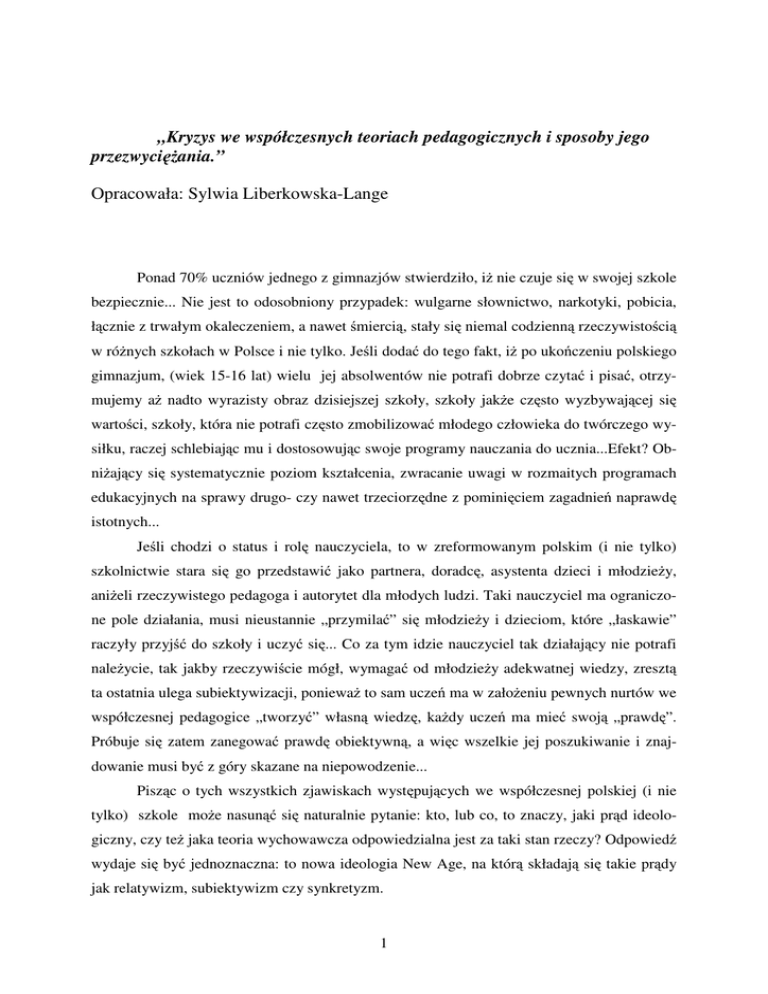 „Kryzys we współczesnych teoriach pedagogicznych i sposoby jego przezwyci ania.” Opracowała: Sylwia Liberkowska-Lange Ponad 70% uczniów jednego z gimnazjów stwierdziło, i nie czuje si w swojej szkole bezpiecznie... Nie jest to odosobniony przypadek: wulgarne słownictwo, narkotyki, pobicia, ł cznie z trwałym okaleczeniem, a nawet mierci , stały si niemal codzienn rzeczywisto ci w ró nych szkołach w Polsce i nie tylko. Je li doda do tego fakt, i po uko czeniu polskiego gimnazjum, (wiek 15-16 lat) wielu jej absolwentów nie potrafi dobrze czyta i pisa , otrzymujemy a nadto wyrazisty obraz dzisiejszej szkoły, szkoły jak e cz sto wyzbywaj cej si warto ci, szkoły, która nie potrafi cz sto zmobilizowa młodego człowieka do twórczego wysiłku, raczej schlebiaj c mu i dostosowuj c swoje programy nauczania do ucznia...Efekt? Obni aj cy si systematycznie poziom kształcenia, zwracanie uwagi w rozmaitych programach edukacyjnych na sprawy drugo- czy nawet trzeciorz dne z pomini ciem zagadnie naprawd istotnych... Je li chodzi o status i rol nauczyciela, to w zreformowanym polskim (i nie tylko) szkolnictwie stara si go przedstawi jako partnera, doradc , asystenta dzieci i młodzie y, ani eli rzeczywistego pedagoga i autorytet dla młodych ludzi. Taki nauczyciel ma ograniczone pole działania, musi nieustannie „przymila ” si młodzie y i dzieciom, które „łaskawie” raczyły przyj do szkoły i uczy si ... Co za tym idzie nauczyciel tak działaj cy nie potrafi nale ycie, tak jakby rzeczywi cie mógł, wymaga od młodzie y adekwatnej wiedzy, zreszt ta ostatnia ulega subiektywizacji, poniewa to sam ucze ma w zało eniu pewnych nurtów we współczesnej pedagogice „tworzy ” własn wiedz , ka dy ucze ma mie swoj „prawd ”. Próbuje si zatem zanegowa prawd obiektywn , a wi c wszelkie jej poszukiwanie i znajdowanie musi by z góry skazane na niepowodzenie... Pisz c o tych wszystkich zjawiskach wyst puj cych we współczesnej polskiej (i nie tylko) szkole mo e nasun si naturalnie pytanie: kto, lub co, to znaczy, jaki pr d ideolo- giczny, czy te jaka teoria wychowawcza odpowiedzialna jest za taki stan rzeczy? Odpowied wydaje si by jednoznaczna: to nowa ideologia New Age, na któr składaj si takie pr dy jak relatywizm, subiektywizm czy synkretyzm. 1 Na czym polegaj owe zało enia ideologiczne, które przed chwil wymieniłam, a które maj tak negatywny wpływ na rozwój osobowo ci młodego człowieka? Owe szkodliwe zało enia bardzo dokładnie opisał nie yj cy ju Ojciec wi ty Jan Paweł II w swoich encyklikach i listach apostolskich, m. in. w encyklice „Fides et Ratio”, wynikaj one równie z dokumentów Stolicy Apostolskiej m.in. dokumentu pt. „Jezus-dawca wody ycia”- o chrzecija skiej alternatywie dla ideologii New Age. Równie w ksi ce p. redakcj J. Gniteckiego pt. „Teorie pedagogiczne wobec zmian w humanistyce i w otaczaj cym wiecie” znajdziemy ich szczegółowy opis. Otó ju w artykule R. Pachoci skiego pt.: „Model o wiaty społecze stwa informacyjnego” znajdziemy nast puj ce stwierdzenia: „Cywilizacja informacyjna tworzy zapotrzebowanie na nowy model o wiaty radykalnie zrywaj cy z dotychczasow praktyk szkoln ”. W dalszej cz ci artykułu dowiadujemy si , na czym ów „nowy model o wiaty” miałby polega . Tak jak to ju wspomniałam na wst pie, to ucze sam miałby „interpretowa zjawiska i uzewn trznia ich rozumienie”, celem jednostki byłoby zatem „konstruowanie własnego znaczenia” zdobywanej wiedzy, innymi słowy nie mo na byłoby umieszcza wiedzy w umysłach uczniów, powinni oni sami j na własny u ytek „konstruowa ”. Co si kryje pod tak sformułowanymi tezami nowego modelu o wiaty społecze stwa informacyjnego? Z takich zało e wynika skrajny subiektywizm i relatywizm poznawczy, to znaczy podwa enie samego istnienia obiektywnej prawdy, skoro ka dy ucze , tylko na podstawie podanej mu wiedzy potrafi sam konstruowa znaczenia i nie tyle przyswaja sobie obiektywn wiedz , co j „tworzy ”. Oto wi c młody umysł, nie zapoznany jeszcze z wzorcami klasycznej wiedzy i nauki, co mu si w oczywisty sposób nale y, (nawet najwi ksi arty ci malarze, rze biarze czy pisarze musieli najpierw pozna wzorce klasyczne tworz ce zr by dziedzin ich twórczo ci zanim wreszcie stworzyli co nowego i oryginalnego we własnych dziedzinach twórczo ci) oto taki ucze ma ju od razu sam „tworzy ” wiedz na własny u ytek, ma tworzy własn „prawd ”... Takie uj cie modelu o wiaty przez pr d zwany dalej w ww. artykule konstruktywizmem wiedzie do kryzysu etycznego, kryzysu warto ci moralnych, kryzysu najwi kszych warto ci duchowych wypracowanych na przestrzeni dziejów, jak pisze kolejny felietonista A. Szyszko-Bohusz w swoim eseju pt:„Pedagogika holistyczna w okresie przemian współczesnej humanistyki”. Je li obiektywna prawda nie istnieje, ka dy ma swoja „prawd ”, zatem mo na, wr cz nale y interpretowa podawan wiedz wybiórczo, na zasadzie podró y po sklepie samoobsługowym i wrzucania do koszyka, tego co si tylko podoba, według uznania... Mo na zatem traktowa wybiórczo dekalog- owoc cywilizacji judeo-chrze cijanskiej, mo na szanowa przykazanie „nie kradnij”, ale ju nie koniecznie ”nie zabijaj” a tym bardziej 2 „nie cudzołó ”. Mo na podziwia raj opisywany przez Dantego w jego „Boskiej Komedii”, ale nie przejmowa si opisywanym przez tego samego artyst piekłem... Mo na zachwyca si freskami Michała Anioła pokazuj cymi stworzenie człowieka, ale dlaczego bra sobie do serca obrazów Hieronima Boscha na temat S du Ostatecznego... itp... Je eli wi c „wszystko jest wzgl dne” jak twierdz ró nej ma ci relatywi ci i kapłani tzw.„Nowej Ery” „New Age” notabene b d cego star , odgrzewan herezj , to owocem takiego my lenia jest swoi cie pojmowana hedonistyczna wolno i moralno : „dobre jest to, co jest dla mnie przyjemne”, nie ma obiektywnego dobra, analogicznie: moje ycie jest wolne, a wi c w imi tej wolno ci, któr mnie ob