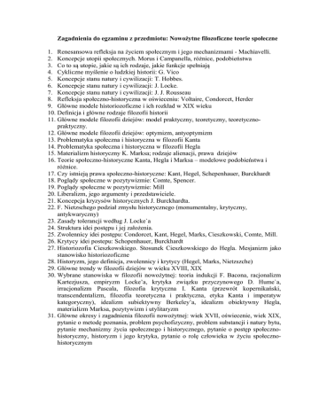 Zagadnienia do egzaminu z przedmiotu: Nowożytne filozoficzne teorie społeczne 1. Renesansowa refleksja na życiem społecznym i jego mechanizmami - Machiavelli. 2. Koncepcje utopii społecznych. Morus i Campanella, różnice, podobieństwa 3. Co to są utopie, jakie są ich rodzaje, jakie funkcje spełniają 4. Cykliczne myślenie o ludzkiej historii: G. Vico 5. Koncepcje stanu natury i cywilizacji: T. Hobbes. 6. Koncepcje stanu natury i cywilizacji: J. Locke. 7. Koncepcje stanu natury i cywilizacji: J. J. Rousseau 8. Refleksja społeczno-historyczna w oświeceniu: Voltaire, Condorcet, Herder 9. Główne modele historiozoficzne i ich rozkład w XIX wieku 10. Definicja i główne rodzaje filozofii historii 11. Główne modele filozofii dziejów: model praktyczny, teoretyczny, teoretycznopraktyczny. 12. Główne modele filozofii dziejów: optymizm, antyoptymizm 13. Problematyka społeczna i historyczna w filozofii Kanta 14. Problematyka społeczna i historyczna w filozofii Hegla 15. Materializm historyczny K. Marksa; rodzaje alienacji, prawa dziejów 16. Teorie społeczno-historyczne Kanta, Hegla i Marksa – modelowe podobieństwa i różnice. 17. Czy istnieją prawa społeczno-historyczne: Kant, Hegel, Schepenhauer, Burckhardt 18. Poglądy społeczne w pozytywizmie: Comte, Spencer. 19. Poglądy społeczne w pozytywizmie: Mill 20. Liberalizm, jego argumenty i przedstawiciele. 21. Koncepcja kryzysów historycznych J. Burckhardta. 22. F. Nietzschego podział zmysłu historycznego (monumentalny, krytyczny, antykwaryczny) 23. Zasady tolerancji według J. Locke`a 24. Struktura idei postępu i jej założenia. 25. Zwolennicy idei postępu: Condorcet, Kant, Hegel, Marks, Cieszkowski, Comte, Mill. 26. Krytycy idei postepu: Schopenhauer, Burckhardt 27. Historiozofia Cieszkowskiego. Stosunek Cieszkowskiego do Hegla. Mesjanizm jako stanowisko historiozoficzne 28. Historyzm, jego definicja, zwolennicy i krytycy (Hegel, Marks, Nietzszche) 29. Główne trendy w filozofii dziejów w wieku XVIII, XIX 30. Wybrane stanowiska w filozofii nowożytnej: teoria indukcji F. Bacona, racjonalizm Kartezjusza, empiryzm Locke’a, krytyka związku przyczynowego D. Hume`a, irracjonalizm Pascala, filozofia krytyczna I. Kanta (przewrót kopernikański, transcendentalizm, filozofia teoretyczna i praktyczna, etyka Kanta i imperatyw kategoryczny), idealizm subiektywny Berkeley’a, idealizm obiektywny Hegla, materializm Marksa, pozytywizm i utylitaryzm 31. Główne okresy i zagadnienia filozofii nowożytnej: wiek XVII, oświecenie, wiek XIX, pytanie o metodę poznania, problem psychofizyczny, problem substancji i natury bytu, pytanie mechanizmy życia społecznego i historycznego, pytanie o postęp społecznohistoryczny, historyzm i jego krytyka, pytanie o rolę człowieka w życiu społecznohistorycznym