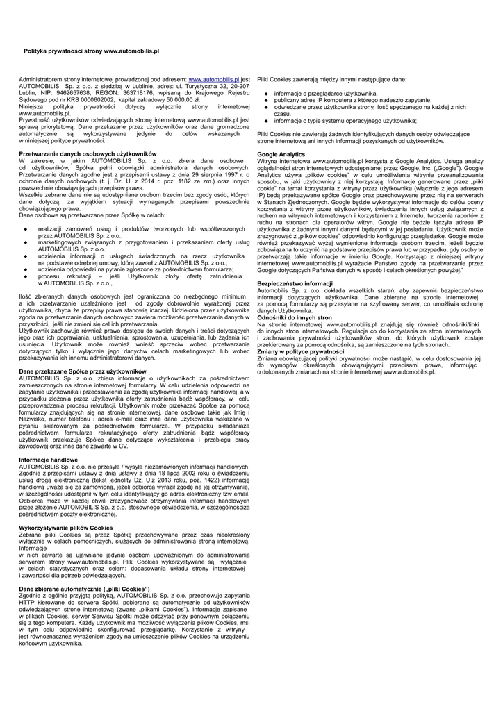 Polityka prywatności strony www.automobilis.pl Administratorem strony internetowej prowadzonej pod adresem: www.automobilis.pl jest AUTOMOBILIS Sp. z o.o. z siedzibą w Lublinie, adres: ul. Turystyczna 32, 20-207 Lublin, NIP: 9462657638, REGON: 363718176, wpisaną do Krajowego Rejestru Sądowego pod nr KRS 0000602002, kapitał zakładowy 50 000,00 zł. Niniejsza polityka prywatności dotyczy wyłącznie strony internetowej www.automobilis.pl. Prywatność użytkowników odwiedzających stronę internetową www.automobilis.pl jest sprawą priorytetową. Dane przekazane przez użytkowników oraz dane gromadzone automatycznie są wykorzystywane jedynie do celów wskazanych w niniejszej polityce prywatności. Pliki Cookies zawierają między innymi następujące dane: Przetwarzanie danych osobowych użytkowników W zakresie, w jakim AUTOMOBILIS Sp. z o.o. zbiera dane osobowe od użytkowników, Spółka pełni obowiązki administratora danych osobowych. Przetwarzanie danych zgodne jest z przepisami ustawy z dnia 29 sierpnia 1997 r. o ochronie danych osobowych (t. j. Dz. U. z 2014 r. poz. 1182 ze zm.) oraz innych powszechnie obowiązujących przepisów prawa. Wszelkie zebrane dane nie są udostępniane osobom trzecim bez zgody osób, których dane dotyczą, za wyjątkiem sytuacji wymaganych przepisami powszechnie obowiązującego prawa. Dane osobowe są przetwarzane przez Spółkę w celach: Google Analytics Witryna internetowa www.automobilis.pl korzysta z Google Analytics. Usługa analizy oglądalności stron internetowych udostępnianej przez Google, Inc. („Google”). Google Analytics używa „plików cookies” w celu umożliwienia witrynie przeanalizowania sposobu, w jaki użytkownicy z niej korzystają. Informacje generowane przez „pliki cookie” na temat korzystania z witryny przez użytkownika (włącznie z jego adresem IP) będą przekazywane spółce Google oraz przechowywane przez nią na serwerach w Stanach Zjednoczonych. Google będzie wykorzystywał informacje do celów oceny korzystania z witryny przez użytkowników, świadczenia innych usług związanych z ruchem na witrynach internetowych i korzystaniem z Internetu, tworzenia raportów z ruchu na stronach dla operatorów witryn. Google nie będzie łączyła adresu IP użytkownika z żadnymi innymi danymi będącymi w jej posiadaniu. Użytkownik może zrezygnować z „plików cookies” odpowiednio konfigurując przeglądarkę. Google może również przekazywać wyżej wymienione informacje osobom trzecim, jeżeli będzie zobowiązana to uczynić na podstawie przepisów prawa lub w przypadku, gdy osoby te przetwarzają takie informacje w imieniu Google. Korzystając z niniejszej witryny internetowej www.automobilis.pl wyrażacie Państwo zgodę na przetwarzanie przez Google dotyczących Państwa danych w sposób i celach określonych powyżej.” realizacji zamówień usług i produktów tworzonych lub współtworzonych przez AUTOMOBILIS Sp. z o.o.; marketingowych związanych z przygotowaniem i przekazaniem oferty usług AUTOMOBILIS Sp. z o.o.; udzielenia informacji o usługach świadczonych na rzecz użytkownika na podstawie odrębnej umowy, którą zawarł z AUTOMOBILIS Sp. z o.o.; udzielenia odpowiedzi na pytanie zgłoszone za pośrednictwem formularza; procesu rekrutacji – jeśli Użytkownik złoży ofertę zatrudnienia w AUTOMOBILIS Sp. z o.o., Ilość zbieranych danych osobowych jest ograniczona do niezbędnego minimum a ich przetwarzanie uzależnione jest od zgody dobrowolnie wyrażonej przez użytkownika, chyba że przepisy prawa stanowią inaczej. Udzielona przez użytkownika zgoda na przetwarzanie danych osobowych zawiera możliwość przetwarzania danych w przyszłości, jeśli nie zmieni się cel ich przetwarzania. Użytkownik zachowuje również prawo dostępu do swoich danych i treści dotyczących jego oraz ich poprawiania, uaktualnienia, sprostowania, uzupełniania, lub żądania ich usunięcia. Użytkownik może również wnieść sprzeciw wobec przetwarzania dotyczących tylko i wyłącznie jego danychw celach marketingowych lub wobec przekazywania ich innemu administratorowi danych. Dane przekazane Spółce przez użytkowników AUTOMOBILIS Sp. z o.o. zbiera informacje o użytkownikach za pośrednictwem zamieszczonych na stronie internetowej formularzy. W celu udzielenia odpowiedzi na zapytanie użytkownika i przedstawienia za zgodą użytkownika informacji handlowej, a w przypadku złożenia przez użytkownika oferty zatrudnienia bądź współpracy, w celu przeprowadzenia procesu rekrutacji. Użytkownik może przekazać Spółce za pomocą formularzy znajdujących się na stronie internetowej, dane osobowe takie jak Imię i Nazwisko, numer telefonu i adres e-mail oraz inne dane użytkownika wskazane w pytaniu skierowanym za pośrednictwem formularza. W przypadku składaniaza pośrednictwem formularza rekrutacyjnego oferty zatrudnienia bądź współpracy użytkownik przekazuje Spółce dane dotyczące wykształcenia i przebiegu pracy zawodowej oraz inne dane zawarte w CV. Informacje handlowe AUTOMOBILIS Sp. z o.o. nie przesyła / wysyła niezamówionych informacji handlowych. Zgodnie z przepisami ustawy z dnia ustawy z dnia 18 lipca 2002 roku o świadczeniu usług drogą elektroniczną (tekst jednolity Dz. U.z 2013 roku, poz. 1422) informację handlową uważa się za zamówioną, jeżeli odbiorca wyraził zgodę na jej otrzymywanie, w szczególności udostępnił w tym celu identyfikujący go adres elektroniczny tzw email. Odbiorca może w każdej chwili zrezygnowaćz otrzymywania informacji handlowych przez złożenie AUTOMOBILIS Sp. z o.o. stosownego oświadczenia, w szczególnościza pośrednictwem poczty elektronicznej. Wykorzystywanie plików Cookies Zebrane pliki Cookies są przez Spółkę przechowywane przez czas nieokreślony wyłącznie w celach pomocniczych, służących do administrowania stroną internetową. Informacje w nich zawarte są ujawniane jedynie osobom upoważnionym do 