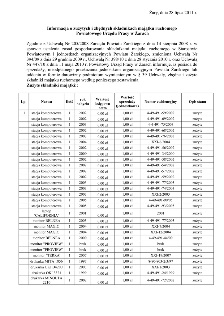 Żary, dnia 28 lipca 2011 r. Informacja o zużytych i zbędnych składnikach majątku ruchomego Powiatowego Urzędu Pracy w Żarach Zgodnie z Uchwałą Nr 205/2008 Zarządu Powiatu Żarskiego z dnia 14 sierpnia 2008 r. w sprawie ustalenia zasad gospodarowania składnikami majątku ruchomego w Starostwie Powiatowym i jednostkach organizacyjnych Powiatu Żarskiego, zmieniona Uchwałą Nr 394/09 z dnia 29 grudnia 2009 r., Uchwałą Nr 398/10 z dnia 28 stycznia 2010 r. oraz Uchwałą Nr 447/10 z dnia 11 maja 2010 r. Powiatowy Urząd Pracy w Żarach informuje, iż posiada do sprzedaży, nieodpłatnego przekazania jednostkom organizacyjnym Powiatu Żarskiego lub oddania w formie darowizny podmiotom wymienionym w § 39 Uchwały, zbędne i zużyte składniki majątku ruchomego według poniższego zestawienia. Zużyte składniki majątki:: Wartość sprzedaży (jednostkowa) Numer ewidencyjny Opis stanu 0,00 zł 1,00 zł 4-49-491-59/2002 zużyte 0,00 zł 1,00 zł 4-49-491-69/2002 zużyte 2003 0,00 zł 1,00 zł 4-4-491-75/2003 zużyte 1 2002 0,00 zł 1,00 zł 4-49-491-68/2002 zużyte stacja komputerowa 1 2003 0,00 zł 1,00 zł 4-49-491-76/2003 zużyte stacja komputerowa 1 2004 0,00 zł 1,00 zł XXI-6/2004 zużyte stacja komputerowa 1 2002 0,00 zł 1,00 zł 4-49-491-56/2002 zużyte stacja komputerowa 1 2000 0,00 zł 1,00 zł 4-49-491-34/2000 zużyte stacja komputerowa 1 2002 0,00 zł 1,00 zł 4-49-491-58/2002 zużyte stacja komputerowa 1 2002 0,00 zł 1,00 zł 4-49-491-54/2002 zużyte stacja komputerowa 1 2002 0,00 zł 1,00 zł 4-49-491-57/2002 zużyte stacja komputerowa 1 2002 0,00 zł 1,00 zł 4-49-491-59/2002 zużyte stacja komputerowa 1 2003 0,00 zł 1,00 zł 4-49-491-77/2003 zużyte stacja komputerowa 1 2003 0,00 zł 1,00 zł 4-49-491-74/2003 zużyte stacja komputerowa 1 2003 0,00 zł 1,00 zł XXI/2/2003 zużyte stacja komputerowa 1 2005 0,00 zł 1,00 zł 4-49-491-90/05 zużyte stacja komputerowa laptop "CALIFORNIA" monitor BELNEA 1 2005 0,00 zł 1,00 zł 4-49-491-93/2005 zużyte 1 2001 1,00 zł 2001 zużyte 1 2003 0,00 zł 1,00 zł 4-49-491-77/2003 zużyte monitor MAGIC 1 2004 0,00 zł 1,00 zł XXI-7/2004 zużyte monitor MAGIC 1 2004 0,00 zł 1,00 zł XXI-12/2004 zużyte monitor BELNEA 1 2000 0,00 zł 1,00 zł 4-49-491-44/00 zużyte monitor "PROVIEW' 1 brak 0,00 zł 1,00 zł brak zużyte monitor "PROVIEW' 1 brak 0,00 zł 1,00 zł brak zużyte Lp. Nazwa Ilość rok nabycia Wartość księgowa netto 1 stacja komputerowa 1 2002 stacja komputerowa 1 2002 stacja komputerowa 1 stacja komputerowa 0,00 zł monitor "TERRA' 1 2007 0,00 zł 1,00 zł XXI-19/2007 zużyte drukarka MITA 1856 1 1997 0,00 zł 1,00 zł 8-80-803-2/3/97 zużyte drukarka OKI B4200 1 2003 0,00 zł 1,00 zł XXI/1/2003 zużyte drukarka OKI 3321 drukarka MINOLTA 2210 1 1999 0,00 zł 1,00 zł 4-49-491-24/1999 zużyte 1 2002 1,00 zł 4-49-491-72/2002 zużyte 0,00 zł niszczarka Fellowes 1 2006 0,00 zł 1,00 zł XVIII-89/2006 zużyte niszczarka Fellowes 1 2008 0,00 zł 1,00 zł XVIII-163/2008 zużyte gilotyna krzesło obrotowe popielate krzesło obrotowe popielate krzesło obrotowe niebieskie krzesło obrotowe niebieskie krzesło obrotowe niebieskie krzesło obrotowe niebieskie krzesło obrotowe pepitka szara krzesło obrotowe niebieskie krzesło obrotowe granatowe krzesło obrotowe krzesło obrotowe niebieskie krzesło obrotowe niebieskie krzesło obrotowe niebieskie krzesło obrotowe zielone krzesło obrotowe krzesło niebie. z metal. nogami krzesło niebie. z metal. nogami krzesło niebie. z metal. nogami krzesło niebie. z metal. nogami krzesło niebie. z metal. nogami krzesło niebie. z metal. nogami krzesło niebie. z metal. nogami krzesło niebie. z metal. nogami krzesła przęsłowe aparat telefoniczny Alcatel aparat telefoniczny Alcatel aparat telefoniczny Alcatel aparat telefoniczny Alcatel aparat telefoniczny Alcatel aparat telefoniczny Alcatel aparat telefoniczny 1 brak 0,00 zł 1,00 zł brak zużyte 1 2004 1,00 zł XIX-20/2004 zużyte 1 brak 1,00 zł brak zużyte 1 2000 1,00 zł VI-88/2000 zużyte 1 1997 1,00 zł V-110/1997 zużyte 1 2003 1,00 zł IV-32/2003 zużyte 1 1997 1,00 zł IV-53/1997 zużyte 1 2002 1,00 zł IV-31/2002 zużyte 1 brak 1,00 zł brak zużyte 1 1993 1,00 zł V-111/1993 zużyte 1 1997 1,00 zł IV-57/1997 zużyte 1 1997 1,00 zł IV-86/1997 zużyte 1 2009 1,00 zł IV-38/2009 zużyte 1 2002 1,00 zł IV-32/2002 zużyte 1 1997 1,00 zł IV-58/1997 zużyte 1 2003 1,00 zł IV-130/2003 zużyte 1 1997 1,00 zł IV-7/1997 zużyte 1 1997 1,00 zł IV-9/1997 zużyte 1 1997 1,00 zł IV-10/1997 zużyte 1 1997 1,00 zł IV-11/1997 zużyte 1 1997 1,00 zł IV-16/1997 zużyte 1 1997 1,00 zł IV-17/1997 zużyte 1 1997 1,00 zł IV-18/1997 zużyte 1 brak 1,00 zł brak zużyte 3 1997 1,00 zł V-1/1997 zużyte 1 1997 1,00 zł XII-I-12/1997 zużyte 1 1997 1,00 zł XII-I-15/1997 zużyte 1 1997 1,00 zł XII-I-16/1997 zużyte 1 1997 1,00 zł XII-I-2/1997 zużyte 1 1997 1,00 zł XII-I-8/1997 zużyte 1 1997 1,00 zł XII-I-7/1997 zużyte 1 1997 1,00 zł XII-I-5/1997 zużyte 0,00 zł 0,00 zł 0,00 zł 0,00 zł 0,00 zł 0,00 zł 0,00 zł 0,00 zł 0,00 zł 0,00 zł 0,00 zł 0,00 zł 0,00 zł 0,00 zł 0,00 zł 0,00 zł 0,00 zł 0,00 zł 0,00 zł 0,00 zł 0,00 zł 0,00 zł 0,00 zł 0,00 zł 0,00 zł 0,00 zł 0,00 zł 0,00 zł 0,00 zł 0,00 zł 0,00 zł Alcatel aparat telefoniczny CASIO aparat telefoniczny Alcatel aparat telefoniczny Alcatel czajnik bezprze.ZELMER czajnik bezprze.ZELMER czajnik bezprze.ZELMER czajnik bezprze.ZELMER kalkulator CITIZEN 1 2006 1 brak 1 1997 1 2000 1 2000 1 brak 1 2000 1 2000 1 1992 1 1992 1 1996 1 1996 1 brak 1 2008 1 2000 1 1996 1 brak wiatraczek 1 1 2005 brak 0,00 zł 1,00 zł brak zużyte klimatyzator 1 2006 0,00 zł 1,00 zł 6-6-653-12/2006 zużyte maszyna OPTIMA maszyna "OLIMPIA" 1 1993 0,00 zł 1,00 zł XI/I-13/1993 zużyte 1 1997 1,00 zł 8-80-803-7/1997 zużyte kalkulator CITIZEN kalkulator CITIZEN elektr. kalkulator CITIZEN elektr. kalkulator CASIO elektr. kalkulator CITIZEN elektr. drukarka do etykiet DY