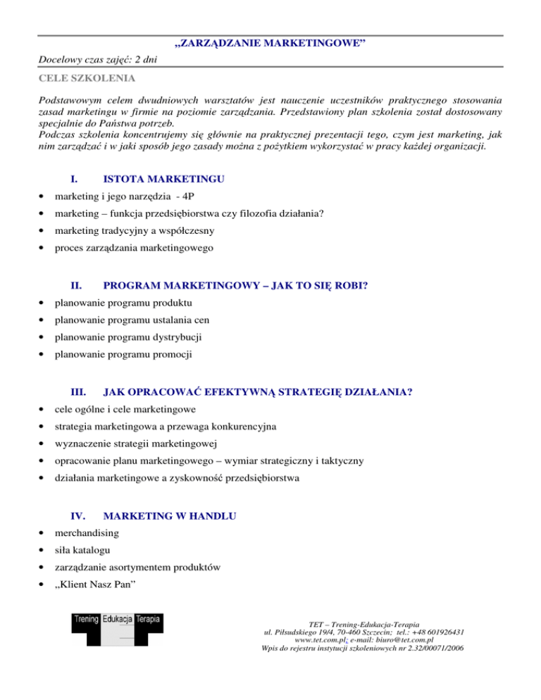 „ZARZĄDZANIE MARKETINGOWE” Docelowy czas zajęć: 2 dni CELE SZKOLENIA Podstawowym celem dwudniowych warsztatów jest nauczenie uczestników praktycznego stosowania zasad marketingu w firmie na poziomie zarządzania. Przedstawiony plan szkolenia został dostosowany specjalnie do Państwa potrzeb. Podczas szkolenia koncentrujemy się głównie na praktycznej prezentacji tego, czym jest marketing, jak nim zarządzać i w jaki sposób jego zasady można z pożytkiem wykorzystać w pracy każdej organizacji. I. ISTOTA MARKETINGU • marketing i jego narzędzia - 4P • marketing – funkcja przedsiębiorstwa czy filozofia działania? • marketing tradycyjny a współczesny • proces zarządzania marketingowego II. PROGRAM MARKETINGOWY – JAK TO SIĘ ROBI? • planowanie programu produktu • planowanie programu ustalania cen • planowanie programu dystrybucji • planowanie programu promocji III. JAK OPRACOWAĆ EFEKTYWNĄ STRATEGIĘ DZIAŁANIA? • cele ogólne i cele marketingowe • strategia marketingowa a przewaga konkurencyjna • wyznaczenie strategii marketingowej • opracowanie planu marketingowego – wymiar strategiczny i taktyczny • działania marketingowe a zyskowność przedsiębiorstwa IV. MARKETING W HANDLU • merchandising • siła katalogu • zarządzanie asortymentem produktów • „Klient Nasz Pan” TET – Trening-Edukacja-Terapia ul. Piłsudskiego 19/4, 70-460 Szczecin; tel.: +48 601926431 www.tet.com.pl; e-mail: [email protected] Wpis do rejestru instytucji szkoleniowych nr 2.32/00071/2006 V. WDROŻENIE I KONTROLA MARKETINGU • organizacja marketingu w przedsiębiorstwie • wdrażanie strategii marketingowej • rola działu marketingu • kontrola programu marketingowego • efektywność procesu kontroli TET – Trening-Edukacja-Terapia ul. Piłsudskiego 19/4, 70-460 Szczecin; tel.: +48 601926431 www.tet.com.pl; e-mail: [email protected] Wpis do rejestru instytucji szkoleniowych nr 2.32/00071/2006