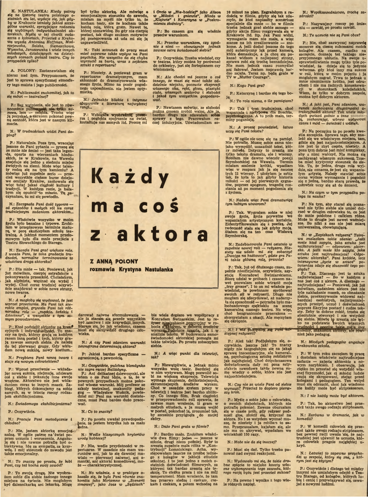 ,. K. NASTULANKA: Kiedy patrzy na lłińorię teatru polskiego ostatnich stu lat, wudaje się, jak gdyby w Krakowie istniałv jakid szczególne warunki, sprzyjające rodzeniu ałę ałę wybitnych indywiduatno§ci aktorskich. Myślę w te; chwitł zwlaucza o ~obietach. Przecież z Krakowa tot~szła Antonina Hoffman, Modrzejewska, Solska, Sie.maszkowa, Wysocka, Jaroszewska i wiele innych młodszych, działających na dzisiejszych scenach gwiazd teatru. Czy to przypadek tytko? być tylko aktorką. Ale mówfilC o emocjonalnym stosunku do zawodu, miałam na myśli nie tylko to, że kocham teatr, ale że kocham także każdą rolę, którą gram. Nawet tę, której nienawidzę. Bo gdy nie cierpię postaci, tak długo szukam motywów jej postępowania aż uda mi sit: ją usprawiedliwić. N.: Taki sotsunek do pracy musi mieć zapewne także wpływ na Pani psychikę. Nie wszystko da się chyba wyrzucić z11 burtę, wrat z zejlciem sztuki z repertuaru? A. POLONY: Zastanawiałam się nieraz nad tym. Przypuszczam, że jest to sprawa specyficznej atmosfery tego maista i jego publiczności. N.: Publłczno§ci znakomitej, jak to mówi - teatralnej? ałę P.: Bez w~ienia, ale jest to równocześnie pu .._.,.,łko slfrowa, lecz ę a. Trzeba więc ją pozyskać, & zarazem pokonać pewną senność, która jest w naszym klimacie. N.: W ping? trudnościach P.: Niestety. A gram w repertuarze dramatycznym, mam skłonność do dramatyzowania wła snego żYcia. Mimo na pozór pogodnego usposobienia, nie jestem optymistką. Jednakże bliskie Qbc~wanłe z lłteraturq ł łntymne najwyższe; rangi... P.: Wzb-gga& wyob~ rza i ptml!4 l)(lgłębia kształtuje ,,Młło'ci "Klqtwłe'' mteniu i gniewie", Młoda to i Katan11M w "Poskro- .tło,nicl/''. P.: Bo czasem gra przeciw warunkom. sit: właśnie N.: Przecito warunkom, czy zgodnie z nimi obowiązuje jednak zawsze ostra 'władomo'ć siebie? P.: Oczywlśole. Trzeba wiedzieć, czy w teatrze, który można by porównać do orkiestry, jest się fortepianem czy wiolonczelą. ponieważ N.: ł Orcło t.0 "Nłe-boskłef' 14ko Atłlcm w spojrzenie na świat, nas samych itd. Proszę mi N.: Ale chodzi mi jeszcze o co§ innego, że musi się mieć także oddzielnie niejako, poczucie ekspresji własnego oka, ręki, głosu, plastyki ciała, wlasntłch watorów ł slabości i jako' tym wszystkim gospodarować. P .: Nawiasem mówiąc, ze słabości lll!:lina &zasem zrobić wało~. Ale ja, bardzo długo nie zdawałam lObie sprawy z tego. Pracowałam raczej intuicyjnie. Uświadomilam so- ; ma co s zadaniom aktorskim... P.: Właściwie wszystko w moim tyciu było banalne i typowe. Zrobiłam w przepisowym terminie maturę, w porę skończyłam szkołę teatralną. A jakimś momentem przeło mowym było dla mnie przejście z Teatru Słowackiego do Starego. z aktora Zaczęła Pani grać większe uważa Pant, że taka gradacja role. I trudno§ci, normalne terminowanie to wlalcitoa droga aktorska? staje się nowym P.: Wprost przeciwnie - wkłada jąc nową suknię, zdejmuję, zdzieram coś z siebie i pokazuję inne swoje wnętrze. Aktorstwo nie jest wkła daniem coraz to innych masek. Zabiegi, których dokonujemy na sobie samych, są w Istocie rzeczy rodzajem ekshibicjonizmu. N.: Swiadomego ekshibicjonizmu? N.: Pracu;e Panł darować naiwne sformułowanie ale ja starabl ~ię przede ~stkim być .uczciwa i nie krz7wcWć,.ipPych. Starąm sięJ:>o jak wiadomo, czasem tnusl -slę ski'iYwllziC drugiego czło 'w ieka. N.: A czu Pani zdaniem warunki 4ktora? zewnętrzne determinują P: Jakieś ograniczają, bardzo specyficzne - z pewnością. N.: .0C%11WUcie, pulchna blondynka nie zagra rączej Ba1l4dynv. P.: Ani delłkatnej dziewczynki, ale wiem o co Pani idzie, o to, że w pewnych przypadkach można pokonać własne warunki. Mój profesor ze szkoły teatralnej, znakomity pedagog - Władysław Woźnik, powiedział mi: Pani ma warunki dostateczne, musi Pani bardzo dużo pracować. N.: Co to znaczy? P.: Oczywiście. metodycznie ł chłodno? P .: Po prostu uważał prawdopodobnie, że jestem brzydka lub za mało ladna. P.: Nie, jestem aktorką emocj~ . N.: Wedle klas11cznych kTYteriów nalną. W ogóle patrzę na • świat poprzez uczucia i wzruszenia. Angażu urody kobiecej? ję się i nie zawsze potrafię być oP.: Nie, wedle przydatności w rebiektywna. Idę za sympatią, za krzypertuarze. W zasadzie nie mam wawdą. I mój stosunek do zawodu jest runków ani, jak to się dawniej matakże emocjonalny. wiało pierwszej naiwnej, ani aN.: To znaczy po prostu, te lubi mantki, ani aktorki komediowej, moPani, czy też kocha swó; zawód? że - charakterystycznej. P.: To swoją drogą. Nie wyobrażam sobie dla siebie żadnego innego miejsca na ś)Wiecle. Nie mogłabym być dziennikarką ani lekarką. Mogę i bardzo się tego bo- ję. pamiętam? P.: Tak i tym trudniejsza, choć wspaniała l nje~ dla Brechta, psyoebologiczna. A tu prób mało, terminy poganiają. się proszę powiedzieć, ue~ nie sq Pani obce? P.: Nie, choć zazwyczaj naprawdc szczerze się_ cieszę sukcesami moich kolegów. Ale czasem, rzadko na szczęście, doznaję też taklego nieprzyjemnego ukłucia. N• swoje usprawiedliwienie mogę tylko tyle powiedzieć, że dzieje się to jedynie wówczas, gdy ktoś inny ma sukces w roli, którą w moim pojęciu i ja mogłabym zagrać. Trwa to jednak u mnie niezmiernie krótko, jest odruchem l nie ma żadnych konsekewncji w stosunkach koldeńskich. Wiem, że tylko w dobrym zespole, można być dobrym aktorem. N.: A jaki jest, Pani zdantęm, warunek zachowania długotrwałej atrakcyjno§cl aktora? Tak wiele mło dtlch gwiazd galnie a inne pozosta ją, zachowując, wbrew upłvwowł czasu ł mód - świeżGAć i wdtłęk. łatwo P.: Na Pani tekstu? N.: No wlalnie, a to praktuce okazało się, :te byla Pani równie znakomita jako Miriamne w ,.Scenerii zimowej", jako Joas w ,,Sędziach" więc punkt dta telewizji, tak? P.: Niewątpliwie, a jednak mimo wszystko wolę - teatr. Bardziej się w nim wyżywa