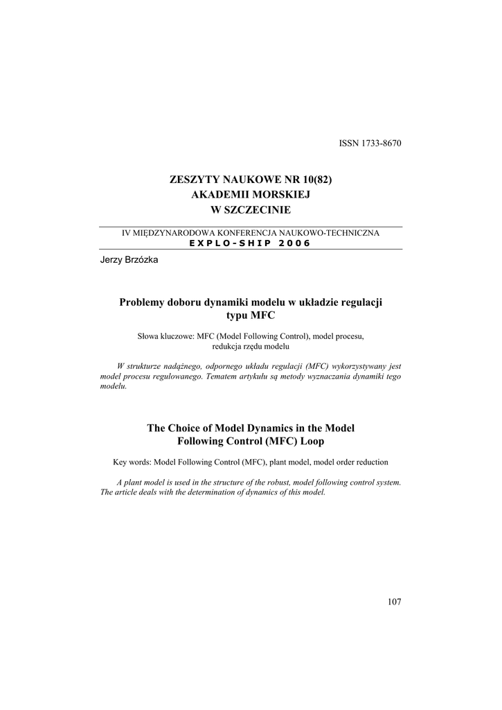 ISSN 1733-8670 ZESZYTY NAUKOWE NR 10(82) AKADEMII MORSKIEJ W SZCZECINIE IV MIĘDZYNARODOWA KONFERENCJA NAUKOWO-TECHNICZNA EXPLO-SHIP 2006 Jerzy Brzózka Problemy doboru dynamiki modelu w układzie regulacji typu MFC Słowa kluczowe: MFC (Model Following Control), model procesu, redukcja rzędu modelu W strukturze nadążnego, odpornego układu regulacji (MFC) wykorzystywany jest model procesu regulowanego. Tematem artykułu są metody wyznaczania dynamiki tego modelu. The Choice of Model Dynamics in the Model Following Control (MFC) Loop Key words: Model Following Control (MFC), plant model, model order reduction A plant model is used in the structure of the robust, model following control system. The article deals with the determination of dynamics of this model. 107 Jerzy Brzózka Wprowadzenie W ostatnich latach obserwuje się duże zainteresowanie odpornymi (mocnymi, krzepkimi) układami regulacji automatycznej. Są to takie układy regulacji, które zachowują swoje własności (stabilność, jakość działania) nie tylko dla pojedynczego procesu regulowanego (jak w klasycznym układzie regulacji automatycznej), ale dla pewnego zbioru tych procesów, z których każdy należy do tej samej klasy. Elementami zbioru są procesy perturbowane, czyli różniące się – na przykład wartościami parametrów (tzw. niepewność strukturalna) – od procesu nominalnego oraz proces nominalny. Przykładem nieskomplikowanego, odpornego układu regulacji, mającego bardzo dobre własności, jest układ śledzący z modelem, tj. Model Following Control (MFC) [3, 5, 6]. W [1] i [2] przedstawiono badania symulacyjne tej struktury dla przypadku nieliniowego układu regulacji prędkości obrotowej silnika głównego oraz kąta kursu statku. 1. Struktura układu MFC i jej własności Schemat blokowy układu regulacji typu MFC przedstawiono na rysunku 1. + z(s) + up(s) P(s) + y(s) + ur(s) – R(s) układ regulacji procesu + ym(s) r(s) + – Rm(s) um(s) M(s) układ regulacji modelu Rys. 1. Schemat blokowy struktury MFC: P(s), R(s), M(s), Rm(s) – transmitancja procesu, regulatora procesu, modelu procesu nominalnego i jego regulatora, odpowiednio; r(s), z(s) – sygnały: wartości zadanej i zakłóceń; y(s), ym(s) – sygnały wielkości regulowanej procesu i modelu; um(s), uR(s), up(s) – sygnały sterujące z regulatora modelu, procesu oraz sygnał sterujący procesem Fig. 1. The structure of a robust model following control (MFC) system with a plant model M(s), plant P(s), plant controller R(s) and model controller Rm(s) 108 Problemy doboru dynamiki modelu w układzie regulacji typu MFC Struktura MFC – jak wynika z rysunku 1 – zawiera dwa układy regulacji: układ regulacji modelu i układ regulacji procesu. Wartością zadaną dla układu regulacji procesu jest sygnał wyjściowy ym(s) z układu regulacji modelu. Tak więc układ regulacji procesu „śledzi”, „nadąża” za wartością (dla niego zadaną) ym(s). Proces o transmitancji P(s) jest sterowany sygnałem up(s) będącym sumą dwóch sygnałów – um(s) z regulatora modelu i ur(s) z korekcyjnego regulatora procesu. Dla schematu przedstawionego na rysunku 1 można stosunkowo łatwo wyznaczyć transformaty poszczególnych sygnałów: y( s) r ( s) Rm ( s) P( s) 1 R( s) M ( s) z ( s) 1 R(s) P(s)1 Rm (s)M (s) 1 R(s) P(s) (1) um ( s ) r ( s ) Rm ( s) 1 Rm ( s) M ( s) (2) ym ( s ) r ( s ) Rm ( s) M ( s) 1 Rm ( s) M ( s) (3) ur (s) R(s) ym (s) y(s) (4) u p (s) um (s) ur (s) (5) Dodatkowo, przyjmuje się multiplikatywną niepewność procesu, tzn. P(s) M (s)1 (s) (6) gdzie (s) oznacza niepewność procesu. Z wyrażeń (1) – (5) wynika, że wszystkie sygnały są zależne od transmitancji modelu M(s). W układach regulacji wykorzystujących modele procesów regulowanych wymagana jest, z reguły duża, zgodność modelu reprezentującego proces z procesem rzeczywistym. Układy te działają dobrze przy bardzo niewielkich perturbacjach procesu w stosunku do przyjętego dla nich modelu. Układ MFC nie stawia tak ostrych wymagań, ponieważ jego struktura cechuje się odpornością. Jednak odpowiedni dobór modelu pozostaje nadal problemem do rozwiązania. 109 Jerzy Brzózka 2. Metody doboru modelu w strukturze MFC Szczególnym przypadkiem doboru transmitancji modelu jest sytuacja, gdy transmitancja modelu M(s) jest dokładnie równa transmitancji procesu P(s). Wówczas sygnał wyjściowy obiektu y(s) nadąża idealnie za sygnałem wyjściowym z modelu ym(s). To znaczy: y ( s ) ym ( s ) z (s) 1 R( s)M (s) (7) co wynika wprost z zależności (1) i (3), a tłumienie zakłóceń w wyrażeniu (7) można zmieniać niezależnie poprzez dobór transmitancji regulatora głównego R(s). W przypadku, gdy R(s)M(s) >> 1 oraz Rm(s)M(s) >> 1, z zależności (1) wynika, że (dla z(s) = 0): y ( s) r ( s) (8) co oznacza, że y(s) idealnie „śledzi” wartość zadaną r(s). Gwarancją stabilności układu MFC jest spełnienie warunku stabilności wynikającego z równania charakterystycznego: 1 R(s)M (s)1 (s) 0 (9) Tak więc dla znanej niepewności Δ(s) oraz przyjętej transmitancji modelu M(s), trzeba sprawdzić warunek stabilności, korzystając z równania (9). Jeżeli warunki stabilności nie są spełnione, należy przyjąć inną transmitancję modelu. W dalszej części artykułu przedstawiono opracowane metody doboru transmitancji modelu M(s) w strukturze MFC. 2.1. Dobór modelu ze względu na transmitancję układu regulacji MFC Zakładając transmitancję wyjściowo-wejściową y(s) układu MFC jako r (s) ym ( s) układu regulacji modelu r (s) jako B(s), dla znanych transmitancji P(s) i R(s), z układu równań (10) i (11) można wyznaczyć transmitancję modelu M(s) – (12). D(s), a transmitancję wyjściowo-wejściową 110 Problemy doboru dynamiki modelu w układzie regulacji typu MFC Rm ( s) P( s)1 R( s) M ( s) 1 R(s) P(s)1 Rm (s)M (s) (10) Rm ( s) M ( s) 1 Rm ( s) M ( s) (11) B(s) P(s) D ( s )1 R ( s ) P ( s ) B ( s ) R ( s ) P ( s ) (1