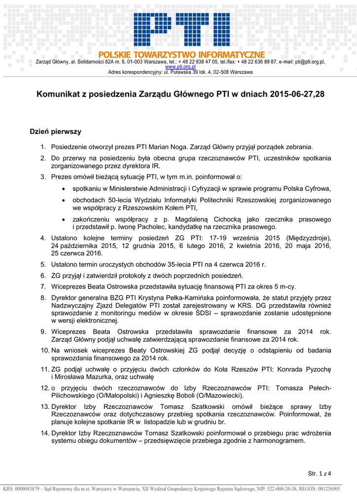 Zarząd Główny, al. Solidarności 82A m. 5, 01-003 Warszawa, tel.: + 48 22 838 47 05, tel./fax: + 48 22 636 89 87, e-mail: [email protected], www.pti.org.pl Adres korespondencyjny: ul. Puławska 39 lok. 4, 02-508 Warszawa Komunikat z posiedzenia Zarządu Głównego PTI w dniach 2015-06-27,28 Dzień pierwszy 1. Posiedzenie otworzył prezes PTI Marian Noga. Zarząd Główny przyjął porządek zebrania. 2. Do przerwy na posiedzeniu była obecna grupa rzeczoznawców PTI, uczestników spotkania zorganizowanego przez dyrektora IR. 3. Prezes omówił bieżącą sytuację PTI, w tym m.in. poinformował o: spotkaniu w Ministerstwie Administracji i Cyfryzacji w sprawie programu Polska Cyfrowa, obchodach 50-lecia Wydziału Informatyki Politechniki Rzeszowskiej zorganizowanego we współpracy z Rzeszowskim Kołem PTI, zakończeniu współpracy z p. Magdaleną Cichocką jako rzecznika prasowego i przedstawił p. Iwonę Pacholec, kandydatkę na rzecznika prasowego. 4. Ustalono kolejne terminy posiedzeń ZG PTI: 17-19 września 2015 (Międzyzdroje), 24 października 2015, 12 grudnia 2015, 6 lutego 2016, 2 kwietnia 2016, 20 maja 2016, 25 czerwca 2016. 5. Ustalono termin uroczystych obchodów 35-lecia PTI na 4 czerwca 2016 r. 6. ZG przyjął i zatwierdził protokoły z dwóch poprzednich posiedzeń. 7. Wiceprezes Beata Ostrowska przedstawiła sytuację finansową PTI za okres 5 m-cy. 8. Dyrektor generalna BZG PTI Krystyna Pełka-Kamińska poinformowała, że statut przyjęty przez Nadzwyczajny Zjazd Delegatów PTI został zarejestrowany w KRS. DG przedstawiła również sprawozdanie z monitoringu mediów w okresie ŚDSI – sprawozdanie zostanie udostępnione w wersji elektronicznej. 9. Wiceprezes Beata Ostrowska przedstawiła sprawozdanie finansowe za 2014 Zarząd Główny podjął uchwałę zatwierdzającą sprawozdanie finansowe za 2014 rok. rok. 10. Na wniosek wiceprezes Beaty Ostrowskiej ZG podjął decyzję o odstąpieniu od badania sprawozdania finansowego za 2014 rok. 11. ZG podjął uchwałę o przyjęciu dwóch członków do Koła Rzeszów PTI: Konrada Pyzochę i Mirosława Mazurka, oraz uchwałę 12. o przyjęciu dwóch rzeczoznawców do Izby Rzeczoznawców PTI: Tomasza PełechPilichowskiego (O/Małopolski) i Agnieszkę Boboli (O/Mazowiecki). 13. Dyrektor Izby Rzeczoznawców Tomasz Szatkowski omówił bieżące sprawy Izby Rzeczoznawców oraz dotychczasowy przebieg spotkania rzeczoznawców. Poinformował, że planuje kolejne spotkanie IR w listopadzie lub w grudniu br. 14. Dyrektor Izby Rzeczoznawców Tomasz Szatkowski poinformował o przebiegu prac wdrożenia systemu obiegu dokumentów – przedsięwzięcie przebiega zgodnie z harmonogramem. Str. 1 z 4 KRS: 0000043879 – Sąd Rejonowy dla m.st. Warszawy w Warszawie, XII Wydział Gospodarczy Krajowego Rejestru Sądowego, NIP: 522-000-20-38, REGON: 001236905 Zarząd Główny, al. Solidarności 82A m. 5, 01-003 Warszawa, tel.: + 48 22 838 47 05, tel./fax: + 48 22 636 89 87, e-mail: [email protected], www.pti.org.pl Adres korespondencyjny: ul. Puławska 39 lok. 4, 02-508 Warszawa 15. Przewodniczący Komisji Grantów Piotr Bała przedstawił wnioski grantowe, które wpłynęły do Komisji, i rekomendacje przyznania grantów: wydanie trzech Rzeczoznawców „AUDYTOR 15504” zgłoszony przez Sekcję Bezpieczeństwa „Poprawa efektywności projektów IT w Polsce - raport nt. czynników krytycznych sukcesów i porażek” zgłoszony przez kol. Kazimierza Frączkowskiego tomów Biblioteki Rzeczoznawców zgłoszony przez Izbę 16. ZG podjął uchwałę przyznającą w/w granty. 17. Wiceprezes Beata Ostrowska przedstawiła wniosek w sprawie wsparcia budowy we Wrocławiu obelisku ELWRO. Zarząd zdecydował, żeby tę sprawę przejął Oddział Dolnośląski. 18. Prezes zaprezentował publikację Rady Naukowej „Profesjonalne kwalifikacje informatyczne”, która ukazała się w ramach Zeszytów Rady Naukowej pod redakcją Zdzisława Szyjewskiego. ZG podjął uchwałę o sfinansowaniu tej publikacji. Kol. Tomasz Komorowski poinformował, że ten numer Zeszytów Rady Naukowej będzie dostępny w Książnicy Pomorskiej dla wszystkich internautów. 19. Po przedstawieniu przez wiceprezesa Marka Hołyńskiego wniosku Stowarzyszenia Matematyków i informatyków z Niepełnosprawnościami i Ich Przyjaciół „Integrał” zarząd podjął uchwałę o wstąpieniu PTI do stowarzyszenia „Integrał” jako członek wspierający i o deklaracji pomocy finansowej dla tego stowarzyszenia. 20. Na wniosek wiceprezesa O/Podlaskiego Zenona Sosnowskiego zarząd podjął uchwałę o powołaniu Sekcji Analizy Danych i wyznaczył kol. Zenona Sosnowskiego na organizatora sekcji. 21. Przewodnicząca Komisji Jakości Barbara Królikowska przedstawiła raport z realizacji uchwały nr 40 w części dotyczącej Komisji Jakości. Zarząd zobowiązał komisję do przekazania raportu w postaci pisemnej do 12 lipca br. OK ECDL omówił realizację danej uchwały w części dotyczącej PB ECDL. Zarząd zlecił OK ECDL opracowanie do 12 lipca br. analizy zaleceń pokontrolnych GKR (protokół GKR z 15 kwietnia br.) z planem działań PB ECDL lub wskazaniem innej właściwej do podjęcia działań jednostki PTI. W związku z wykonaniem uchwały nr 40 oraz wynikami kontroli GKR na wniosek wiceprezesa Janusza Dorożyńskiego ZG uznał, że nie ma potrzeby przeprowadzenia w PB ECDL audytu zewnętrznego. 22. Zarząd podjął uchwałę przyjmująca rezygnację kol. Sławomira Smugowskiego ze składu Komisji Jakości. 23. Redaktor naczelny biuletynu PTI Tomasz Komorowski zaprezentował jego kolejny numer i omówił uwarunkowania związane z dotychczasowym wydawaniem biuletynu i kontynuowaniem wydawania. Prezes zobowiązał się do wypracowania z wiceprezesami i kol. Tomaszem Komorowskim propozycji rozwiązania umożliwiającego dalsze wydawanie biuletynu. 24. Kol. Tomasz Pełech-Pilichowski zaprezentował pomysł utworzenia wydawnictwa PTI dla publikacji prac m.in. młodych pracowników n