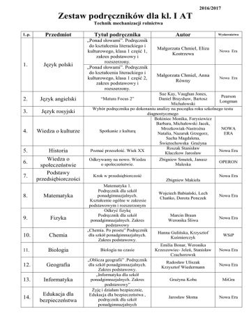 2016/2017 Zestaw podręczników dla kl. I AT Technik mechanizacji rolnictwa L.p. 1. Przedmiot Tytuł podręcznika Język polski „Ponad słowami”. Podręcznik do kształcenia literackiego i kulturowego, klasa 1 część 1, zakres podstawowy i rozszerzony. „Ponad słowami”. Podręcznik do kształcenia literackiego i kulturowego, klasa 1 część 2, zakres podstawowy i rozszerzony. 2. Język angielski 3. Język rosyjski 4. Wiedza o kulturze 5. Historia 6. 7. Wiedza o społeczeństwie Podstawy przedsiębiorczości 8. Matematyka 9. Fizyka 10. Chemia 11. Biologia 12. Geografia 13. Informatyka 14. Edukacja dla bezpieczeństwa Autor Wydawnictwo Małgorzata Chmiel, Eliza Kostrzewa Nowa Era Małgorzata Chmiel, Anna Równy Nowa Era Sue Kay, Vaughan Jones, Pearson Daniel Brayshaw, Bartosz Longman Michałowski Wybór podręcznika po dokonaniu analizy na początku roku szkolnego testu diagnostycznego Bokiniec Monika, Forysiewicz Barbara, Michałowski Jacek, Mrozkowiak-Nastrożna NOWA Spotkanie z kulturą Natalia, Nazaruk Grzegorz, ERA Sacha Magdalena, Świętochowska Grażyna Roszak Stanisław Poznać przeszłość. Wiek XX Nowa Era Kłaczkow Jarosław “Matura Focus 2” Odkrywamy na nowo. Wiedza o społeczeństwie. Krok w przedsiębiorczość Matematyka 1. Podręcznik dla szkół ponadgimnazjalnych. Kształcenie ogólne w zakresie podstawowym i rozszerzonym Odkryć fizykę Podręcznik dla szkół ponadgimnazjalnych. Zakres podstawowy „Chemia. Po prostu” Podręcznik dla szkół ponadgimnazjalnych. Zakres podstawowy. Biologia na czasie „Oblicza geografii” .Podręcznik dla szkół ponadgimnazjalnych. Zakres podstawowy. „Informatyka dla szkół ponadgimnazjalnych. Zakres podstawowy” Żyję i działam bezpiecznie, Edukacja dla bezpieczeństwa , podręcznik dla szkół ponadgimnazjalnych Zbigniew Smutek, Janusz Maleska Zbigniew Makieła OPERON Nowa Era Wojciech Babiański, Lech Chańko, Dorota Ponczek Nowa Era Marcin Braun Weronika Śliwa Nowa Era Hanna Gulińska, Krzysztof Kuśmierczyk WSiP Emilia Bonar, Weronika Krzeszowiec- Jeleń, Stanisław Czachorowsk Nowa Era Radosław Uliszak Krzysztof Wiedermann Nowa Era Grażyna Koba MiGra Jarosław Słoma Nowa Era Zespół pod przew. Ks. Z. Marka WAM Kraków 15. Religia W Kościele 16. Przepisy ruchu drogowego w zakresie kategorii TiB Kodeks drogowy z ustawą „ Prawo o ruchu drogowym” 17. Podstawy konstrukcji maszyn Podstawy konstrukcji maszyn . cz. I i II P. Boś, D. Chodorowska R. Fejkiel Z. Wrząsk. WKiŁ 18. Obróbka materiałów Technologia ogólna A. Górecki WSiP dowolny
