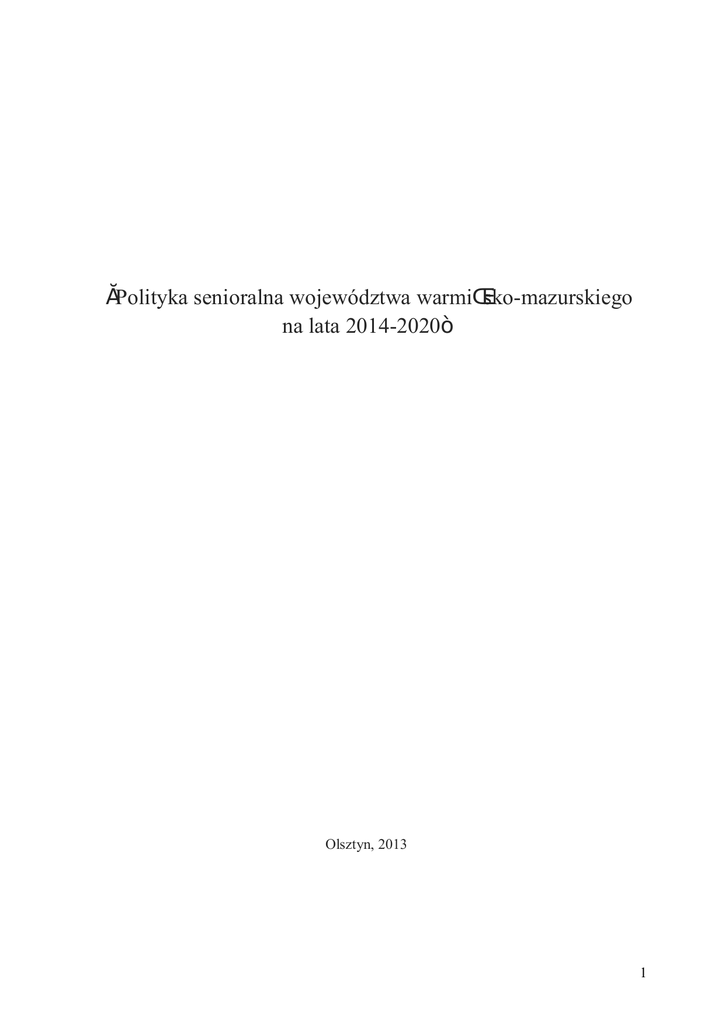 „Polityka senioralna województwa warmińsko-mazurskiego na lata 2014-2020” Olsztyn, 2013 1 Spis treści Spis skrótów ............................................................................................................................. 3 Wstęp ....................................................................................................................................... 4 1. Metodologia tworzenia programu ..................................................................................... 6 2. Zjawisko starzenia się społeczeństw w dokumentach strategicznych Europy, Polski i województwa warmińsko-mazurskiego................................................................................... 10 3. Dane statystyczne dotyczące osób starszych w województwie warmińsko-mazurskim .... 16 4. „Srebrna gospodarka” ..................................................................................................... 18 5. Wizja programu .............................................................................................................. 20 6. Obszary, cele strategiczne i szczegółowe, działania, wskaźniki ....................................... 21 6.1. 6.1.1. Analiza SWOT .................................................................................................. 27 6.1.2. Cele strategiczne i szczegółowe, działania, wskaźniki ....................................... 29 6.2. Aktywność społeczna, kulturalna i edukacyjna ......................................................... 31 6.2.1. Analiza SWOT .................................................................................................. 33 6.2.2. Cele strategiczne i szczegółowe, działania, wskaźniki ....................................... 34 6.3. Aktywność zawodowa .............................................................................................. 38 6.3.1. Analiza SWOT .................................................................................................. 39 6.3.2. Cele strategiczne i szczegółowe, działania, wskaźniki ....................................... 41 6.4. 7. Zdrowie (profilaktyka, rehabilitacja), infrastruktura i usługi socjalne ........................ 21 Turystyka, sport i rekreacja ...................................................................................... 42 6.4.1. Analiza SWOT .................................................................................................. 46 6.4.2. Cele strategiczne i szczegółowe, działania, wskaźniki ....................................... 47 Wdrażanie Programu ...................................................................................................... 50 7.1. Finansowanie Programu ........................................................................................... 50 7.2. Monitorowanie Programu ......................................................................................... 51 8. Skład Zespołu ds. opracowania Wojewódzkiego programu na rzecz osób starszych na lata 2014-2020. ............................................................................................................................. 52 Harmonogram realizacji „Polityki senioralnej województwa warmińsko-mazurskiego na lata 2014-2020” ............................................................................................................................ 53 2 Spis skrótów ATW Akademia Trzeciego Wieku CBOS Centrum Badania Opinii Społecznej FOSa Federacja Organizacji Socjalnych Województwa Warmińsko-Mazurskiego GUS Główny Urząd Statystyczny MNiSW Ministerstwo Nauki i Szkolnictwa Wyższego NFZ Narodowy Fundusz Zdrowia ONZ Organizacja Narodów Zjednoczonych OPS OZPS Ośrodek Pomocy Społecznej (w tym Miejskie, Miejsko-Gminne i Gminne Ośrodki Pomocy Społecznej) Ocena Zasobów Pomocy Społecznej PCPR Powiatowe Centrum Pomocy Rodzinie PTTK Polskie Towarzystwo Turystyczno-Krajoznawcze ROPS UE Regionalny Ośrodek Polityki Społecznej Urzędu Marszałkowskiego Województwa Warmińsko-Mazurskiego w Olsztynie Unia Europejska UTW Uniwersytet Trzeciego Wieku WHO Światowa Organizacja Zdrowia (ang. World Health Organization) 3 Wstęp Proces starzenia się ludności jest zaliczany do najważniejszych zjawisk społecznych XXI wieku, a jego skutki stanowią i będą stanowić kluczowe wyzwanie w sferze polityki społecznej w najbliższych latach. Według Strategii Lizbońskiej liczba ludności do 2050 roku będzie się zmniejszać, natomiast liczba ludności w wieku powyżej 65 lat wzrośnie o 60%, w stosunku do 2005 roku. Świadomość nieuchronnego starzenia się społeczeństw staje się obowiązkowym elementem planowania przyszłości we wszystkich sferach życia. Powstaje wiele opracowań naukowych diagnozujących sytuację osób starszych w kraju i na świecie. Na ich podstawie opracowywane są dokumenty unijne i krajowe wyznaczające kierunki działań niezbędnych do podjęcia w celu przygotowania się do życia w znacznie zmienionej strukturze demograficznej, o których będzie mowa w dalszej części dokumentu. Podejmując działania na rzecz osób starszych należy pamiętać, że działania państwa/władz publicznych nie zastąpią aktywności całego społeczeństwa. Dlatego ważne jest, aby samorządy terytorialne, które są najbliżej swoich mieszkańców włączyły się w proces kreowania nowej, przyjaznej seniorom rzeczywistości. W roku 2009 województwo warmińsko-mazurskie zamieszkiwało 206 036 osób w wieku poprodukcyjnym, co stanowiło 14,44% ogółu mieszkańców województwa, a w roku 2012 było to już 228 147 osób, co stanowiło 15,73% mieszkańców regionu. Samorząd Województwa Warmińsko-Mazurskiego, mając na uwadze rosnący odsetek mieszkańców województwa w wieku poprodukcyjnym (w roku 2009 – 14,44% do 15,73% w roku 2012) od wielu lat prowadzi szereg działań na rzecz wsparcia i aktywizowania osób starszych w regionie Warmii, Mazur i Powiśla. Pode