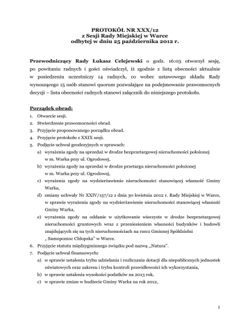 PROTOKÓŁ NR XXX/12 z Sesji Rady Miejskiej w Warce odbytej w dniu 25 października 2012 r. Przewodniczący Rady Łukasz Celejewski o godz. 16:03 otworzył sesję, po powitaniu radnych i gości oświadczył, iż zgodnie z listą obecności aktualnie w posiedzeniu uczestniczy 14 radnych, co wobec ustawowego składu Rady wynoszącego 15 osób stanowi quorum pozwalające na podejmowanie prawomocnych decyzji – lista obecności radnych stanowi załącznik do niniejszego protokołu. Porządek obrad: 1. Otwarcie sesji. 2. Stwierdzenie prawomocności obrad. 3. Przyjęcie proponowanego porządku obrad. 4. Przyjęcie protokołu z XXIX sesji. 5. Podjęcie uchwał geodezyjnych w sprawach: a) wyrażenia zgody na sprzedaż w drodze bezprzetargowej nieruchomości położonej w m. Warka przy ul. Ogrodowej, b) wyrażenia zgody na sprzedaż w drodze przetargu nieruchomości położonej w m. Warka przy ul. Ogrodowej, c) wyrażenia zgody na wydzierżawienie nieruchomości stanowiącej własność Gminy Warka, d) zmiany uchwały Nr XXIV/157/12 z dnia 30 kwietnia 2012 r. Rady Miejskiej w Warce, w sprawie wyrażenia zgody na wydzierżawienie nieruchomości stanowiącej własność Gminy Warka, e) wyrażenia zgody na oddanie w użytkowanie wieczyste w drodze bezprzetargowej nieruchomości gruntowych wraz z przeniesieniem własności budynków i budowli znajdujących się na tych nieruchomościach na rzecz Gminnej Spółdzielni „ Samopomoc Chłopska’’ w Warce. 6. Przyjęcie statutu międzygminnego związku pod nazwą ,,Natura”. 7. Podjęcie uchwał finansowych: a) w sprawie ustalenia trybu udzielania i rozliczania dotacji dla niepublicznych jednostek oświatowych oraz zakresu i trybu kontroli prawidłowości ich wykorzystania, b) w sprawie ustalenia wysokości podatków na 2013 rok, c) w sprawie zmian w budżecie Gminy Warka na rok 2012, 1 d) w sprawie wniesienia wkładów niepieniężnych (aportu) do Spółki ZUK w Warce Sp. z o. o. 8. Podjęcie uchwały w sprawie zmiany Wieloletniej Prognozy Finansowej Gminy Warka. 9. Regulamin nadawania tytułu ,,Honorowy Obywatel Miasta Warki’’ – projekt uchwały. 10. Przedstawienie informacji w sprawie prawidłowości złożenia oświadczeń majątkowych. 11. Informacja Burmistrza o działalności między sesjami. 12. Interpelacje i zapytania Radnych. 13. Zamknięcie sesji. Na wniosek przewodniczącego Rady wprowadzono zmiany w porządku obrad polegające na: - pkt. 8 został wykreślony z powodu braku uchwały. Brzmienie porządku obrad po zmianach : 1. Otwarcie sesji. 2. Stwierdzenie prawomocności obrad. 3. Przyjęcie proponowanego porządku obrad. 4. Przyjęcie protokołu z XXIX sesji. 5. Podjęcie uchwał geodezyjnych w sprawach: f) wyrażenia zgody na sprzedaż w drodze bezprzetargowej nieruchomości położonej w m. Warka przy ul. Ogrodowej, g) wyrażenia zgody na sprzedaż w drodze przetargu nieruchomości położonej w m. Warka przy ul. Ogrodowej, h) wyrażenia zgody na wydzierżawienie nieruchomości stanowiącej własność Gminy Warka, i) zmiany uchwały Nr XXIV/157/12 z dnia 30 kwietnia 2012 r. Rady Miejskiej w Warce, w sprawie wyrażenia zgody na wydzierżawienie nieruchomości stanowiącej własność Gminy Warka, j) wyrażenia zgody na oddanie w użytkowanie wieczyste w drodze bezprzetargowej nieruchomości gruntowych wraz z przeniesieniem własności budynków i budowli znajdujących się na tych nieruchomościach na rzecz Gminnej Spółdzielni „ Samopomoc Chłopska’’ w Warce. 6. Przyjęcie statutu międzygminnego związku pod nazwą ,,Natura”. 7. Podjęcie uchwał finansowych: 2 e) w sprawie ustalenia trybu udzielania i rozliczania dotacji dla niepublicznych jednostek oświatowych oraz zakresu i trybu kontroli prawidłowości ich wykorzystania, f) w sprawie ustalenia wysokości podatków na 2013 rok, g) w sprawie zmian w budżecie Gminy Warka na rok 2012, h) w sprawie wniesienia wkładów niepieniężnych (aportu) do Spółki ZUK w Warce Sp. z o. o. 8. Regulamin nadawania tytułu ,,Honorowy Obywatel Miasta Warki’’ – projekt uchwały. 9. Przedstawienie informacji w sprawie prawidłowości złożenia oświadczeń majątkowych. 10. Informacja Burmistrza o działalności między sesjami. 11. Interpelacje i zapytania Radnych. 12. Zamknięcie sesji. Ad.2. Stwierdzenie prawomocności obrad. Przewodniczący Rady stwierdził prawomocność obrad. Ad.3. Przyjęcie proponowanego porządku obrad. Porządek obrad został przyjęty „jednogłośnie”. Ad.4. Przyjęcie protokołu z XXIX sesji. Protokół z XXIX sesji został przyjęty „jednogłośnie”. Ad.5. Podjęcie uchwał geodezyjnych. Przewodniczący Rady przedstawił projekt uchwały druk nr 1 w sprawie: wyrażenia zgody na sprzedaż w drodze bezprzetargowej nieruchomości położonej w m. Warka przy ul. Ogrodowej. Projekt uchwały stanowi załącznik do niniejszego protokołu. 3 Następnie Przewodniczący odczytał treść uchwały i zapytał, czy są pytania, uwagi do przedstawionego projektu uchwały? Ponieważ pytań i uwag nie zgłoszono projekt uchwały został poddany pod głosowanie. Rada Miejska w Warce w obecności 14 Radnych ,,jednogłośnie’’ podjęła uchwałę w sprawie: wyrażenia zgody na sprzedaż w drodze bezprzetargowej nieruchomości położonej w m. Warka przy ul. Ogrodowej. Przewodniczący Rady przedstawił projekt uchwały druk nr 2 w sprawie: wyrażenia zgody na sprzedaż w drodze przetargu nieruchomości położonej w m. Warka przy ul. Ogrodowej. Projekt uchwały stanowi załącznik do niniejszego protokołu. Następnie Przewodniczący odczytał treść uchwały i zapytał, czy są pytania, uwagi do przedstawionego projektu uchwały? Ponieważ pytań i uwag nie zgłoszono projekt uchwały został poddany pod głosowanie. Rada Miejska w Warce w obecności 14 Radnych ,,jednogłośnie’’ podjęła uchwałę w sprawie: wyrażenia zgody na sprzedaż w drodze przetargu nieruchomości położonej w m. Warka przy ul. Ogrodowej. Przewodniczący Rady przedst