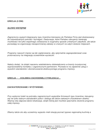 GRECJA (5 DNI) SŁOWO WSTĘPNE Zagraniczny wyjazd integracyjny typu Incentive kierowany do Państwa Firmy jest dostosowany do indywidualnych potrzeb i wymagań. Destynacje, które Państwu oferujemy otwierają możliwości nie tylko wspólnego zwiedzania w oryginalny sposób unikalnych zabytków, ale także pozwalają na organizację niezapomnianej zabawy w znanych na całym świecie miejscach. Programy naszych imprez są tak zaplanowane, aby optymalnie zagospodarować czas przeznaczony na integrację uczestników wycieczki. Należy dodać, że dzięki naszemu wieloletniemu doświadczeniu w branży turystycznej, wypracowaliśmy kontakty z zagranicznymi partnerami. Pozwala to na zapewnie usług o wysokim standardzie i skonstruowanie ekskluzywnego programu imprezy. GRECJA – …KOLEBKA ZACHODNIEJ CYWILIZACJI… ZAKWATEROWANIE I WYŻYWIENIE: Przy wyborze hoteli na potrzeby zagranicznych wyjazdów firmowych typu Incentive, kierujemy się nie tylko dobrym standardem pokoi i obsługi ale także ciekawym charakterem obiektu. Ważną rolę odgrywa także lokalizacja, dzięki której jest możliwe optymalne złożenie programu całej imprezy. Dbamy także oto aby uczestnicy wyjazdu mieli okazję poznać typowo regionalną kuchnię a JOYEVENT.PL travel & event agency | ul. Fieldorfa 11/3 | 80-041 Gdańsk tel. +48 58 320 61 69 | fax +48 58 320 61 67 www.joyevent.pl Phoca PDF potrawy serwowane były w odpowiedni dla danego kraju sposób. W wybranych przez nas hotelach istnieje możliwość rezerwacji sali konferencyjnej. ZAPEWNIAMY NOCLEG I WYŻYWIENIE W HOTELU: Hotel Alkyon Resort **** / Kat. A Obiekt położony na Płw. Peloponez, nad morzem (Zatoka Koryncka), 80 m do plaży. 90 km na zachód od Aten. 2004 r. całkowicie wyremontowany, razem 129 pokoi w kilku budynkach ( w tym 90 pok. standardowych, 22 superior z aneksem kuchennym). W budynku głównym bar, restauracja, kącik internetowy. W hotelu poza tym basen zewnętrzny 130 m2, ogród z palmami, bar plażowy, plac zabaw dla dzieci (zewnętrzny i wewnętrzny), parking, bilard, tenis stołowy. WYŻYWIENIE: - 4 x śniadanie w formie bufetu szwedzkiego w restauracji hotelowej - 4 x obiadokolacja w formie bufetu szwedzkiego w restauracji TRANSPORT: JOYEVENT.PL travel & event agency | ul. Fieldorfa 11/3 | 80-041 Gdańsk tel. +48 58 320 61 69 | fax +48 58 320 61 67 www.joyevent.pl Phoca PDF Dla oszczędności Państwa czasu, transport podczas naszych zagranicznych imprez integracyjnych organizowany jest najczęściej samolotem z lotniska najbliższego od miejsca zamieszkania uczestników imprezy do miejsca docelowego. Jako licencjonowany organizator turystyczny, mamy możliwość rezerwacji grupowej w samolotach zarówno tanich linii lotniczych jak i tradycyjnych – regularnych lotów pasażerskich. Nasza usługa transportowa jest przeprowadzona kompleksowo i zawiera: wyszukanie optymalnego lotu – także złożonego (z międzylądowaniami i przesiadkami), rezerwację biletów oraz zapewnienie pomocy pilota wycieczki przy odprawie na lotniskach. Po wylądowaniu w miejscu docelowym zorganizowany jest dla Państwa całej grupy transfer do hotelu a także transfer powrotny na lotnisko w dniu wyjazdu. ZAPEWNIAMY LOT NA TRASIE (za dodatkową opłatą): Gdańsk – Frankfurt lub Monachium – Ateny i z powrotem ZAPEWNIAMY TRANSFER AUTOAKAREM NA TRASIE: Lotnisko – hotel - lotnisko PROGRAM: Nasi klienci mają wpływ na kształt ostatecznego wyglądu i ceny imprezy, poprzez możliwość wyboru aktywności według własnego zapotrzebowania. Dlatego program wyjazdu integracyjnego, który oferujemy Państwu zawiera Pakiet podstawowy – czyli najważniejsze świadczenia (nocleg, wyżywienie, pilotaż), które obejmuje cena oraz za dodatkową dopłatą atrakcje dodatkowe. JOYEVENT.PL travel & event agency | ul. Fieldorfa 11/3 | 80-041 Gdańsk tel. +48 58 320 61 69 | fax +48 58 320 61 67 www.joyevent.pl Phoca PDF CENA ZAWIERA: - 4 x nocleg w Hotel Alkyon Resort **** w pokojach 2 osobowych - Wyżywienie: 4 x śniadanie w hotelu , 4 x obiadokolacja w restauracji hotelowej - Transfer autobusem / busem na trasie: lotnisko – hotel – lotnisko - Opieka pilota wycieczki podczas pierwszego dnia imprezy - 1 x wieczór z folklorem - 1 x drink powitalny CENY USTALAMY INDYWIDUALNIE W ZALEŻNOŚCI OD TERMINU ORAZ ILOŚCI OSÓB! CENA NIE ZAWIERA: - Przelotu samolotem – orientacyjna cena 1500 PLN – 2000 PLN - Ubezpieczenie KL i NNW – ok. 25 PLN / osobę - Propozycji dodatkowych do programu - Napoi do obiadokolacji PROPONOWANE WYCIECZKI PODCZAS POBYTU: JOYEVENT.PL travel & event agency | ul. Fieldorfa 11/3 | 80-041 Gdańsk tel. +48 58 320 61 69 | fax +48 58 320 61 67 www.joyevent.pl Phoca PDF 1. ATENY Ateny to symbol wolności, sztuki i demokracji. Podczas tej wycieczki uczestnicy odwiedzą potężne miasto o zachwycającej kolorystyce architektury. Podczas odwiedzin w Akropolis zobaczymy Propyleje, Panteon oraz świątynie Erechtejon a chętni wejdą do Archeologicznego Muzeum Narodowego. Podczas spaceru po malowniczej - najstarszej dzielnicy Aten poczujemy atmosferę greckiego miasta. To tu zajrzeć można do jednej z klimatycznych kawiarni i tawern a także zrobić zakupy w sklepie z oryginalnymi pamiątkami. Podczas tej całodziennej wycieczki przejedziemy także przez Pireus - jeden z najbardziej znanych portów Morza Śródziemnego oraz zajrzymy do małych ale urokliwych miast portowych jak Mikrolimano czy Pasalimani. Proponowana wycieczka obejmuje przejazd wygodnym klimatyzowanym autokarem oraz zwiedzanie z przewodnikiem najciekawszych zabytków Aten. CENY USTALAMY INDYWIDUALNIE W ZALEŻNOŚCI OD TERMINU ORAZ ILOŚCI OSÓB! Cena zawiera: - Przejazd klimatyzowanym autokarem do Aten i z powrotem (ok. 180 km) - Przewodnictwo w języku polskim podczas całej wycieczki Cena nie zawiera: JOYEVENT.PL travel & event agency | ul. Fieldorfa 11/3 | 80-041 Gdańsk tel. +48 58 320 61 69 | fax +48 58 320 61 67 www.joyevent.pl Phoca PDF - Wejście do Akropolis - 13,5 Euro 