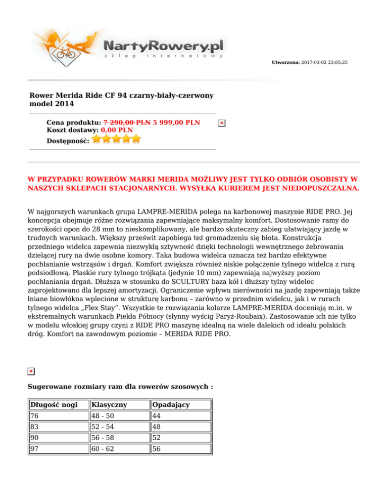 Utworzono: 2017-03-02 23:05:25 Rower Merida Ride CF 94 czarny-biały-czerwony model 2014 Cena produktu: 7 290,00 PLN 5 999,00 PLN Koszt dostawy: 0,00 PLN Dostępność: W PRZYPADKU ROWERÓW MARKI MERIDA MOŻLIWY JEST TYLKO ODBIÓR OSOBISTY W NASZYCH SKLEPACH STACJONARNYCH. WYSYŁKA KURIEREM JEST NIEDOPUSZCZALNA. W najgorszych warunkach grupa LAMPRE-MERIDA polega na karbonowej maszynie RIDE PRO. Jej koncepcja obejmuje różne rozwiązania zapewniające maksymalny komfort. Dostosowanie ramy do szerokości opon do 28 mm to nieskomplikowany, ale bardzo skuteczny zabieg ułatwiający jazdę w trudnych warunkach. Większy prześwit zapobiega też gromadzeniu się błota. Konstrukcja przedniego widelca zapewnia niezwykłą sztywność dzięki technologii wewnętrznego żebrowania dzielącej rury na dwie osobne komory. Taka budowa widelca oznacza też bardzo efektywne pochłanianie wstrząsów i drgań. Komfort zwiększa również niskie połączenie tylnego widelca z rurą podsiodłową. Płaskie rury tylnego trójkąta (jedynie 10 mm) zapewniają najwyższy poziom pochłaniania drgań. Dłuższa w stosunku do SCULTURY baza kół i dłuższy tylny widelec zaprojektowano dla lepszej amortyzacji. Ograniczenie wpływu nierówności na jazdę zapewniają także lniane biowłókna wplecione w strukturę karbonu – zarówno w przednim widelcu, jak i w rurach tylnego widelca „Flex Stay”. Wszystkie te rozwiązania kolarze LAMPRE-MERIDA doceniają m.in. w ekstremalnych warunkach Piekła Północy (słynny wyścig Paryż-Roubaix). Zastosowanie ich nie tylko w modelu włoskiej grupy czyni z RIDE PRO maszynę idealną na wiele dalekich od ideału polskich dróg. Komfort na zawodowym poziomie – MERIDA RIDE PRO. Sugerowane rozmiary ram dla rowerów szosowych : Długość nogi Klasyczny Opadający 76 48 - 50 44 83 52 - 54 48 90 56 - 58 52 97 60 - 62 56 Dlaczego warto wybrać sklep NartyRowery.pl ? ● ● ● ● ● ● ● ● ● ● ● ● ● Darmowa Przesyłka Kurierska dla zamówień już od 400 PLN Szybka dostawa w 24h Możliwość zwrotu lub wymiany towaru w ciągu 10 dni od zakupu W naszym sklepie internetowym są tylko aktualnie dostępne produkty (zredukowaliśmy do minimum ryzyko braku dostępności zamówionego towaru) Możliwość negocjacji cen Częste promocje i rabaty ( obniżki cen, rabat na akcesoria, gratisy do rowerów) Fachowe doradztwo Pozytywne opinie w niezależnych serwisach m.in. Opineo, Allegro i porównywarkach cen Możliwość zakupu na raty - obsługujemy systemy Żagiel i Cetelem Sprzedajemy rowery wyregulowane i przesmarowane Do każdego zamówienia otrzymasz paragon lub fakturę stanowiący podstawę gwarancji Szczegółowe informacje o statusie zamówienia i wysyłce na adres e-mail podany w zamówieniu Obsługujemy płatności internetowe i Paypal Dołożono wszelkich starań, aby opisy i zdjęcia produktów były dokładne i aktualne. Specyfikacje i ceny mogą ulec zmianie bez uprzedzenia Płeć Męski Widelec/ amortyzator Road carbon comp Manetki Przeznaczenie Shimano Tiagra rapidfire Szosowy, Triathlon Przerzutka przód Shimano 105 D Przerzutka tył Shimano 105 SS Kaseta/ wolnobieg Korbowód Pedały Shimano CS-4600-10 12-30 Shimano R565 50-34 no Piasta przód w zestawie Piasta tył w zestawie Obręcze Shimano R501 Hamulce Merida Road PRO Szprychy b.d. Kolekcja 2014 Opony Continental Ultra Sport II 700x25c fold Stery b.d. Mostek Kierownica Controltech ONE -5° Controltech ONE Road Chwyty b.d. Siodło MERIDA Pro SI Sztyca Controltech T5 SB10 27.2 mm Waga 8.30kg Rama Ride carbon comp-E Hamulce U-brake Damper - Ilość biegów 20 Pegi b.d. Łańcuch Gwarancja Adres: http://nartyrowery.pl/ KMC X10 10s 24 miesiące na ramę i osprzęt Telefon: 34 365 66 09, 793 61 04 29 Email: [email protected] Gadu-Gadu: Skype:
