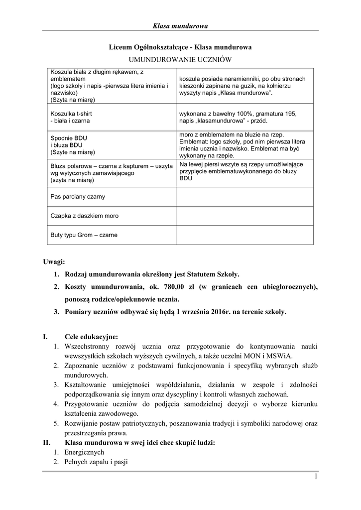 Klasa mundurowa Liceum Ogólnokształcące - Klasa mundurowa UMUNDUROWANIE UCZNIÓW Koszula biała z długim rękawem, z emblematem (logo szkoły i napis -pierwsza litera imienia i nazwisko) (Szyta na miarę) koszula posiada naramienniki, po obu stronach kieszonki zapinane na guzik, na kołnierzu wyszyty napis „Klasa mundurowa”. Koszulka t-shirt - biała i czarna wykonana z bawełny 100%, gramatura 195, napis „klasamundurowa” - przód. Spodnie BDU i bluza BDU (Szyte na miarę) Bluza polarowa – czarna z kapturem – uszyta wg wytycznych zamawiającego (szyta na miarę) moro z emblematem na bluzie na rzep. Emblemat: logo szkoły, pod nim pierwsza litera imienia ucznia i nazwisko. Emblemat ma być wykonany na rzepie. Na lewej piersi wszyte są rzepy umożliwiające przypięcie emblematuwykonanego do bluzy BDU Pas parciany czarny Czapka z daszkiem moro Buty typu Grom – czarne Uwagi: 1. Rodzaj umundurowania określony jest Statutem Szkoły. 2. Koszty umundurowania, ok. 780,00 zł (w granicach cen ubiegłorocznych), ponoszą rodzice/opiekunowie ucznia. 3. Pomiary uczniów odbywać się będą 1 września 2016r. na terenie szkoły. I. Cele edukacyjne: 1. Wszechstronny rozwój ucznia oraz przygotowanie do kontynuowania nauki wewszystkich szkołach wyższych cywilnych, a także uczelni MON i MSWiA. 2. Zapoznanie uczniów z podstawami funkcjonowania i specyfiką wybranych służb mundurowych. 3. Kształtowanie umiejętności współdziałania, działania w zespole i zdolności podporządkowania się innym oraz dyscypliny i kontroli własnych zachowań. 4. Przygotowanie uczniów do podjęcia samodzielnej decyzji o wyborze kierunku kształcenia zawodowego. 5. Rozwijanie postaw patriotycznych, poszanowania tradycji i symboliki narodowej oraz przestrzegania prawa. II. Klasa mundurowa w swej idei chce skupić ludzi: 1. Energicznych 2. Pełnych zapału i pasji 1 Klasa mundurowa 3. 4. 5. 6. III. 1. 2. 3. 4. 5. IV. Organizacja nauczania: Podbudowa - gimnazjum Czas trwania nauki – 3 lata Zakończenie nauki – egzamin maturalny Języki obce – język angielski, język niemiecki Realizacja przedmiotów: obowiązkowych - zgodnie z planem nauczania w liceum rozszerzonych - zgodnie z wyborem ucznia, od klasy II uzupełniających: a) I uzupełniający – przyroda lub historia i społeczeństwo b) II uzupełniający – elementy prawa specjalizacyjnych (ed. wojskowa, policyjna i pożarnicza) Charakterystyka zajęć specjalizacyjnych 1. Wymiar: 2 godziny w klasie I i II oraz 1 godzina w klasie III realizowane modułowo. 2. Uczniowie zapoznają się z działaniem różnych formacji mundurowych: policji, straży pożarnej i wojska oraz odbędą podstawowe szkolenie w zakresie musztry wojskowej. 3. Zajęcia prowadzić będą funkcjonariusze służb, według opracowanych programów autorskich. V. A) B) C) D) E) F) VI. Chętnych do podejmowania nowych wyzwań Zdeterminowanych do osiągania wyznaczonych celów Ukierunkowanych na rozwój osobisty Prawych, sumiennych i odpowiedzialnych za siebie i innych Działania uzupełniające Kursy specjalistyczne nadające kwalifikacje dla chętnych uczniów: 1. Kurs pierwszej pomocy przedmedycznej 2. Kurs prawa jazdy 3. Kurs ratownika WOPR 4. Kursy pożarnicze Realizacja ww kursów może odbywać się w znacznej części na terenie szkoły, co znacznie wpłynie na obniżenie kosztów. Obozy kondycyjne z elementami topografii, terenoznawstwa i strategii formacyjnych Zajęcia ze sztuk walki Nauka jazdy na nartach Warsztaty psychologiczne Zajęcia na strzelnicy Instytucje współpracujące: 1. Komenda Powiatowa Policji w Polkowicach 2. Komenda Straży Pożarnej w Polkowicach 3. Jednostka Wojska Polskiego w Głogowie 2