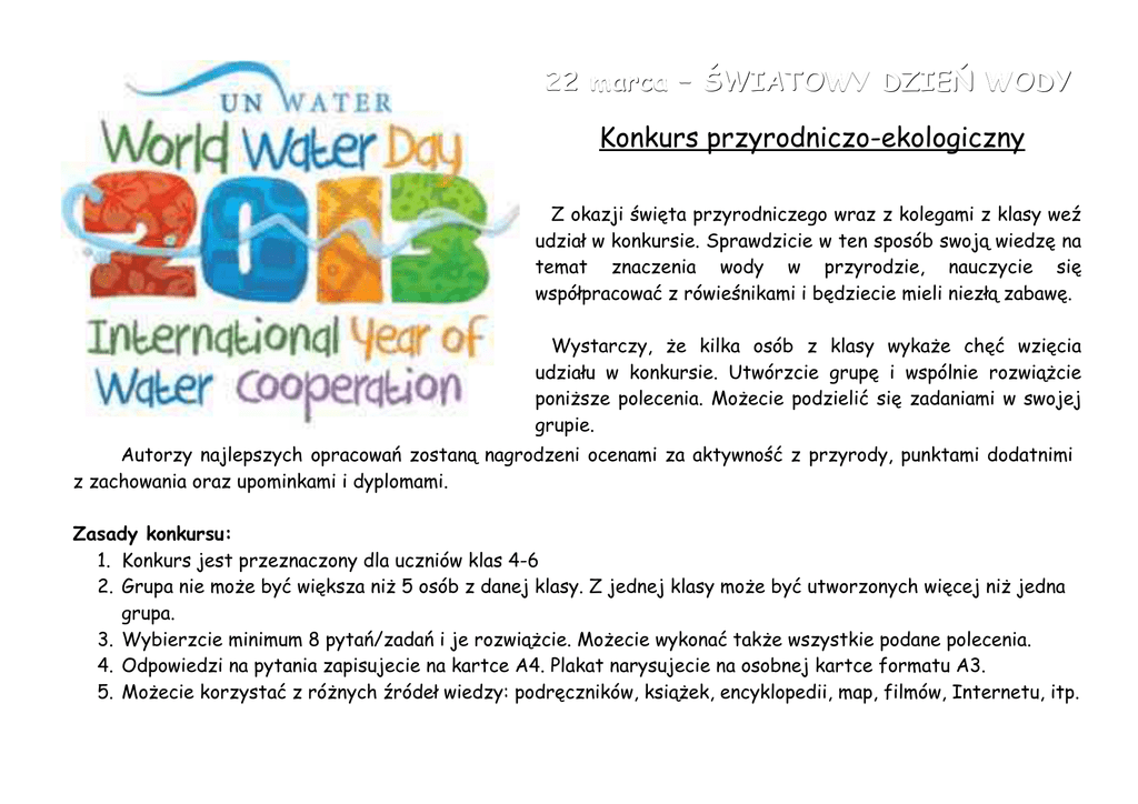 22 marca – ŚWIATOWY DZIEŃ WODY Konkurs przyrodniczo-ekologiczny Z okazji święta przyrodniczego wraz z kolegami z klasy weź udział w konkursie. Sprawdzicie w ten sposób swoją wiedzę na temat znaczenia wody w przyrodzie, nauczycie się współpracować z rówieśnikami i będziecie mieli niezłą zabawę. Wystarczy, że kilka osób z klasy wykaże chęć wzięcia udziału w konkursie. Utwórzcie grupę i wspólnie rozwiążcie poniższe polecenia. Możecie podzielić się zadaniami w swojej grupie. Autorzy najlepszych opracowań zostaną nagrodzeni ocenami za aktywność z przyrody, punktami dodatnimi z zachowania oraz upominkami i dyplomami. Zasady konkursu: 1. Konkurs jest przeznaczony dla uczniów klas 4-6 2. Grupa nie może być większa niż 5 osób z danej klasy. Z jednej klasy może być utworzonych więcej niż jedna grupa. 3. Wybierzcie minimum 8 pytań/zadań i je rozwiążcie. Możecie wykonać także wszystkie podane polecenia. 4. Odpowiedzi na pytania zapisujecie na kartce A4. Plakat narysujecie na osobnej kartce formatu A3. 5. Możecie korzystać z różnych źródeł wiedzy: podręczników, książek, encyklopedii, map, filmów, Internetu, itp. 6. Podpiszcie swoje prace (imiona, nazwiska, klasa) i oddajecie je do 25 marca (poniedziałek) p. Izabeli Skirtun lub p. Hannie Marszałek. Informacje o konkursie znajdziecie także na stronie internetowej szkoły tj. www.sp5.jasnet.pl Pytania: 1. Wymień nazwy wszystkich rzek płynących przez obszar Jastrzębia-Zdroju. 2. Jak się nazywają bogowie mórz i oceanów? 3. Podaj 5 sposobów oszczędzania wody w gospodarstwie domowym. 4. Co kryje się za skrótem GZWiK? 5. Utwórz 3 łańcuchy pokarmowe występujące w wodach słodkich. 6. Rozwiąż rebus, uzyskasz jedno ze źródeł zanieczyszczenia wód. Napisz jego nazwę oraz podaj jeszcze 3 inne znane ci źródła zanieczyszczenia wód. 7. Jak dysponując dwoma naczyniami o pojemności 5 litrów i 3 litry odmierzyć dokładnie 4 litry wody? 8. Napisz dwa przysłowia związane z wodą. Możesz je także zilustrować. 9. Narysuj plakat zachęcający innych do dbania o czystość wód rzek, jezior i stawów lub mórz i oceanów. 10. Akwarium ma kształt prostopadłościanu o wymiarach 6 dm x 40 cm x 50 cm. Ile litrów wody należy wlać do akwarium, aby wypełnić 2/3 objętości tego akwarium?