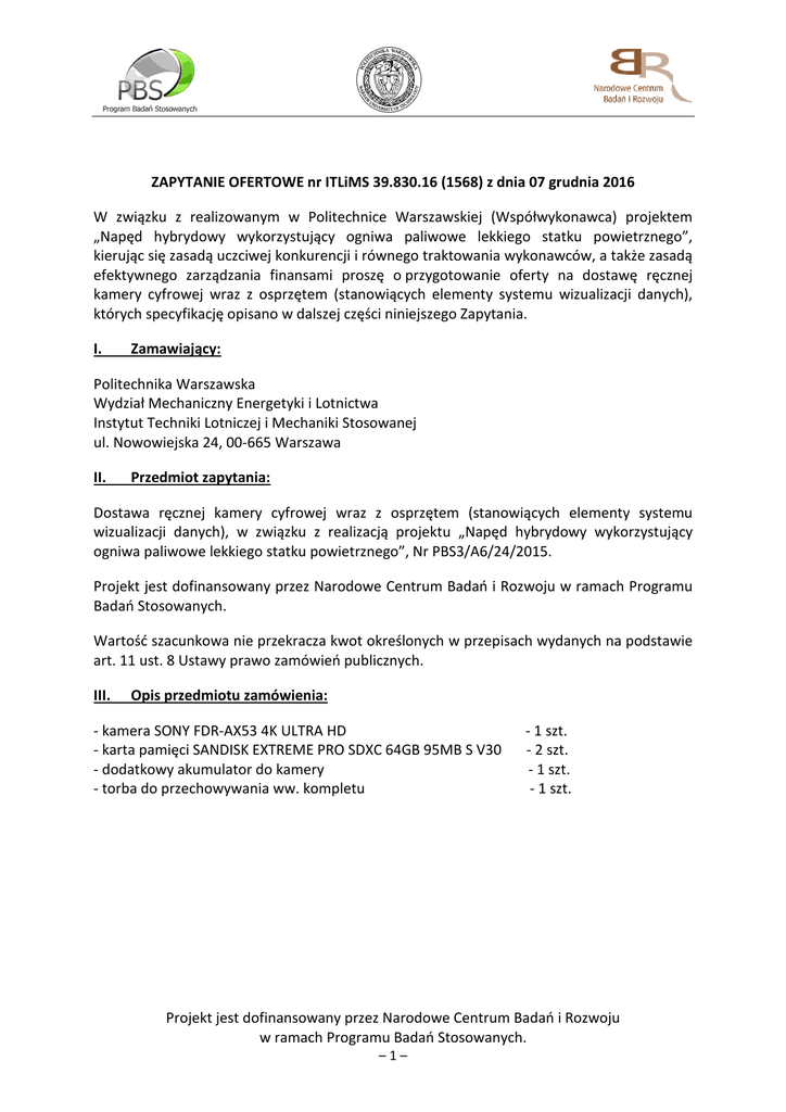 ZAPYTANIE OFERTOWE nr ITLiMS 39.830.16 (1568) z dnia 07 grudnia 2016 W związku z realizowanym w Politechnice Warszawskiej (Współwykonawca) projektem „Napęd hybrydowy wykorzystujący ogniwa paliwowe lekkiego statku powietrznego”, kierując się zasadą uczciwej konkurencji i równego traktowania wykonawców, a także zasadą efektywnego zarządzania finansami proszę o przygotowanie oferty na dostawę ręcznej kamery cyfrowej wraz z osprzętem (stanowiących elementy systemu wizualizacji danych), których specyfikację opisano w dalszej części niniejszego Zapytania. I. Zamawiający: Politechnika Warszawska Wydział Mechaniczny Energetyki i Lotnictwa Instytut Techniki Lotniczej i Mechaniki Stosowanej ul. Nowowiejska 24, 00-665 Warszawa II. Przedmiot zapytania: Dostawa ręcznej kamery cyfrowej wraz z osprzętem (stanowiących elementy systemu wizualizacji danych), w związku z realizacją projektu „Napęd hybrydowy wykorzystujący ogniwa paliwowe lekkiego statku powietrznego”, Nr PBS3/A6/24/2015. Projekt jest dofinansowany przez Narodowe Centrum Badań i Rozwoju w ramach Programu Badań Stosowanych. Wartość szacunkowa nie przekracza kwot określonych w przepisach wydanych na podstawie art. 11 ust. 8 Ustawy prawo zamówień publicznych. III. Opis przedmiotu zamówienia: - kamera SONY FDR-AX53 4K ULTRA HD - karta pamięci SANDISK EXTREME PRO SDXC 64GB 95MB S V30 - dodatkowy akumulator do kamery - torba do przechowywania ww. kompletu - 1 szt. - 2 szt. - 1 szt. - 1 szt. Projekt jest dofinansowany przez Narodowe Centrum Badań i Rozwoju w ramach Programu Badań Stosowanych. –1– IV. Wymagania wobec oferenta: Oferent na potwierdzenie spełnienia warunków udziału w postępowaniu składa wraz z ofertą następujące dokumenty i oświadczenia: 1) oryginał oświadczenia potwierdzającego spełnienie przez Oferenta warunków określonych w art. 22 ust. 1 Ustawy, sporządzone wg wzoru stanowiącego załącznik nr 2 do niniejszego Zapytania; 2) aktualny odpis z właściwego rejestru lub centralnej ewidencji i informacji o działalności gospodarczej, jeżeli odrębne przepisy wymagają wpisu do rejestru lub ewidencji, w celu wykazania braku podstaw do wykluczenia w oparciu o art. 24 ust. 1 pkt 2 Ustawy, wystawione nie wcześniej niż 6 miesięcy przed upływem terminu składania ofert. V. Termin wykonania oferty: 7 dni od podpisania umowy VI. Termin i miejsce składania ofert: Oferty należy składać w formie pisemnej do dnia 15 grudnia 2016 roku, do godziny 12:00 (oferty złożone po tym terminie zostaną zwrócone niezwłocznie bez otwierania, zgodnie z treścią art. 84 ust. 2 Ustawy). Opakowanie zawierające ofertę wraz z wszystkimi wymaganymi oświadczeniami i dokumentami winno być oznaczone nazwą (firmą) i adresem Oferenta i zaadresowane do Zamawiającego – adres: Politechnika Warszawska Instytut Techniki Lotniczej i Mechaniki Stosowanej 00-665 Warszawa , ul. Nowowiejska 24, pokój pok. 302. z dopiskiem: Oferta na dostawę ręcznej kamery cyfrowej wraz z osprzętem Nie otwierać przed dniem 15 grudnia 2016 r., godz. 12:00 VII. Kryteria oceny oferty • Wybór oferty zostanie dokonany na podstawie jednego kryterium – ceny oferty. Wzór określający kryterium wyboru ma postać: Liczba punktów = (cena minimalna / cena ofertowa) * 100 pkt. Projekt jest dofinansowany przez Narodowe Centrum Badań i Rozwoju w ramach Programu Badań Stosowanych. –2– • Za najkorzystniejszą zostanie uznana oferta, która nie podlega odrzuceniu oraz uzyska największą liczbę punktów . Pod uwagę będą brane liczby po zaokrągleniu do dwóch miejsc po przecinku. • Jeżeli w postępowaniu o udzielenie zamówienia, w którym jedynym kryterium oceny ofert jest cena, nie można dokonać wyboru oferty najkorzystniejszej ze względu na to, że zostały złożone oferty o takiej samej cenie, Zamawiający wezwie Wykonawców, którzy złożyli te oferty do złożenia w terminie określonym przez Zamawiającego ofert dodatkowych. • Wykonawcy, którzy złożą ofert dodatkowe nie mogą zaoferować cen wyższych niż zaoferowane w złożonych ofertach. Załączniki: • • • Załącznik nr 1 -Projekt istotnych postanowień umowy Załącznik nr 2 - Formularz oferty Załącznik nr 3 - Szczegółowa specyfikacja techniczna Projekt jest dofinansowany przez Narodowe Centrum Badań i Rozwoju w ramach Programu Badań Stosowanych. –3– Załącznik 1 Przedmiot zamówienia jest współfinansowany ze środków Narodowego Centrum Badań i Rozwoju, w ramach Programu Badań Stosowanych. Wykonawcę wyłoniono w skutek przeprowadzonego postępowania w trybie zapytania ofertowego zgodnie z art. 4 pkt 8 ustawy z dnia 29 stycznia 2004 r. Prawo zamówień publicznych (tekst jedn. Dz. U. z 2013 r. poz. 907 z późn. zm.) Istotne Postanowienia Umowy W dniu ………………… pomiędzy: Politechniką Warszawską Wydziałem Mechanicznym Energetyki i Lotnictwa, Instytutem Techniki Lotniczej i Mechaniki Stosowanej, z siedzibą w Warszawie, ul Nowowiejska 24, 00-665 Warszawa, NIP: 525-000-58-34; REGON: 000001554, reprezentowaną przez: …………………………………………………, zwaną dalej „Zamawiającym” a ……………………………………………………………………………………… zwanym/(ą) dalej „Wykonawcą”, łącznie zwanymi dalej „Stronami” została zawarta Umowa o następującej treści: Wyboru Wykonawcy dokonano bez stosowania przepisów ustawy Prawo Zamówień Publicznych, na podstawie art. 4 pkt 8 ustawy z dnia 29 stycznia 2004 r., Prawo zamówień publicznych (Dz. U. z 2013 r., poz. 907 z późn. zm.) – „ustawy nie stosuje się do zamówień i konkursów, których wartość nie przekracza wyrażonej w złotych równowartości kwoty 30.000 euro”. §1 Przedmiotem umowy jest dostawa ……………………………………………………………………… §2 Za wykonanie przedmiotu Umowy, o którym mowa w § 1 Wykonawca otrzyma od 