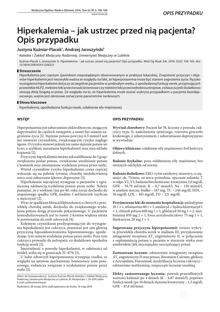 Medycyna Ogólna i Nauki o Zdrowiu, 2016, Tom 22, Nr 2, 158–160 www.monz.pl OPIS PRZYPADKU Hiperkalemia – jak ustrzec przed nią pacjenta? Opis przypadku Justyna Kuźniar-Placek1, Andrzej Jaroszyński1 1 Katedra i Zakład Medycyny Rodzinnej, Uniwersytet Medyczny w Lublinie Kuźniar-Placek J, Jaroszyński A. Hiperkalemia – jak ustrzec przed nią pacjenta? Opis przypadku. Med Og Nauk Zdr. 2016; 22(2): 158–160. doi: 10.5604/20834543.1208223 Streszczenie Hiperkalemia jest częstym zjawiskiem niepożądanym obserwowanym w praktyce lekarskiej. Znajomość przyczyn i objawów hiperkaliemii jest niezwykle ważna ze względu na fakt, że hiperpotasemia może być stanem zagrożenia życia. Ryzyko wystąpienia hiperkaliemii dotyczy szczególnie pacjentów w podeszłym wieku, z upośledzoną funkcją nerek, przyjmujących przewlekle NLPZ, niektóre leki przeciwnadciśnieniowe czy niektóre leki przeciwdrobnoustrojowe, zwłaszcza jeśli dodatkowo stosują dietę bogatą w potas. Ze względu na to, że hiperkalemia może zostać wykryta przypadkiem u pacjenta bezobjawowego, ważne jest okresowe oznaczanie parametrów nerkowych. Słowa kluczowe - - - - hiperkalemia, upośledzona funkcja nerek, osłabienie siły mięśniowej WSTĘP OPIS PRZYPADKU Hiperpotasemia jest zaburzeniem elektrolitowym, mogącym doprowadzić do ciężkich następstw, a nawet być stanem zagrożenia życia [1]. Stężenie potasu powyżej 6,5 mmol/l jest już istotnym czynnikiem, zwiększającym ryzyko nagłego zgonu. O ryzyku stanowi jednak nie samo stężenie potasu we krwi, a szybkość narastania hiperkaliemii oraz stan układu krążenia [2]. Przyczyny hiperkaliemii można zakwalifikować do 3 grup: zwiększona podaż potasu, zwiększone uwalnianie potasu z komórek oraz zmniejszone wydalanie potasu przez nerki. Wśród czynników ryzyka hiperkaliemii coraz częściej wskazuje się na palenie tytoniu, chorobę niedokrwienną serca oraz zaburzenia lękowo-depresyjne [3]. Hiperkalemia najczęściej występuje u pacjentów z ograniczoną zdolnością wydalania potasu przez nerki. Należy pamiętać, że z wiekiem (już po 40. roku życia) dochodzi do stopniowego spadku GFR, średnio 1 ml/min/rok (szybciej u mężczyzn) [2]. Wraz ze spadkiem filtracji kłębuszkowej u chorych z przewlekłą chorobą nerek, dochodzi do zwiększonego wydalania potasu drogą przewodu pokarmowego. U pacjentów hemodializowanych jest to nawet 2-krotnie większa utrata w porównaniu do osób zdrowych [4]. Kolejnym czynnikiem predysponującym do wystąpienia hiperkaliemii jest cukrzyca, ponieważ jest ona główną przyczyną hipoaldosteronizmu hiporeninowego, upośledzając tym samym wydalanie potasu przez nerki. Poza tym cukrzyca prowadzi do nefropatii, co dodatkowo upośledza funkcję nerek [2]. Śmiertelność z powodu hiperkaliemii, w zależności od źródeł, waha się w granicach 35–67% [5]. U ludzi zdrowych hiperpotasemia występuje rzadko, ze względu na sprawne mechanizmy homeostazy jonu potasowego, zwłaszcza związane z wydalaniem potasu przez nerki [2]. Wywiad chorobowy: Pacjent lat 76, leczony z powodu cukrzycy typu II, nadciśnienia tętniczego, rozrostu gruczołu krokowego, z nikotynizmem i zaburzeniami depresyjnymi w wywiadzie. Adres do korespondencji: Justyna Kuźniar-Placek Katedra i Zakład Medycyny Rodzinnej, Uniwersytet Medyczny w Lublinie, Al. Racławickie 1, 20-059 Lublin E-mail: [email protected] - Nadesłano: 28 lutego 2016; zaakceptowano do druku: 16 maja 2016 Objawy kliniczne: osłabienie siły mięśniowej i ból kończyn dolnych. Badanie fizykalne: poza osłabieniem siły mięśniowej bez istotnych odchyleń od normy. Badania dodatkowe: EKG: rytm zatokowy, miarowy, o częstości ok. 75/min, oś serca pośrednia, spiczaste załamki T w odpr. V2, V3; badania biochemiczne: kreatynina 2,0 mg/dl, GFR – 34,79 ml/min, K – 8,7 mmol/l, Na – 138 mmol/l, w analizie moczu: białko – 147 mg, TC – 246 mg/dl, HDL – 36 mg/dl, LDL – 165 mg/dl, TG – 221 mg/dl. Przyjmowane leki do momentu hospitalizacji: amlodypina 10 1 × 1, telmisartan 80 1 × 1, amiloryd + hydrochlorotiazyd 1 × 1, chlorek potasu 600 mg 1 × 1, gliklazyd 30 mg 1 × 2, metformina 850 mg 2 × 1, kwas acetylosalicylowy 75 mg 1 × 1, fluoksetyna 20 mg 1 × 1. Sugerowana przyczyna hiperpotasemii: świeżo wykryta przewlekła choroba nerek w stadium III, przyjmowanie antagonisty receptora AT1 angiotensyny II, w połączeniu z suplementacją potasu u pacjenta w starszym wieku oraz amiloridem (lek moczopędny oszczędzający potas) Zastosowane leczenie: odstawienie antagonisty receptora AT1 angiotensyny II oraz potasu, Resonium Calcium, glukoza z Actrapidem, Furosemid, modyfikacja leczenia cukrzycy – odstawiono metforminę, rozpoczęto leczenie insuliną. Efekty zastosowanego leczenia: powrót prawidłowych wartości kaliemii po 4 dniach (K – 4,87 mmol/l), poprawa funkcji nerek (po 10 dniach stężenie kreatyniny – 1,5 mg/dl, GFR – 47,8 ml/min). Medycyna Ogólna i Nauki o Zdrowiu, 2016, Tom 22, Nr 2 Justyna Kuźniar-Placek, Andrzej Jaroszyński. Hiperkalemia – jak ustrzec przed nią pacjenta? Opis przypadku OMÓWIENIE Hiperkaliemią określa się stężenie potasu w surowicy krwi powyżej 5,5 mmol/l. Klinicznie wyróżnia się 3 stopnie ciężkości hiperkaliemii: – łagodną (5,5– 6,0 mmol/l), – umiarkowaną (6,1– 7,0 mmol/l), – ciężką (≥ 7,1 mmol/l) [6]. - - - - - Hiperkalemia najczęściej występuje u chorych leczonych inhibitorami ACE. Średnio u 10% pacjentów leczonych ACE-I, w ciągu roku od rozpoczęcia leczenia, wystąpi hiperkalemia. Częściej dotyczy to chorych, u których istnieją inne czynniki ryzyka wystąpienia hiperkaliemii, np. cukrzyca, upośledzona funkcja nerek czy nadmierna podaż potasu w diecie [6]. W diagnozowaniu i leczeniu hiperkaliemii warto pamiętać o możliwości wystąpienia zjawiska pseudohiperkaliemii. Polega ono na uwolnieniu wewnątrzkomórkowego potasu z komórek podczas procesu krzepnięci