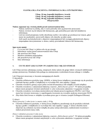 ULOTKA DLA PACJENTA: INFORMACJA DLA UŻYTKOWNIKA Ultop, 10 mg, kapsułki dojelitowe, twarde Ultop, 20 mg, kapsułki dojelitowe, twarde Ultop, 40 mg, kapsułki dojelitowe, twarde Omeprazolum Należy zapoznać się z treścią ulotki przed zastosowaniem leku. Należy zachować tę ulotkę, aby w razie potrzeby móc ją ponownie przeczytać. Należy zwrócić się do lekarza lub farmaceuty, gdy potrzebna jest rada lub dodatkowa informacja. Lek ten został przepisany ściśle określonej osobie i nie należy go przekazywać innym, gdyż może im zaszkodzić, nawet jeśli objawy ich choroby są takie same. Jeśli nasili się którykolwiek z objawów niepożądanych lub wystąpią jakiekolwiek objawy niepożądane niewymienione w ulotce, należy powiadomić lekarza lub farmaceutę. Spis treści ulotki 1. Co to jest lek Ultop i w jakim celu się go stosuje 2. Informacje ważne przed zastosowaniem leku Ultop 3. Jak stosować lek Ultop 4. Możliwe działania niepożądane 5. Jak przechowywać lek Ultop 6. Inne informacje 1. CO TO JEST LEK ULTOP I W JAKIM CELU SIĘ GO STOSUJE Lek Ultop zawiera substancję czynną, omeprazol, który należy do grupy leków zwanych inhibitorami pompy protonowej. Działanie leku polega na zmniejszaniu wydzielania kwasu solnego w żołądku. Lek Ultop jest stosowany w leczeniu następujących chorób: U dorosłych: • Choroba refluksowa przełyku (ang. GERD), w której kwas żołądkowy przedostaje się do przełyku (odcinek łączący gardło z żołądkiem) co wywołuje ból, stan zapalny i zgagę. • Choroba wrzodowa górnej części jelita (wrzód dwunastnicy) lub żołądka (wrzód żołądka). • Choroba wrzodowa z zakażeniem bakterią o nazwie „Helicobacter pylori”. W takim przypadku lekarz może przepisać również antybiotyki w celu wyleczenia zakażenia i wygojenia wrzodu. • Choroba wrzodowa wywołana niesteroidowymi lekami przeciwzapalnymi (NLPZ). Lek Ultop może być również stosowany w zapobieganiu tworzenia się wrzodów podczas stosowania NLPZ. • Zbyt duża ilość kwasu w żołądku wywołana przez guz w trzustce (zespół Zollingera-Ellisona). U dzieci: Dzieci powyżej 1 roku życia i o masie ciała ≥ 10 kg • Choroba refluksowa przełyku, w której kwas żołądkowy przedostaje się do przełyku (odcinek łączący gardło z żołądkiem) co wywołuje ból, stan zapalny i zgagę. U dzieci choroba może objawiać się cofaniem się treści żołądka do jamy ustnej (ulewanie), nudnościami (wymioty) i małym przyrostem masy ciała. Dzieci i młodzież powyżej 4 roku życia • Choroba wrzodowa z zakażeniem bakterią o nazwie „Helicobacter pylori”. W takim przypadku lekarz może przepisać również antybiotyki w celu wyleczenia zakażenia i wygojenia wrzodu. 1 2. INFORMACJE WAŻNE PRZED ZASTOSOWANIEM LEKU ULTOP Kiedy nie stosować leku Ultop • jeśli u pacjenta stwierdzono uczulenie (nadwrażliwość) na omeprazol lub którykolwiek z pozostałych składników leku Ultop, • jeśli u pacjenta stwierdzono nadwrażliwość na leki zawierające inne inhibitory pompy protonowej (np. pantoprazol, lanzoprazol, rabeprazol, ezomeprazol), • jeśli jednocześnie przyjmowany jest nelfinawir (lek stosowany w leczeniu zakażeń HIV). W razie wątpliwości należy zwrócić się do lekarza lub farmaceuty przed zażyciem leku Ultop. Kiedy zachować szczególną ostrożność stosując lek Ultop Lek Ultop może maskować objawy innych chorób, dlatego w razie wystąpienia poniższych objawów przed rozpoczęciem lub podczas zażywania leku Ultop, należy niezwłocznie skontaktować się z lekarzem: • niezamierzona utrata masy ciała i trudności z połykaniem, • ból brzucha lub niestrawność, • wymioty lub wymioty z domieszką krwi, • smoliste stolce (z domieszką krwi), • ostra lub uporczywa biegunka, ponieważ omeprazol może wywoływać niewielki wzrost występowania biegunki zakaźnej, • poważne problemy z wątrobą. W razie długotrwałego zażywania leku Ultop (ponad 1 rok), lekarz będzie prowadził obserwację stanu zdrowia pacjenta. Należy zgłaszać lekarzowi wszelkie nowe i niezwykłe objawy. Przyjmowanie inhibitorów pompy protonowej, takich jak lek Ultop, zwłaszcza przez okres dłuższy niż jeden rok, może nieznacznie zwiększać ryzyko wystąpienia złamań kości biodrowej, kości nadgarstka lub kręgosłupa. Należy poinformować lekarza w przypadku rozpoznanej osteoporozy lub przyjmowania leków z grupy kortykosteroidów (mogących zwiększać ryzyko wystąpienia osteoporozy). Stosowanie leku Ultop z innymi lekami Należy powiedzieć lekarzowi lub farmaceucie o wszystkich przyjmowanych ostatnio lekach, również tych, które wydawane są bez recepty. Lek Ultop może wpływać na działanie innych leków, a inne leki mogą wpływać na działanie leku Ultop. Nie należy stosować leku Ultop w przypadku jednoczesnego stosowania leku zawierającego nelfinawir (stosowany w leczeniu zakażeń HIV). Należy powiadomić lekarza lub farmaceutę o przyjmowaniu któregokolwiek z następujących leków: • Ketokonazol, itrakonazol lub worykonazol (stosowane w leczeniu zakażeń grzybiczych) • Digoksyna (stosowana w leczeniu chorób serca) • Diazepam (stosowany w leczeniu stanów lękowych, zwiotczania mięśni lub w padaczce) • Fenytoina (stosowana w padaczce). Jeśli pacjent zażywa fenytoinę, lekarz będzie monitorował jego stan podczas rozpoczynania lub kończenia terapii lekiem Ultop. • Leki rozrzedzające krew, w tym warfaryna lub inne blokery witaminy K. Może istnieć konieczność monitorowania stanu zdrowia pacjenta podczas rozpoczynania lub kończenia terapii lekiem Ultop. • Ryfampicyna (stosowana w leczeniu gruźlicy) • Atazanawir (stosowany w leczeniu zakażeń HIV) • Takrolimus (stosowany w przypadku przeszczepu narządu) • Ziele dziurawca (Hypericum perforatum) (stosowane w leczeniu łagodnej depresji) • Cylostazol (stosowany w leczeniu chromania przestankowego) • Sakwinawir (st