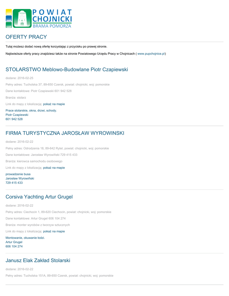 OFERTY PRACY Tutaj możesz dodać nową ofertę korzystając z przycisku po prawej stronie. Najświeższe oferty pracy znajdziesz także na stronie Powiatowego Urzędu Pracy w Chojnicach ( www.pupchojnice.pl) STOLARSTWO Meblowo-Budowlane Piotr Czapiewski dodane: 2016-02-25 Pełny adres: Tucholska 37, 89-650 Czersk, powiat: chojnicki, woj: pomorskie Dane kontaktowe: Piotr Czapiewski 601 942 528 Branża: stolarz Link do mapy z lokalizacją: pokaż na mapie Prace stolarskie, okna, drzwi, schody. Piotr Czapiewski 601 942 528 FIRMA TURYSTYCZNA JAROSŁAW WYROWINSKI dodane: 2016-02-22 Pełny adres: Odrodzenia 18, 89-642 Rytel, powiat: chojnicki, woj: pomorskie Dane kontaktowe: Jarosław Wyrowiñski 729 415 433 Branża: kierowca samochodu osobowego Link do mapy z lokalizacją: pokaż na mapie prowadzenie busa Jarosław Wyrowiñski 729 415 433 Corsiva Yachting Artur Grugel dodane: 2016-02-22 Pełny adres: Ciechocin 1, 89-620 Ciechocin, powiat: chojnicki, woj: pomorskie Dane kontaktowe: Artur Grugel 606 104 274 Branża: monter wyrobów z tworzyw sztucznych Link do mapy z lokalizacją: pokaż na mapie Montowanie, okuwanie łodzi. Artur Grugel 606 104 274 Janusz Elak Zakład Stolarski dodane: 2016-02-22 Pełny adres: Tucholska 151A, 89-650 Czersk, powiat: chojnicki, woj: pomorskie Dane kontaktowe: Janusz Elak 602 287 921 Branża: stolarz Link do mapy z lokalizacją: pokaż na mapie Obsługa maszyn stolarskich- montaż. Janusz Elak 602 287 921 Handel Hurtowy i Detaliczny Art.Spoż-Przemysł. Bożena Turzyñska dodane: 2016-02-22 Pełny adres: 1000-lecia 1a, 89-632 Brusy, powiat: chojnicki, woj: pomorskie Dane kontaktowe: Bożena Turzyñska 664 177 571 Branża: sprzedawca Link do mapy z lokalizacją: pokaż na mapie Sprzedaż art. Bożena Turzyñska 664 177 571 Auto- Handel "MARWES" Wesołowski Mariusz dodane: 2016-02-19 Pełny adres: 14 Lutego 92, 89-600 Chojnice, powiat: chojnicki, woj: pomorskie Dane kontaktowe: Mariusz Wesołowski 502 324 680 Branża: spedytor Link do mapy z lokalizacją: pokaż na mapie Prowadzenie kierowców, ustalanie tras przejazdów, ustalanie terminu rozładunku/załadunku, kontakt z firmami. Mariusz Wesołowski 502 324 680 Karol Sokołowski dodane: 2016-02-19 Pełny adres: Kr. Jadwigi 10, 89-650 Czersk, powiat: chojnicki, woj: pomorskie Dane kontaktowe: Małgorzata Kulas 515972009 Branża: fryzjer Link do mapy z lokalizacją: pokaż na mapie obsługa klientów Małgorzata Kulas 515972009 BAUSTOFF + METALL COLOR SP. Z O.O. dodane: 2016-02-19 Pełny adres: Kazimierza Pułaskiego 47, 85-619 Bydgoszcz, powiat: m. Bydgoszcz, woj: kujawsko-pomorskie Dane kontaktowe: Helena Klawa Branża: sprzedawca Link do mapy z lokalizacją: pokaż na mapie Sprzedaż towaru Helena Klawa Badford Continental Sp. z o.o. dodane: 2016-02-19 Pełny adres: Chłodna 9, 40-001 Katowice, powiat: m. Katowice, woj: śląskie Dane kontaktowe: EWA CZESAK 507130894 Branża: pozostałe pomoce i sprzątaczki biurowe, hotelowe i podobne Link do mapy z lokalizacją: pokaż na mapie sprzątanie pomieszczeñ handlowych, socjalnych, biurowych, toalet. EWA CZESAK 507130894 za pośrednictwem urzędu dodane: 2016-02-18 Pełny adres: Powiatowy Urząd Pracy w Człuchowie Jerzego z Dąbrowy 1a, 77-300 Człuchów, powiat: człuchowski, woj: pomorskie Dane kontaktowe: Elżbieta Hûbner 598343442 w. 258 Branża: pozostali robotnicy budowlani robót wykoñczeniowych i pokrewni gdzie indziej niesklasyfikowani Link do mapy z lokalizacją: pokaż na mapie klejenie tapet,malowanie,regipsy,układanie waty,wykoñczeniówka Elżbieta Hûbner 598343442 w. 258 PHU Szynwelska Monika dodane: 2016-02-18 Pełny adres: Rzepakowa 4/9, 89-604 Chojnice, powiat: chojnicki, woj: pomorskie Dane kontaktowe: Monika Szynwelska 609 109 080 Branża: kierowca samochodu ciężarowego Link do mapy z lokalizacją: pokaż na mapie prowadzenie pojazdu Monika Szynwelska 609 109 080 za pośrednictwem urzędu dodane: 2016-02-18 Pełny adres: Powiatowy Urząd Pracy w Chojnicach Lichnowska 5, 89-620 Chojnice, powiat: chojnicki, woj: pomorskie Dane kontaktowe: Mariusz Kniter 523950705 Branża: pomoc kuchenna Link do mapy z lokalizacją: pokaż na mapie pomoc w kuchni Mariusz Kniter 523950705 Zbigniew Jaszewski dodane: 2016-02-18 Pełny adres: Świętopełka 2, 89-632 Brusy, powiat: chojnicki, woj: pomorskie Dane kontaktowe: Zbigniew Jaszewski 52 3982212 Branża: sprzedawca Link do mapy z lokalizacją: pokaż na mapie Sprzedaż paliw art. pozostałych. Zbigniew Jaszewski 52 3982212 PPHU "WINDEX" Aszyk Mirela dodane: 2016-02-18 Pełny adres: Towarowa 8, 89-620 Chojnice, powiat: chojnicki, woj: pomorskie Dane kontaktowe: Mirela Aszyk 52 396 77 20 Branża: lakiernik Link do mapy z lokalizacją: pokaż na mapie malowanie pojazdów i urządzeñ wraz z przygotowaniem Mirela Aszyk 52 396 77 20 za pośrednictwem urzędu dodane: 2016-02-17 Pełny adres: Powiatowy Urząd Pracy w Chojnicach Lichnowska 5, 89-620 Chojnice, powiat: chojnicki, woj: pomorskie Dane kontaktowe: Barbara Kitowska 52 3950705 Branża: kierowca operator wózków jezdniowych (widłowych) Link do mapy z lokalizacją: pokaż na mapie Załadunek i rozładunek towarów. Barbara Kitowska 52 3950705