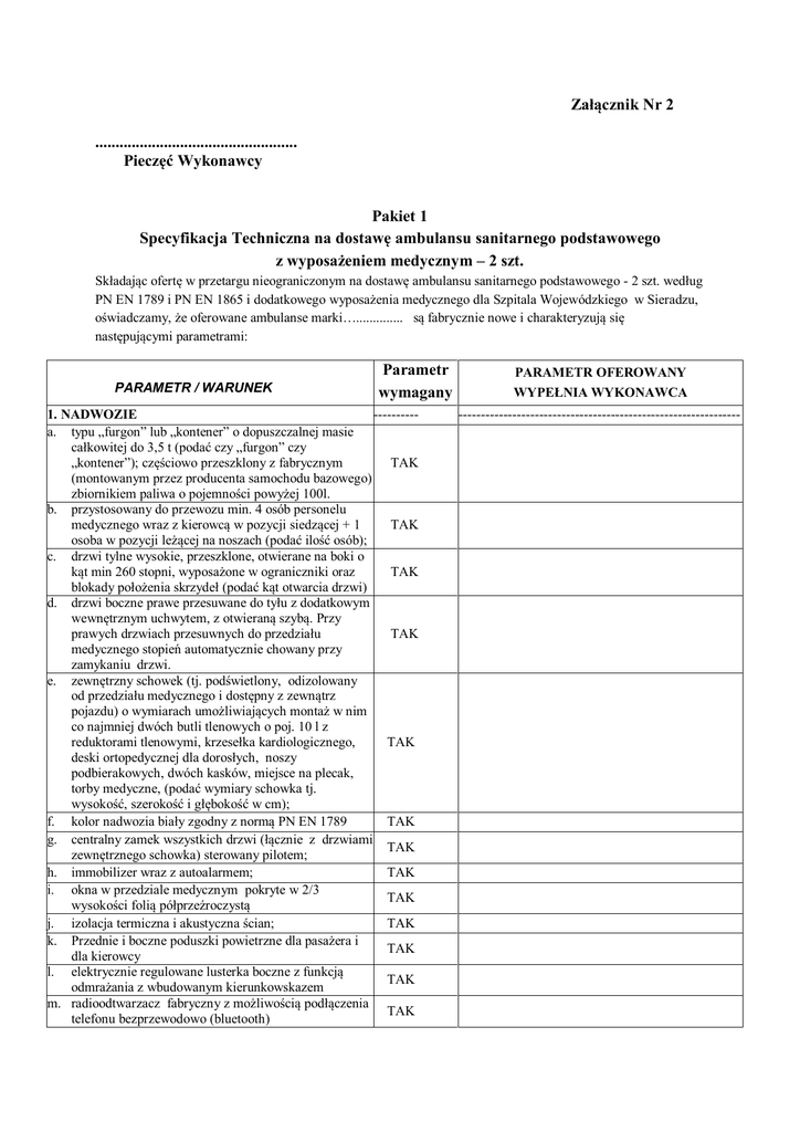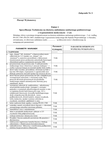 Załącznik Nr 2 .................................................. Pieczęć Wykonawcy Pakiet 1 Specyfikacja Techniczna na dostawę ambulansu sanitarnego podstawowego z wyposażeniem medycznym – 2 szt. Składając ofertę w przetargu nieograniczonym na dostawę ambulansu sanitarnego podstawowego - 2 szt. według PN EN 1789 i PN EN 1865 i dodatkowego wyposażenia medycznego dla Szpitala Wojewódzkiego w Sieradzu, oświadczamy, że oferowane ambulanse marki….............. są fabrycznie nowe i charakteryzują się następującymi parametrami: PARAMETR / WARUNEK Parametr wymagany ---------1. NADWOZIE a. typu „furgon” lub „kontener” o dopuszczalnej masie całkowitej do 3,5 t (podać czy „furgon” czy „kontener”); częściowo przeszklony z fabrycznym TAK (montowanym przez producenta samochodu bazowego) zbiornikiem paliwa o pojemności powyżej 100l. b. przystosowany do przewozu min. 4 osób personelu medycznego wraz z kierowcą w pozycji siedzącej + 1 TAK osoba w pozycji leżącej na noszach (podać ilość osób); c. drzwi tylne wysokie, przeszklone, otwierane na boki o kąt min 260 stopni, wyposażone w ograniczniki oraz TAK blokady położenia skrzydeł (podać kąt otwarcia drzwi) d. drzwi boczne prawe przesuwane do tyłu z dodatkowym wewnętrznym uchwytem, z otwieraną szybą. Przy prawych drzwiach przesuwnych do przedziału TAK medycznego stopień automatycznie chowany przy zamykaniu drzwi. e. zewnętrzny schowek (tj. podświetlony, odizolowany od przedziału medycznego i dostępny z zewnątrz pojazdu) o wymiarach umożliwiających montaż w nim co najmniej dwóch butli tlenowych o poj. 10 l z reduktorami tlenowymi, krzesełka kardiologicznego, TAK deski ortopedycznej dla dorosłych, noszy podbierakowych, dwóch kasków, miejsce na plecak, torby medyczne, (podać wymiary schowka tj. wysokość, szerokość i głębokość w cm); f. kolor nadwozia biały zgodny z normą PN EN 1789 TAK g. centralny zamek wszystkich drzwi (łącznie z drzwiami TAK zewnętrznego schowka) sterowany pilotem; h. immobilizer wraz z autoalarmem; TAK i. okna w przedziale medycznym pokryte w 2/3 TAK wysokości folią półprzeźroczystą j. izolacja termiczna i akustyczna ścian; TAK k. Przednie i boczne poduszki powietrzne dla pasażera i TAK dla kierowcy l. elektrycznie regulowane lusterka boczne z funkcją TAK odmrażania z wbudowanym kierunkowskazem m. radioodtwarzacz fabryczny z możliwością podłączenia TAK telefonu bezprzewodowo (bluetooth) PARAMETR OFEROWANY WYPEŁNIA WYKONAWCA --------------------------------------------------------------- n. wyposażony w fabryczne reflektory przednie z funkcją doświetlania zakrętów oraz przednie światła TAK przeciwmgielne ---------2. SILNIK I NAPĘD a.Turbodisel o pojemności min 2000cm³ max 2500cm³ spełniający wymagania normy Euro 5b+ lub wyższej z TAK manualną synchronizowaną skrzynią biegów (min 6 przełożeń – podać ilość biegów ) b. moc silnika minimum 160 KM (podać moc w KM TAK oferowanego silnika oraz moment obrotowy w Nm); c. napęd wałka rozrządu za pomocą łańcucha TAK d. ASR – System zapobiegający poślizgowi kół osi TAK napędzanej e. System elektronicznej stabilizacji toru jazdy TAK ---------3. UKŁAD HAMULCOWY a. z systemem ABS zapobiegającym blokadzie kół podczas hamowania wraz z elektronicznym korektorem TAK siły hamowania. TAK b. Z systemem rozdziału siły hamowania TAK c. z systemem wspomagania nagłego hamowania ---------4. UKŁAD KIEROWNICZY a. ze wspomaganiem; TAK 5. OGRZEWANIE I WENTYLACJA PRZEDZIAŁU ---------MEDYCZNEGO a. ogrzewanie przedziału medycznego cieczą chłodzącą TAK silnik – nagrzewnica w przedziale medycznym; b. ogrzewanie postojowe przedziału medycznegogrzejnik elektryczny z sieci 230V z możliwością ustawienia temperatury i termostatem o mocy min. 2,0 TAK kW (podać markę i model oraz moc oferowanego urządzenia); c. niezależny od pracy silnika system ogrzewania przedziału kierowcy i przedziału medycznego, umożliwiający niezależne ogrzanie silnika przed TAK rozruchem, ogrzanie kabiny kierowcy i przedziału medycznego z możliwością ustawienia temperatury i termostatem (podać markę i model urządzenia); d. mechaniczna wentylacja nawiewno- wywiewna o cyrkulacji min. 20x/godzinę (podać wydajność w TAK m3/godzinę) e. dwuparownikowa klimatyzacja przedziału sanitarnego i kabiny kierowcy, z niezależną regulacją siły nawiewu zimnego powietrza dla kabiny kierowcy i przedziału medycznego; TAK ---------6. INSTALACJA ELEKTRYCZNA a. zasilanie zewnętrzne 230V z min. 2 gniazdami wewnętrznymi ( z bezpiecznikami ) w przedziale medyczny z zabezpieczeniem uniemożliwiającym rozruch silnika przy TAK podłączonym zasilaniu zewnętrznym i z zabezpieczeniem przeciwporażeniowym różnicowo - prądowym (podać ilość gniazd 230V); b. automatyczna ładowarka akumulatorowa 12V umożliwiająca jednoczesne ładowanie dwóch akumulatorów TAK (podać markę i model ładowarki); --------------------------------------------------------------- --------------------------------------------------------------- ----------------------------------------------------------------------------------------------------------------------------- --------------------------------------------------------------- c. min. 3 gniazda 12V w przedziale medycznym, do podłączenia urządzeń medycznych, zabezpieczone przed TAK zabrudzeniem , wyposażone we wtyki (podać ilość gniazd 12V); d. wzmocniony alternator min 180 A TAK e. dwa akumulatory o łącznej pojemności min 160Ah jeden do rozruchu silnika, drugi do zasilania przedziału medycznego, połączone tak że są doładowywane zarówno z alternatora w czasie pracy silnika jak i z prostownika na TAK postoju po podłączeniu zasilania z sieci 230V. z widoczną sygnalizacją właściwego działania prostownika ładującego akumulatory na postoju. f. reflektory zewnętrzne typu LED z trzech stron pojazdu ( tył, boki) do oświetlenia miejsc
