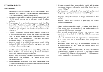 DYNAMIKA – ZADANIA Siły i równowaga 1. Przedstaw graficznie siłę o wartości 6000 N i siłę o wartości 10 kN zakładając, że sile o wartości 1000 N odpowiada odcinek o długości 1 cm. Siły mają kierunek poziomy i zwrot w lewo. 2. Jakie wartości może mieć wypadkowa dwóch sił o wartościach 10 N i 40 N, których wektory leżą na tej samej prostej? Przedstaw graficznie. 3. Na poruszający się po poziomej szosie autobus działa siła silnika równa 1,5 kN. Wartość siły tarcia kół asfalt wynosi 0,6 kN, zaś siła oporu powietrza ma wartość 0,5 kN. Ile wynosi wartość wypadkowej tych wszystkich sił? Przedstaw na rysunku samochód i wektory sił. 4. Chłopiec o ciężarze 450 N trzyma w ręku kamień o ciężarze 50 N. Ile wynosi wartość siły, którą działają nogi chłopca na powierzchnię Ziemi? Ile wynosi wartość siły, którą działa powierzchnia Ziemi na nogi chłopca i jaki jest jej kierunek i zwrot? Ile w przybliżeniu wynosi masa chłopca a ile masa kamienia? 5. Sportowiec o masie 60 kg podniósł do góry sztangę o masie 120 kg. Jak dużą siłą działa powierzchnia Ziemi na nogi sportowca w czasie powolnego podnoszenia tej sztangi. 6. Kawałek miedzi o objętości 5 dm3 ma masę 44,5 kg, zaś kawałek złota o objętości 2 cm3 ma masę 38,6 g. Ile razy w przybliżeniu gęstość złota jest większa od gęstości miedzi? 7. Wyznacz masę kry lodowej w kształcie prostopadłościanu, której długość wynosi 2,5 m, szerokość 1,2 m i grubość 40 cm. Gęstość lodu wynosi 900 kg/m3. 8. Silny uczeń szkoły podstawowej może unieść ciało o masie 50 kg. Czy podniesie on naczynie o pojemności 5 litrów wypełnione rtęcią? Gęstość rtęci wynosi 13 600 kg/m3. 9. Wyznacz pojemność baku samochodu (w litrach), jeśli do niego można nalać benzynę o maksymalnej masie 35 kg. Gęstość benzyny wynosi 700 kg/m3. 10. Pręt aluminiowy o przekroju 1 cm2 ma masę 0,81 kg. Ile wynosi długość tego pręta? Gęstość aluminium wynosi 2700 kg/m3. 11. Narysuj i nazwij siły działające na leżącą nieruchomo na stole książkę. 12. Narysuj i nazwij siły działające na poruszający się ruchem jednostajnym samochód. 13. Jakie przyspieszenie ma ciało o masie 2 kg na które działa siła 10 N? 14. Ciało porusza się z przyspieszeniem 5 m/s2 pod działaniem siły o wartości 30 N. Ile wynosi masa ciała? 15. Ciało uzyskuje przyspieszenie 0,6 m/s2 pod wpływem dwóch przeciwnie zwróconych sił: F1 = 240 N i F2 = 60 N. Ile wynosi masa tego ciała? 16. Ciało pod działaniem siły F1 = 5 N porusza się z przyspieszeniem a1 = 3 m/s2. Jaka siła F2 nadałaby temu ciału przyspieszenie a2 = 4,8 m/s2? 17. Nieruchoma piłka o masie 600 g po uderzeniu nogą poruszała się z przyspieszeniem 600 m/s2. Jaka była średnia wartość siły uderzenia nogi w piłkę? 18. Ciało o masie 3 kg pod działaniem dwóch sił, których wektory leżą na jednej prostej, uzyskuje przyspieszenie 12 m/s2. Jedna z tych sił F1 ma wartość 6 N. Jaką wartość ma druga siła F2 i jaki ma zwrot zgodny czy przeciwny do zwrotu siły F1?