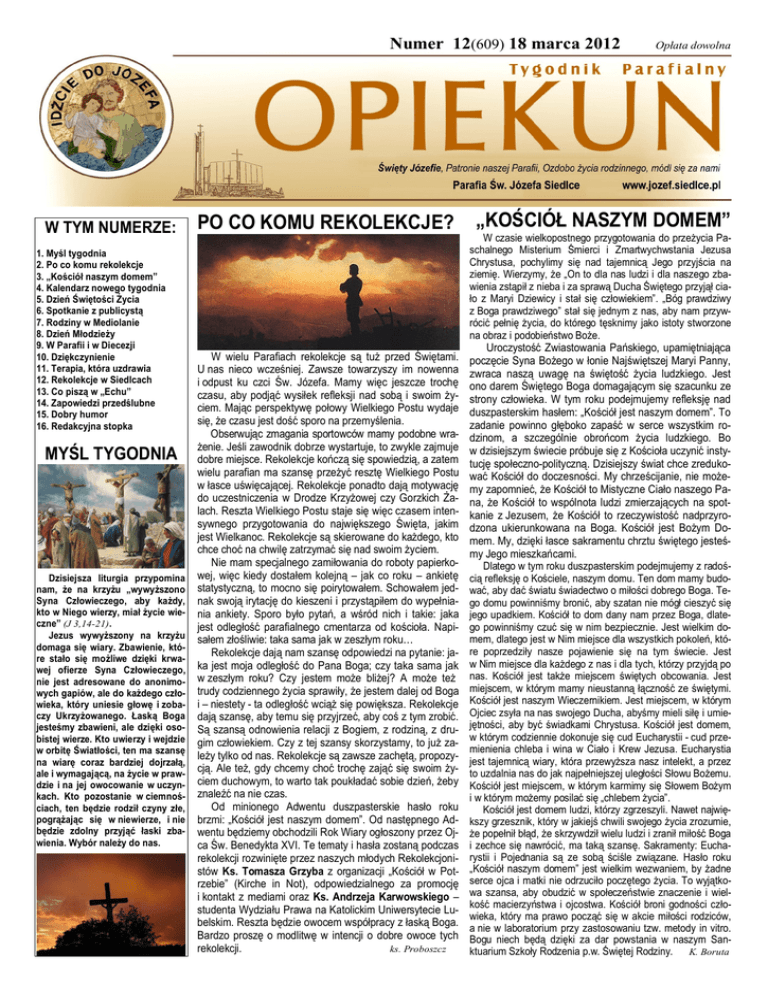 Numer 12(609) 18 marca 2012 W TYM NUMERZE: 1. Myśl tygodnia 2. Po co komu rekolekcje 3. „Kościół naszym domem” 4. Kalendarz nowego tygodnia 5. Dzień Świętości Życia 6. Spotkanie z publicystą 7. Rodziny w Mediolanie 8. Dzień Młodzieży 9. W Parafii i w Diecezji 10. Dziękczynienie 11. Terapia, która uzdrawia 12. Rekolekcje w Siedlcach 13. Co piszą w „Echu” 14. Zapowiedzi przedślubne 15. Dobry humor 16. Redakcyjna stopka MYŚL TYGODNIA Dzisiejsza liturgia przypomina nam, że na krzyżu „wywyższono Syna Człowieczego, aby każdy, kto w Niego wierzy, miał życie wieczne” (J 3,14-21). Jezus wywyższony na krzyżu domaga się wiary. Zbawienie, które stało się możliwe dzięki krwawej ofierze Syna Człowieczego, nie jest adresowane do anonimowych gapiów, ale do każdego człowieka, który uniesie głowę i zobaczy Ukrzyżowanego. Łaską Boga jesteśmy zbawieni, ale dzięki osobistej wierze. Kto uwierzy i wejdzie w orbitę Światłości, ten ma szansę na wiarę coraz bardziej dojrzałą, ale i wymagającą, na życie w prawdzie i na jej owocowanie w uczynkach. Kto pozostanie w ciemnościach, ten będzie rodził czyny złe, pogrążając się w niewierze, i nie będzie zdolny przyjąć łaski zbawienia. Wybór należy do nas. PO CO KOMU REKOLEKCJE? W wielu Parafiach rekolekcje są tuż przed Świętami. U nas nieco wcześniej. Zawsze towarzyszy im nowenna i odpust ku czci Św. Józefa. Mamy więc jeszcze trochę czasu, aby podjąć wysiłek refleksji nad sobą i swoim życiem. Mając perspektywę połowy Wielkiego Postu wydaje się, że czasu jest dość sporo na przemyślenia. Obserwując zmagania sportowców mamy podobne wrażenie. Jeśli zawodnik dobrze wystartuje, to zwykle zajmuje dobre miejsce. Rekolekcje kończą się spowiedzią, a zatem wielu parafian ma szansę przeżyć resztę Wielkiego Postu w łasce uświęcającej. Rekolekcje ponadto dają motywację do uczestniczenia w Drodze Krzyżowej czy Gorzkich Żalach. Reszta Wielkiego Postu staje się więc czasem intensywnego przygotowania do największego Święta, jakim jest Wielkanoc. Rekolekcje są skierowane do każdego, kto chce choć na chwilę zatrzymać się nad swoim życiem. Nie mam specjalnego zamiłowania do roboty papierkowej, więc kiedy dostałem kolejną – jak co roku – ankietę statystyczną, to mocno się poirytowałem. Schowałem jednak swoją irytację do kieszeni i przystąpiłem do wypełniania ankiety. Sporo było pytań, a wśród nich i takie: jaka jest odległość parafialnego cmentarza od kościoła. Napisałem złośliwie: taka sama jak w zeszłym roku… Rekolekcje dają nam szansę odpowiedzi na pytanie: jaka jest moja odległość do Pana Boga; czy taka sama jak w zeszłym roku? Czy jestem może bliżej? A może też trudy codziennego życia sprawiły, że jestem dalej od Boga i – niestety - ta odległość wciąż się powiększa. Rekolekcje dają szansę, aby temu się przyjrzeć, aby coś z tym zrobić. Są szansą odnowienia relacji z Bogiem, z rodziną, z drugim człowiekiem. Czy z tej szansy skorzystamy, to już zależy tylko od nas. Rekolekcje są zawsze zachętą, propozycją. Ale też, gdy chcemy choć trochę zająć się swoim życiem duchowym, to warto tak poukładać sobie dzień, żeby znaleźć na nie czas. Od minionego Adwentu duszpasterskie hasło roku brzmi: „Kościół jest naszym domem”. Od następnego Adwentu będziemy obchodzili Rok Wiary ogłoszony przez Ojca Św. Benedykta XVI. Te tematy i hasła zostaną podczas rekolekcji rozwinięte przez naszych młodych Rekolekcjonistów Ks. Tomasza Grzyba z organizacji „Kościół w Potrzebie” (Kirche in Not), odpowiedzialnego za promocję i kontakt z mediami oraz Ks. Andrzeja Karwowskiego – studenta Wydziału Prawa na Katolickim Uniwersytecie Lubelskim. Reszta będzie owocem współpracy z łaską Boga. Bardzo proszę o modlitwę w intencji o dobre owoce tych rekolekcji. ks. Proboszcz Opłata dowolna „KOŚCIÓŁ NASZYM DOMEM” W czasie wielkopostnego przygotowania do przeżycia Paschalnego Misterium Śmierci i Zmartwychwstania Jezusa Chrystusa, pochylimy się nad tajemnicą Jego przyjścia na ziemię. Wierzymy, że „On to dla nas ludzi i dla naszego zbawienia zstąpił z nieba i za sprawą Ducha Świętego przyjął ciało z Maryi Dziewicy i stał się człowiekiem”. „Bóg prawdziwy z Boga prawdziwego” stał się jednym z nas, aby nam przywrócić pełnię życia, do którego tęsknimy jako istoty stworzone na obraz i podobieństwo Boże. Uroczystość Zwiastowania Pańskiego, upamiętniająca poczęcie Syna Bożego w łonie Najświętszej Maryi Panny, zwraca naszą uwagę na świętość życia ludzkiego. Jest ono darem Świętego Boga domagającym się szacunku ze strony człowieka. W tym roku podejmujemy refleksję nad duszpasterskim hasłem: „Kościół jest naszym domem”. To zadanie powinno głęboko zapaść w serce wszystkim rodzinom, a szczególnie obrońcom życia ludzkiego. Bo w dzisiejszym świecie próbuje się z Kościoła uczynić instytucję społeczno-polityczną. Dzisiejszy świat chce zredukować Kościół do doczesności. My chrześcijanie, nie możemy zapomnieć, że Kościół to Mistyczne Ciało naszego Pana, że Kościół to wspólnota ludzi zmierzających na spotkanie z Jezusem, że Kościół to rzeczywistość nadprzyrodzona ukierunkowana na Boga. Kościół jest Bożym Domem. My, dzięki łasce sakramentu chrztu świętego jesteśmy Jego mieszkańcami. Dlatego w tym roku duszpasterskim podejmujemy z radością refleksję o Kościele, naszym domu. Ten dom mamy budować, aby dać światu świadectwo o miłości dobrego Boga. Tego domu powinniśmy bronić, aby szatan nie mógł cieszyć się jego upadkiem. Kościół to dom dany nam przez Boga, dlatego powinniśmy czuć się w nim bezpiecznie. Jest wielkim domem, dlatego jest w Nim miejsce dla wszystkich pokoleń, które poprzedziły nasze pojawienie się na tym świecie. Jest w Nim miejsce dla każdego