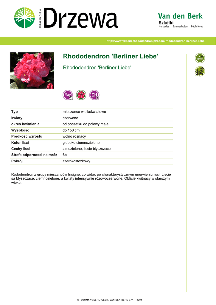 http://www.vdberk-rhododendron.pl/boom/rhododendron-berliner-liebe Rhododendron 'Berliner Liebe' Rhododendron 'Berliner Liebe' Typ mieszance wielkokwiatowe kwiaty czerwone okres kwitnienia od poczatku do polowy maja Wysokosc do 150 cm Predkosc wzrostu wolno rosnacy Kolor lisci gleboko ciemnozielone Cechy lisci zimozielone, liscie blyszczace Strefa odpornosci na mróz 6b Pokrój szerokostozkowy Rododendron z grupy mieszanców Insigne, co widac po charakterystycznym unerwieniu lisci. Liscie sa blyszczace, ciemnozielone, a kwiaty intensywnie rózowoczerwone. Obficie kwitnacy w starszym wieku.