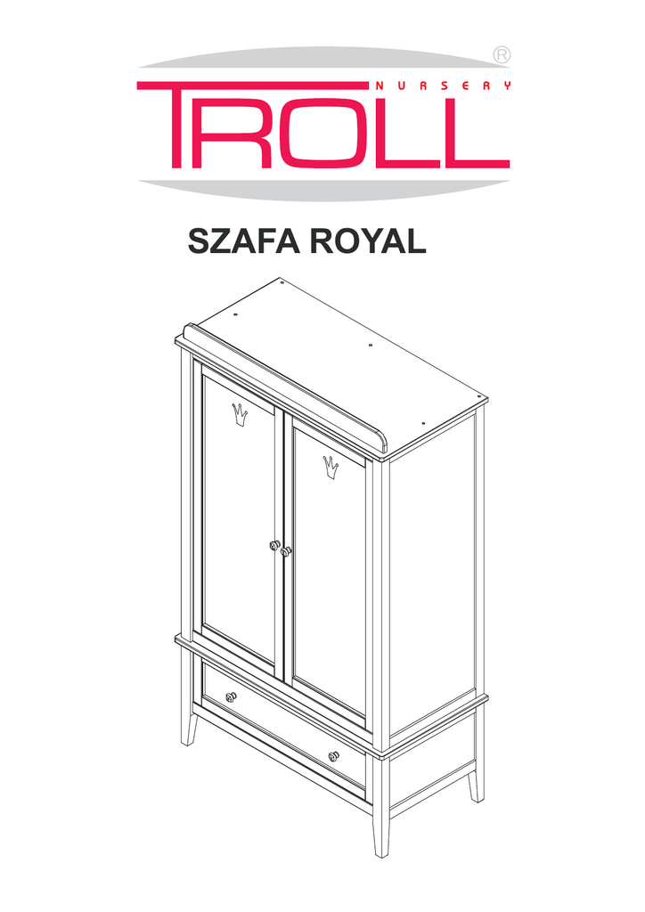 SZAFA ROYAL LISTA CZĘŚCI A x 14 D2 x 4 L = 34mm B x 14 Hx1 O x 16 L = 30mm E x 14 C x 46 Kx4 WALL FIXING KIT L = 50mm Lx4 I x 11 Mx4 L = 15mm Px4 Fx1 L = 30mm D1 x 2 L = 40mm G x 12 J x 43 Qx2 Nx4 S I G U L D A INSTRUKCJA MONTAŻU A=4 C=8 Ex6 C=4 B=4 F 1. 2. L = 50mm S I G U L D A INSTRUKCJA MONTAŻU 3. C=8 4. F Ex8 L = 50mm E F C C=14 A=2 B=2 D2=2 L=30mm D2 L=4 F L C S I G U L D A INSTRUKCJA MONTAŻU 5. UWAGA! Upewnij się, że śruby mocujące tylną ścianę wkręcane są centralnie. Przy krawędziach poprowadź śrubę pod kątem 5-10 st. na zewnątrz. J=43 L = 20mm I=11 INSTRUKCJA MONTAŻU 6. A=8 K=2 B=8 C=8 D2=2 L=30mm O 7. D1 O N K 2x O=8 D1=2 K=2 N=4 S I G U L D A L = 40mm L = 15mm INSTRUKCJA MONTAŻU O=8 G=12 M=4 Px4 Qx2 L = 15mm 8. M G G R O P O S I G U L D A INSTRUKCJA MONTAŻU 9. C=4 S I G U L D A INSTRUKCJA MONTAŻU DO ŚCIANY 1. Ustaw szafę w wybranej pozycji. Zaznacz środek górnej krawędzi szafy na ścianie. 2. Przymocuj pasek do ściany jak na rysunku. Upewnij się, że użyte zostaną właściwe śruby a ściana do której mebel zostanie przymocowany jest odpowiednia. 3. Używając śruby do drewna i podkładki przymocuj pasek pod górną płytą szafy. Uwaga: Upewnij się, że pasek z dwóch stron jest bezpiecznie zamocowany. Mocowania powinna dokonywać wyłącznie osoba kompetentna. Niewłaściwe zamocowanie może być niebezpieczne. Upewnij się, że ściana jest odpowiednia do montażu i wytrzyma siły wywołane przez mebel. S I G U L D A ZANIM ZACZNIESZ Wyjmij wszystkie części z opakowania i sprawdź ich zgodność z listą. Nie wyrzucaj opakowania zanim będziesz miał(a) pewność, że posiadasz wszystkie części i okucia. INSTRUKCJA BEZPIECZEŃSTWA - OSTRZEŻENIA Upewnij się, że śruby i opakowania znajdują się w bezpiecznej odległości od dzieci. Trzymaj dzieci z daleka podczas montażu. Nie używaj szafy, jeżeli stwierdzisz brak lub uszkodzenie którejkolwiek z części. Nie stawiaj na nierównym podłożu. Bądź świadom ryzyka jakie niesie za sobą otwarty ogień albo inne źródła ciepła takie jak promienniki elektryczne bądź gazowe. Nie stawiaj szafy w ich bliskim sąsiedztwie. Należy zadbać aby wszystkie śruby były dokręcone a części należycie zamontowane, tak aby uniemożliwić zahaczenie się części ciała dziecka lub części jego ubrania. INSTRUKCJA UŻYTKOWANIA Sprawdzaj regularnie wszystkie elementy szafy, aby mieć pewność że wszystkie jej części są należycie zamocowane. Nie używaj szafy, jeżeli stwierdzisz brak lub uszkodzenie którejkolwiek z części. Jeżeli nie używasz szafy, przechowuj w suchym i wentylowanym pomieszczeniu. Używaj wyłącznie części dostarczonych przez Troll Nursery. W celu długiego i bezproblemowego użytkowania szafy postępuj zgodnie z instrukcją Jeżeli ktoś inny używa szafy, upewnij się, że zna jej obsługę. Zapewnienie bezpieczeństwa dziecku jest twoim obowiązkiem. S I G U L D A