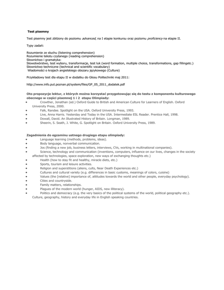 Test pisemny Test pisemny jest zbliżony do poziomu advanced, na I etapie konkursu oraz poziomu proficiency na etapie II. Typy zadań: Rozumienie ze słuchu (listening comprehension) Rozumienie tekstu czytanego (reading comprehension) Słownictwo i gramatyka: Słowotwórstwo, test wyboru, transformacje, test luk (word formation, multiple choice, transformations, gap fillingetc.) Słownictwo techniczne (technical and scientific vocabulary) Wiadomości o krajach angielskiego obszaru językowego (Culture) Przykładowy test dla etapu II w dodatku do Głosu Politechniki maj 2011: http://www.info.put.poznan.pl/system/files/GP_05_2011_dodatek.pdf Oto propozycje lektur, z których można korzystać przygotowując się do testu z komponentu kulturowego obecnego w części pisemnej 1 i 2 etapu Olimpiady: Crowther, Jonathan (ed.) Oxford Guide to British and American Culture for Learners of English. Oxford University Press, 2000. Falk, Randee. Spotlight on the USA. Oxford University Press, 1993. Live, Anna Harris. Yesterday and Today in the USA. Intermediate ESL Reader. Prentice Hall, 1998. Dowall, David. An Illustrated History of Britain. Longman, 1989. Sheerin, S. Seath, J. White, G. Spotlight on Britain. Oxford University Press, 1989. Zagadnienia do egzaminu ustnego drugiego etapu olimpiady: Language learning (methods, problems, ideas). Body language, nonverbal communication. Jos (finding a new job, business letters, interviews, CVs, working in multinational companies). Science, technology and communication (inventions, computers, influence on our lives, changes in the society affected by technologies, space exploration, new ways of exchanging thoughts etc.) Health (how to stay fit and healthy, miracle diets, etc.) Sports, tourism and leisure activities. Religion and superstitions (aliens, cults, Near Death Experiences etc.) Cultures and cultural variety (e.g. differences in basic customs, meanings of colors, cuisine) Values (the [relative] importance of, attitudes towards the world and other people, everyday psychology). Cities and countryside. Family matters, relationships. Plagues of the modern world (hunger, AIDS, new illiteracy). Politics and democracy (e.g. the very basics of the political systems of the world, political geography etc.). Culture, geography, history and everyday life in English speaking countries.