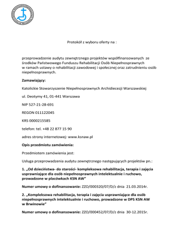 Protokół z wyboru oferty na : przeprowadzenie audytu zewnętrznego projektów współfinansowanych ze środków Państwowego Funduszu Rehabilitacji Osób Niepełnosprawnych w ramach ustawy o rehabilitacji zawodowej i społecznej oraz zatrudnieniu osób niepełnosprawnych. Zamawiający: Katolickie Stowarzyszenie Niepełnosprawnych Archidiecezji Warszawskiej ul. Deotymy 41, 01-441 Warszawa NIP 527-21-28-691 REGON 011122045 KRS 0000215585 telefon: tel. +48 22 877 15 90 adres strony internetowej: www.ksnaw.pl Opis przedmiotu zamówienia: Przedmiotem zamówienia jest: Usługa przeprowadzenia audytu zewnętrznego następujących projektów pn.: 1. „Od dzieciństwa- do starości- kompleksowa rehabilitacja, terapia i zajęcia usprawniające dla osób niepełnosprawnych intelektualnie i ruchowo, prowadzone w placówkach KSN AW” Numer umowy o dofinansowanie: ZZO/000320/07/D/z dnia 21.03.2014r. 2. „Kompleksowa rehabilitacja, terapia i zajęcia usprawniające dla osób niepełnosprawnych intelektualnie i ruchowo, prowadzone w DPS KSN AW w Brwinowie” Numer umowy o dofinansowanie: ZZO/000452/07/D/z dnia 30-12.2015r. W dniu 02-01-2016 na stronie internetowej www.ksnaw.pl zamieszczono ogłoszenie- zapytanie ofertowe ,oraz wysłano do następujących oferentów: 1. BIURO AUDYTORSKIE SADREN Sp. z o.o. ul. Srebrna 16 00-810 Warszawa 2. PERFECTA AUDIT SERVICES SP Z O.O. ul. Grójecka 38 02-314 Warszawa 3. VERUM AUDYT ul. Radziwie 7/529 01-164 Warszawa 4. PERFECTUM-AUDIT Doradcy Podatkowo-Księgowi Sp. z o.o. al. Komisji Edukacji Narodowej 98 02-777 Warszawa W zawiązku z zapytaniem wpłynęły następujące oferty : Lp. Data i godzina wpływu Imię nazwisko/Nazwa firmy Cena usługi brutto 1 13.01.2017r. godz.13.30 PERFECTUM-AUDIT Doradcy PodatkowoKsięgowi Sp. z o.o. al. Komisji Edukacji Narodowej 98 11 500,00 02-777 Warszawa Uwagi 1. „Od dzieciństwa- do starości- kompleksowa rehabilitacja, terapia i zajęcia usprawniające dla osób niepełnosprawnych intelektualnie i ruchowo, prowadzone w placówkach KSN AW’ 8 000,00 brutto 2. „Kompleksowa rehabilitacja, terapia i zajęcia usprawniające dla osób niepełnosprawnych intelektualnie i ruchowo, prowadzone w DPS KSN AW w Brwinowie’ 3 500,00 brutto 2 16.01.2017r. godz.14.20 IDEA AUDYT Sp. z o.o. ul. Leszczyńska 54 6 273,00 Oferta nie spełnia wymogów postawionych w zapytaniu ofertowym 60-103 Poznań 1. „Od dzieciństwa- do starości- kompleksowa rehabilitacja, terapia i zajęcia usprawniające dla osób niepełnosprawnych intelektualnie i ruchowo, prowadzone w placówkach KSN AW’ 6 273,00 brutto 3 16.01.2017r. godz.14.20 Audmax Błażej Biliński ul. Orzechowa 2, Królikowie 11 070,00 55-040 Kobierzyce 1. „Od dzieciństwa- do starości- kompleksowa rehabilitacja, terapia i zajęcia usprawniające dla osób niepełnosprawnych intelektualnie i ruchowo, prowadzone w placówkach KSN AW’ 5 535,00 brutto 2. „Kompleksowa rehabilitacja, terapia i zajęcia usprawniające dla osób niepełnosprawnych intelektualnie i ruchowo, prowadzone w DPS KSN AW w Brwinowie’ 5 535,00 brutto 4 16.01.2017r. godz.14.20 MaxFinanse Sp. z o.o. ul. Składowa 10 4 980,00 19-400 Olecko 1. „Od dzieciństwa- do starości- kompleksowa rehabilitacja, terapia i zajęcia usprawniające dla osób niepełnosprawnych intelektualnie i ruchowo, prowadzone w placówkach KSN AW’ 2 490,00 brutto 2. „Kompleksowa rehabilitacja, terapia i zajęcia usprawniające dla osób niepełnosprawnych intelektualnie i ruchowo, prowadzone w DPS KSN AW w Brwinowie’ 2 490,00 brutto 5 17.01.2017r. godz.14.00 BIURO AUDYTORSKIE SADREN Sp. z o.o. ul. Srebrna 16 7 800,00 00-810 Warszawa 1. „Od dzieciństwa- do starości- kompleksowa rehabilitacja, terapia i zajęcia usprawniające dla osób niepełnosprawnych intelektualnie i ruchowo, prowadzone w placówkach KSN AW’ 5 200,00 brutto 2. „Kompleksowa rehabilitacja, terapia i zajęcia usprawniające dla osób niepełnosprawnych intelektualnie i ruchowo, prowadzone w DPS KSN AW w Brwinowie’ 2 600,00 brutto 6 17.01.2017r. godz.14.04 AZAS Sp. z o.o. BIEGLI REWIDENCI Al. Wojska 4 870,80 1. „Od dzieciństwa- do starości- kompleksowa rehabilitacja, terapia i zajęcia Polskiego 65/66 Ip. usprawniające dla osób niepełnosprawnych intelektualnie i ruchowo, prowadzone w placówkach KSN AW’ 2 435,40 brutto 10-292 Olsztyn 2. „Kompleksowa rehabilitacja, terapia i zajęcia usprawniające dla osób niepełnosprawnych intelektualnie i ruchowo, prowadzone w DPS KSN AW w Brwinowie’ 2 435,40 brutto 7 18.01.2017r. godz.12.21 Biuro audytu 5 948,28 Anna Ziembicka 36-042 Lubenia 4 1. „Od dzieciństwa- do starości- kompleksowa rehabilitacja, terapia i zajęcia usprawniające dla osób niepełnosprawnych intelektualnie i ruchowo, prowadzone w placówkach KSN AW’ 3 488,28 brutto 2. „Kompleksowa rehabilitacja, terapia i zajęcia usprawniające dla osób niepełnosprawnych intelektualnie i ruchowo, prowadzone w DPS KSN AW w Brwinowie’ 2 460,00 brutto 8 19.01.2017r. godz.8.33 Międzynarodowe Centrum Szkolenia i Doradztwa Sp. z o.o. ul. Świętojerska 5/7 6 888,00 00-236 Warszawa 1. „Od dzieciństwa- do starości- kompleksowa rehabilitacja, terapia i zajęcia usprawniające dla osób niepełnosprawnych intelektualnie i ruchowo, prowadzone w placówkach KSN AW’ 3 813,00 brutto 2. „Kompleksowa rehabilitacja, terapia i zajęcia usprawniające dla osób niepełnosprawnych intelektualnie i ruchowo, prowadzone w DPS KSN AW w Brwinowie’ 3 075,00 brutto 9 19.01.2017r. godz.13.05 Adrianna Sudomirska ul. Podhalańska 10/11 85-132 Bydgoszcz 6 940,00 1. „Od dzieciństwa- do starości- kompleksowa rehabilitacja, terapia i zajęcia usprawniające dla osób niepełnosprawnych