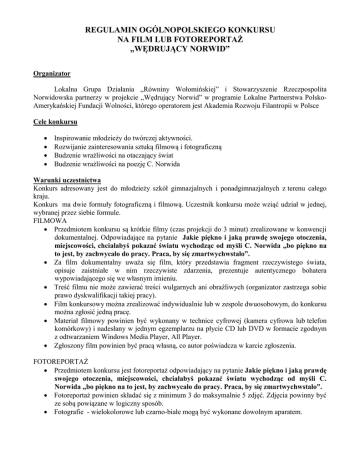 REGULAMIN OGÓLNOPOLSKIEGO KONKURSU NA FILM LUB FOTOREPORTAŻ „WĘDRUJĄCY NORWID” Organizator Lokalna Grupa Działania „Równiny Wołomińskiej” i Stowarzyszenie Rzeczpospolita Norwidowska partnerzy w projekcie „Wędrujący Norwid” w programie Lokalne Partnerstwa PolskoAmerykańskiej Fundacji Wolności, którego operatorem jest Akademia Rozwoju Filantropii w Polsce Cele konkursu Inspirowanie młodzieży do twórczej aktywności. Rozwijanie zainteresowania sztuką filmową i fotograficzną Budzenie wrażliwości na otaczający świat Budzenie wrażliwości na poezję C. Norwida Warunki uczestnictwa Konkurs adresowany jest do młodzieży szkół gimnazjalnych i ponadgimnazjalnych z terenu całego kraju. Konkurs ma dwie formuły fotograficzną i filmową. Uczestnik konkursu może wziąć udział w jednej, wybranej przez siebie formule. FILMOWA Przedmiotem konkursu są krótkie filmy (czas projekcji do 3 minut) zrealizowane w konwencji dokumentalnej. Odpowiadające na pytanie Jakie piękno i jaką prawdę swojego otoczenia, miejscowości, chciałabyś pokazać światu wychodząc od myśli C. Norwida „bo piękno na to jest, by zachwycało do pracy. Praca, by się zmartwychwstało”. Za film dokumentalny uważa się film, który przedstawia fragment rzeczywistego świata, opisuje zaistniałe w nim rzeczywiste zdarzenia, prezentuje autentycznego bohatera wypowiadającego się we własnym imieniu. Treść filmu nie może zawierać treści wulgarnych ani obraźliwych (organizator zastrzega sobie prawo dyskwalifikacji takiej pracy). Film konkursowy można zrealizować indywidualnie lub w zespole dwuosobowym, do konkursu można zgłosić jedną pracę. Materiał filmowy powinien być wykonany w technice cyfrowej (kamera cyfrowa lub telefon komórkowy) i nadesłany w jednym egzemplarzu na płycie CD lub DVD w formacie zgodnym z odtwarzaniem Windows Media Player, All Player. Zgłoszony film powinien być pracą własną, co autor poświadcza w karcie zgłoszenia. FOTOREPORTAŻ Przedmiotem konkursu jest fotoreportaż odpowiadający na pytanie Jakie piękno i jaką prawdę swojego otoczenia, miejscowości, chciałabyś pokazać światu wychodząc od myśli C. Norwida „bo piękno na to jest, by zachwycało do pracy. Praca, by się zmartwychwstało”. Fotoreportaż powinien składać się z minimum 3 do maksymalnie 5 zdjęć. Zdjęcia powinny być ze sobą powiązane w logiczny sposób. Fotografie - wielokolorowe lub czarno-białe mogą być wykonane dowolnym aparatem. Fotografie należy przesłać w formie papierowej w formacie A4. Do fotografii uczestnicy przesyłają również fotografie zapisane w formacie JPEG, zdjęcia o rozdzielczości 1200 x 800 pikseli na płycie CD lub DVD. Fotoreportaż musi zawierać tytuł oraz krótki opis. Opcjonalnie można dołączenia opis do każdego ze zdjęć. Uczestnik przystępując do konkursu, oświadcza, że przysługują mu wyłączne i nieograniczone prawa autorskie do nadesłanych fotografii lub filmu oraz, że wszystkie osoby widniejące na fotografiach i w filmach wyrażają zgodę na ich publiczne udostępnianie. Jeżeli w filmach przysłanych na konkurs zostaną wykorzystane fragmenty utworów chronionych prawem autorskim, to uczestnik konkursu musi zdobyć zgodę na ich wykorzystanie od właściciela praw. Zaleca się uczestnikom wykorzystywanie utworów udostępnionych na otwartych licencjach. Przysłanie filmu na konkurs lub zdjęć jest jednoznaczne ze zgodą na jego projekcję w finale i zamieszczeniem na stronie internetowej organizatora. Zasady zgłaszania prac konkursowych Prace można składać osobiście lub przesłać pocztą na adres organizatora do 10 lutego 2017 r.: Stowarzyszenie Rzeczpospolita Norwidowska Ul. Norwida 9 05-282 Strachówka z dopiskiem „Konkurs „Wędrujący Norwid” Prace przesyłane pocztą powinny być odpowiednio zabezpieczone, aby nie uległy zniszczeniu. Do pracy konkursowej należy dołączyć pełne dane osobowe: imię i nazwisko, wiek, adres e-mail, telefon autora, nazwę i adres szkoły lub placówki z pieczątką szkoły i danymi kontaktowymi opiekuna oraz nazwę programu odtwarzającego płytę. Kryteria oceny prac konkursowych Prace konkursowe oceniać będzie powołane przez organizatora profesjonalne jury w dwóch kategoriach film i fotoreportaż Ocenie podlegać będzie zgodność z konwencją dokumentalną, ciekawe ujęcie tematu konkursu oraz walory estetyczne i warsztatowe filmów i fotoreportaży Decyzja jury jest niepodważalna i ostateczna. Laureaci konkursu otrzymają wartościowe nagrody rzeczowe (tablet, aparat cyfrowy, dysk zewnętrzny, pamięci przenośne, płyty dvd, książki itp) a wszyscy autorzy filmów i fotoreportaży dyplomy za udział w konkursie. Organizatorzy nie zwracają nadesłanych prac. Organizatorzy mają prawo do publicznego prezentowania prac. Terminarz konkursu Ogłoszenie konkursu nastąpi w październiku 2016 roku. Ostateczny termin nadsyłania prac konkursowych upływa 30 stycznia 2017 roku (decyduje data dostarczenia pracy do organizatora). Ogłoszenie wyników konkursu nastąpi w lutym 2017 r. a laureaci zostaną zaproszeni na uroczysty Finał. O wynikach konkursu i rozdaniu nagród laureaci zostaną powiadomieni telefonicznie lub odrębnym pismem. Finał konkursu odbędzie się w Zespole Szkół im. Rzeczpospolitej Norwidowskiej w Strachówce, połączony zostanie z prezentacją nagrodzonych prac i spotkaniem ze znanym twórcą filmowym. Protokół posiedzenia jury zostanie zamieszczony na stronie internetowej LGD „Równiny Wołomińskiej” www.lgdrw.pl i na stronie Stowarzyszenia Rzeczpospolitej Norwidowskiej www.rzeczpospolitanorwidowska.pl W przypadku otrzymania niewystarczającej ilości prac organizator zastrzega sobie możliwość wydłużenia terminu zgłaszania prac i przeniesienia finału konkursu na późniejszy termin. Kontakt z organizatorem Grażyna Kapaon e-mail: [email protected] Konkurs współfinansowany ze środków Polsko-Ameryka