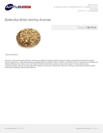 BEFSZTYK.pl ul. Szaserów 69/71/6 ADRES SKLEPU: ul. Dygata 3, 04-311 Warszawa 22 254 11 11, 668 668 500 Bułeczka Bröd ciemny Aromat Cena: 1,90 PLN Opis produktu Aromat to mała warszawska piekarnia, kultywująca najlepsze tradycje wypieku pieczywa według oryginalnych francuskich receptur. Ręcznie zagniatane z mąki sprowadzanej z gospodarstwa na południu Francji i mielona w lokalnym młynie. W składzie żywe drożdże lub zakwas chlebowy oraz mąka, woda i sól. Długie fermentowanie ciasta sprawia, że jego smak, zapach i walory odżywcze są nieporównywalnie większe od przemysłowych wypieków z gotowych mieszkanek mącznych. Pieczywo zachowuje chrupkość skórki i treściwość miękkiego wnętrza przez kilka dni. Plik wygenerowano: 02-03-2017 Powered by TCPDF (www.tcpdf.org) Oprogramowanie sklepu: AptusShop