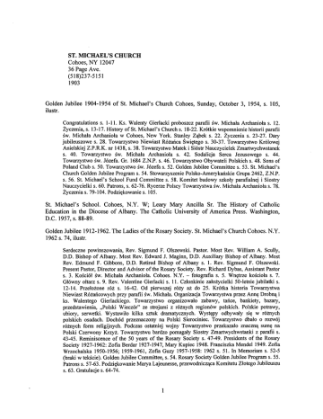 ST. MICHAEL'S CHURCH Cohoes, NY 12047 36 Page Ave. (518)237-5151 1903 Golden Jubilee 1904-1954 of St. Michael's Church Cohoes, Sunday, October 3, 1954, s. 105, ilustr. Congratulations s. 1-11. Ks. Walenty Gierlacki proboszcz parafii św. Michała Archanioła s. 12. Życzenia, s. 13-17. History of St. Michael's Church s. 18-22. Krótkie wspomnienie historii parafii św. Michała Archanioła w Cohoes, New York. Stanley Ząbek s. 22. Życzenia s. 23-27. Dary jubileuszowe s. 28. Towarzystwo Niewiast Różańca Świętego s. 30-37. Towarzystwo Królowej Anielskiej Z.P.R.K. nr 1438, s. 38. Towarzystwo Matek i Sióstr Nauczycielek Zmartwychwstanek s. 40. Towarzystwo św. Michała Archanioła s. 42. Sodalicja Serca Jezusowego s. 44. Towarzystwo św. Józefa. Gr. 1684 Z.N.P. s. 46. Towarzystwo Obywateli Polskich s. 48. Sons of Poland Club s. 50. Towarzystwo św. Józefa s. 52. Golden Jubilee Committee s. 53. St. Michael's Church Golden Jubilee Program s. 54. Stowarzyszenie Polsko-Amerykańskie Grupa 2462, Z.N.P. s. 56. St. Michael's School Fund Committee s. 58. Komitet budowy szkoły parafialnej i Siostry Nauczycielki s. 60. Patrons, s. 62-76. Rycerze Polscy Towarzystwa św. Michała Archanioła s. 78. Życzenia s. 79-104. Podziękowanie s. 105. St. Michael's School. Cohoes, N.Y. W; Leary Mary Ancilla Sr. The History of Catholic Education in the Diocese of Albany. The Catholic University of America Press. Washington, D.C. 1957, s. 88-89. Golden Jubilee 1912-1962. The Ladies of the Rosary Society. St. Michael's Church Cohoes. N.Y. 1962 s. 74, ilustr. Serdeczne powinszowania, Rev. Sigmund F. Olszewski. Pastor. Most Rev. William A. Scully, D.D. Bishop of Albany. Most Rev. Edward J. Maginn, D.D. Auxiliary Bishop of Albany. Most Rev. Edmund F. Gibbons, D.D. Retired Bishop of Albany s. 1. Rev. Sigmund F. Olszewski. Present Pastor, Director and Advisor of the Rosary Society. Rev. Richard Dybas, Assistant Pastor s. 3. Kościół św. Michała Archanioła. Cohoes. N.Y. - fotografia s. 5. Wnętrze kościoła s. 7. Główny ołtarz s. 9. Rev. Valentine Gierlacki s. 11. Członkinie założycielki 50-letnie jubilatki s. 12-14. Przełożone róż s. 16-42. Od pierwszej róży aż do 25. Krótka historia Towarzystwa Niewiast Różańcowych przy parafii św. Michała. Organizacja Towarzystwa przez Annę Drobną i ks. Walentego Gierlackiego. Towarzystwo organizowało zabawy, tańce, bankiety, bazary, przedstawienia, „Polski Wieczór" ze strojami z różnych regionów polskich. Polskie potrawy, ubiory, serwetki. Wystawiło kilka sztuk dramatycznych. Występy odbywały się w różnych polskich osadach. Dochód przeznaczony na Polski Sierociniec. Towarzystwo dbało o rozwój różnych form religijnych. Podczas ostatniej wojny Towarzystwo przekazało znaczną sumę na Polski Czerwony Krzyż. Towarzystwu bardzo pomagały Siostry Zmartwychwstanki z parafii s. 43-45. Reminiscence of the 50 years of the Rosary Society s. 47-49. Presidents of the Rosary Society 1927-1962: Zofia Berdar 1927-1947, Mary Kupiec 1948. Franciszka Mendel 1949. Zofia Wrzochalska 1950-1956; 1959-1961, Zofia Guzy 1957-1958: 1962 s. 51. In Memoriam s. 52-5 (braki w tekście). Golden Jubilee Committee, s. 54. Rosary Society Golden Jubilee Program s. 55. Patrons s. 57-63. Podziękowanie Marya Lajeunesse, przewodnicząca Komitetu Złotego Jubileuszu s. 63. Gratulacje s. 64-74. 1 75th Anniversary St. Michael's Church 1904-1979. Cohoes, New York. Printed by Sigma Press Albany, New York 1979 s. 148, ilustr. St. Michael's Church in 1904 s. 3. Papal Blessing From Pope John Paul II s. 4. Howard J. Hubbard Bishop of Albany s. 5. Rev. Valentine Gierlacki, formation of St. Michael's Parish s. 6. Rev. Sigmund F. Olszewski, graduated St. Mary's College, Orchard Lake, Michigan. Associate at St. Stanislaus Church, Amsterdam and as pastor at Secret Heart Church in Hudson. Fotografia s. 7. Rev. Richard W. Dybas, biography. Fotografia s. 8. Rev. Joseph J. Lepich was born in Poland. Graduated from a Seminary and University in Kraków. Chaplain of the Polish Army in Italy biography. Fotografia s. 9. Rev. M. Nowakowski was born in Poland. Father was in concentration camps from 1939-1945 when the American Army rescued him - biography. Fotografia s. 9. Father Richard F. Jones s. 10. Faculty Staff Semester 1978-1979 - fotografia, s. 11. Diamond Jubilee Committee - fotografia, s. 13. Program of the Diamond Jubilee Celebration of St. Michael's Church Sunday, October 14, 1979 s. 14. Diamond Jubilee Committee: Anniversary Book Committee, History Committee, Invitation Committee, Reception Committee, Banquet Committee, Picture Committee, Publicity s. 15. History of St. Michael's Church in Cohoes s. 1723. Krótka historia parafii św. Michała w Cohoes: Pierwsi Polacy w Cohoes w 1901 roku. Komitet założycielski w parafii. Msze dla Polaków w szkole, odprawiane przez ks. M. Malakaitis, proboszcza parafii św. Kazimierza w Albany, N.Y. 13 grudnia 1903 roku pierwsza Msza św. odprawiana przez pierwszego proboszcza ks. Walentego Gierlackiego. W 1904 roku zorganizowanie Towarzystwa Rycerzy św. Michała. Wówczas zamieszkiwało 94 polskich rodzin. Rozpoczęcie budowy kościoła. W 1905 roku Wielkanoc obchodzono już w nowym kościele. W 1907 roku budowa nowej plebanii. W 1918 roku założenie parafialnego cmentarza. W 1924 roku pożar szkoły i kościoła. W 1925 roku przebudowa kościoła, konsekracji dokonał ks. bp Edmund F. Gibbson. Szkoła parafialna prowadzona przez Siostry Zmartwychwstanki. Srebrny jubileusz kapłański ks. Gierlackiego w 1928 roku a w 1933 roku złoty jubileusz. W 1950 roku do parafii przybyło 30 polskich rodzin. Śmierć wielkiego kapłana, patrioty i Polaka ks. W. Gierlackiego dnia 1 października 1954 roku. Od 4 października 1954 roku drugi proboszcz ks. Zygmunt F. Olszewski. Zakończenie budowy szkoły. Wmurowanie pamiątkowej tablicy ku czci ks. W. Gierlackiego. Dalsze innowacje w kościele: remonty, malowanie, przedłużenie nawy kościelnej i odda