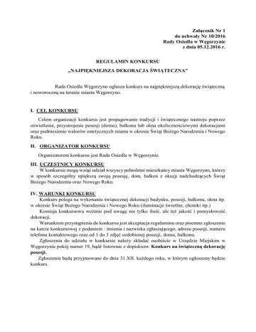 Załącznik Nr 1 do uchwały Nr 10/2016 Rady Osiedla w Węgorzynie z dnia 05.12.2016 r. REGULAMIN KONKURSU „NAJPIĘKNIEJSZA DEKORACJA ŚWIĄTECZNA” Rada Osiedla Węgorzyno ogłasza konkurs na najpiękniejszą dekorację świąteczną i noworoczną na terenie miasta Węgorzyno. I. CEL KONKURSU Celem organizacji konkursu jest propagowanie tradycji i świątecznego nastroju poprzez oświetlenie, przystrojenie posesji (domu), balkonu lub okna okolicznościowymi dekoracjami oraz podniesienie walorów estetycznych miasta w okresie Świąt Bożego Narodzenia i Nowego Roku. II. ORGANIZATOR KONKURSU Organizatorem konkursu jest Rada Osiedla w Węgorzynie. III. UCZESTNICY KONKURSU W konkursie mogą wziąć udział wszyscy pełnoletni mieszkańcy miasta Węgorzyno, którzy w sposób szczególny upiększą swoją posesję, dom, balkon z okazji nadchodzących Świąt Bożego Narodzenia oraz Nowego Roku. IV. WARUNKI KONKURSU Konkurs polega na wykonaniu świątecznej dekoracji budynku, posesji, balkonu, okna itp. w okresie Świąt Bożego Narodzenia i Nowego Roku (iluminacje świetlne, choinki itp.) Komisja konkursowa weźmie pod uwagę nie tylko ilość, ale też jakość i pomysłowość dekoracji. Warunkiem przystąpienia do konkursu jest akceptacja regulaminu oraz pisemne zgłoszenie na karcie konkursowej z podaniem : imienia i nazwiska zgłaszającego, adresu posesji, numeru telefonu kontaktowego oraz od 1 do 3 zdjęć ozdobionej posesji, domu, balkonu. Zgłoszenia do udziału w konkursie należy składać osobiście w Urzędzie Miejskim w Węgorzynie pokój numer 19, bądź listownie z dopiskiem: Konkurs na świąteczną dekorację posesji. Zgłoszenia będą przyjmowane do dnia 31.XII. każdego roku, w którym ogłoszony będzie konkurs. V. KOMISJA KONKURSOWA Oceny zgłoszonych dekoracji dokona 3 osobowa komisja konkursowa wyłoniona spośród członków Rady Osiedla. O dokładnym terminie odwiedzin zgłoszonych posesji uczestnicy zostaną poinformowani telefonicznie VI. NAGRODY W konkursie przewidziane są nagrody finansowe : I nagroda – 300 zł. II nagroda – 200 zł. III nagroda – 150 zł. oraz dyplomy i dodatkowe wyróżnienie. VII. WYNIKI KONKURSU Po rozstrzygnięciu konkursu zwycięzcy poinformowani zostaną o terminie i miejscu wręczenia nagród. Ponadto wyniki zostaną opublikowane także na stronie internetowej miasta Węgorzyno www.wegorzyno.pl VIII. POSTANOWIENIA KOŃCOWE W konkursie nie mogą brać udziału członkowie Zarządu Rady Osiedla w Węgorzynie. Wysłanie zdjęcia jest równoznaczne z wyrażeniem zgody na przetwarzanie danych osobowych oraz wykorzystanie zdjęcia do celów niniejszego konkursu. Wszelkich informacji udziela Róża Durkowska – pracownik Urzędu Miejskiego pod numerem telefonu (91) 39 70 086. Regulamin, oraz karta zgłoszenia dostępne są także w wersji elektronicznej na stronie internetowej www.wegorzyno.pl. Serdecznie zachęcamy do podniesienia walorów estetycznych naszego miasta poprzez czynny udział w konkursie. Regulamin został zatwierdzony uchwałą Rady Osiedla Węgorzyno Nr 10/2016 w dniu 05.12.2016 r. Załączniki : Karta zgłoszenia KARTA ZGŁOSZENIA DO KONKURSU „NAJPIĘKNIEJSZA DEKORACJA ŚWIĄTECZNA” 1. Imię …………………………………………………………………………………….. 2. Nazwisko ……………………………………………………………………………….. 3. Adres zamieszkania …………………………………………………………………….. 4. Adres zgłaszanej posesji, balkonu ……………………………………………………... 5. PESEL ………………………………………………………………………………….. 6. Numer dowodu osobistego ……………………………………………………………... 7. Tel. kontaktowy ………………………………………………………………………... Niniejszym zgłaszam swój udział w konkursie „Najpiękniejsza dekoracja świąteczna”. Oświadczam, że zapoznałem/am się z treścią Regulaminu i akceptuję jego postanowienia. Potwierdzenia złożonego zgłoszenia …………………………………………. podpis uczestnika …………………………………… organizator