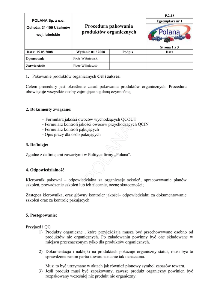 P.2.18 Egzemplarz nr 1 POLANA Sp. z o.o. OchoŜa, 21-109 Uścimów woj. lubelskie Data: 15.05.2008 Procedura pakowania produktów organicznych Wydanie 01 / 2008 Opracował: Piotr Wiśniewski Zatwierdził: Piotr Wiśniewski Podpis Strona 1 z 3 Data 1. Pakowanie produktów organicznych Cel i zakres: Celem procedury jest określenie zasad pakowania produktów organicznych. Procedura obowiązuje wszystkie osoby zajmujące się daną czynnością. 2. Dokumenty związane: - Formularz jakości owoców wychodzących QCOUT - Formularz kontroli jakości owoców przychodzących QCIN - Formularz kontroli pąkujących - Opis pracy dla osób pakujących 3. Definicje: Zgodne z definicjami zawartymi w Polityce firmy „Polana”. 4. Odpowiedzialność Kierownik pakowni – odpowiedzialna za organizację szkoleń, opracowywanie planów szkoleń, prowadzenie szkoleń lub ich zlecanie, ocenę skuteczności; Zastępca kierownika, oraz główny kontroler jakości– odpowiedzialni za dokumentowanie szkoleń oraz za kontrolę pakujących 5. Postępowanie: Przyjazd i QC 1) Produkty organiczne , które przyjeŜdŜają muszą być przechowywane osobno od produktów nie organicznych. Po załadowaniu powinny być one składowane w miejscu przeznaczonym tylko dla produktów organicznych. 2) Dokumentacja i naklejki na produktach pokazuje organiczny status, musi być to sprawdzone zanim partia towaru zostanie tak oznaczona. Musi to być utrzymane w aktach jak równieŜ pionowy symbol zapasów towaru. 3) Jeśli produkt musi być zapakowany, zawsze produkt organiczny powinien być rozpakowany wcześniej niŜ produkt nie organiczny. P.2.18 Egzemplarz nr 1 POLANA Sp. z o.o. OchoŜa, 21-109 Uścimów woj. lubelskie Data: 15.05.2008 Procedura pakowania produktów organicznych Wydanie 01 / 2008 Opracował: Piotr Wiśniewski Zatwierdził: Piotr Wiśniewski Podpis Strona 2 z 3 Data 4) Paleta musi być szczególnie oznaczona właściwą naklejką, która pokazuje, Ŝe jest to oryginalny produkt organiczny z właściwym numerem partii. 5) Procedura QC musi być ukończona dla produktów organicznych przed kaŜdą inną. Jeśli jest to nie wykonalne z jakiegoś powodu naleŜy gruntownie wyczyścić partię QC i całe wyposaŜenie musi sprawdzone, aby się upewnić, Ŝe nie dojdzie do Ŝadnego zanieczyszczenia. Przechowywanie. 1) W czasie wypełniania QC, akta zapasowych partii muszą przechowywane. Muszą być one prowadzone za kaŜ dym razem kiedy produkt jest pakowany z tej partii.(Ten formularz pokazuje nam ilość owoców podczas rozpoczęcia pakowania, ewentualne straty oraz ilość owoców na koniec pakowania) 2) Po QC produkt moŜe być przetransportowany w miejsce przeznaczenia do głównej chłodni lub do przechowalni CA. Tym razem partia towaru musi być oznaczona: a) numer partii b) typ owoców c) pochodzenie owoców d) data przyjazdu e) numer jednostki na palecie Pakowanie 1) Pakowanie owoców organicznych musi być pierwszą czynnością od której zaczynamy pakowanie kaŜdego dnia. 2) Tylko w pełni wyszkolony zespół moŜe pakować owoce organiczne w miejscu do tego specjalnie przeznaczonym. 3) Kontroler musi sprawdzać czy osoby pakujące wydają paczki o odpowiedniej wadze i czy miejsce rozpoczęcia pracy jest czyste. 4) Numer partii produktu powinien być jasno widoczny na karcie osoby pakującej i kontrolera jak i zespół QC musi być pewny, Ŝe jest to odpowiednia partia. 6) Osoby pakujące owoce organiczne powinny przestrzegać specjalnej higieny. 7) Po uŜyciu jakiegokolwiek środka czyszczącego całe wyposaŜenie musi być umyte czystą wodą, aby usunąć wszystkie zanieczyszczenia. 8) Spakowane owoce powinny być przetransportowane do głównej chłodni i ułoŜone w miejscu przeznaczonym dla owoców organicznych. P.2.18 Egzemplarz nr 1 POLANA Sp. z o.o. OchoŜa, 21-109 Uścimów woj. lubelskie Data: 15.05.2008 Procedura pakowania produktów organicznych Wydanie 01 / 2008 Opracował: Piotr Wiśniewski Zatwierdził: Piotr Wiśniewski Strona 3 z 3 Data Podpis Szkolenie zespołu 1) KaŜdy zespół, który będzie pracował przy pakowaniu owoców organicznych musi przejść szkolenie, aby stosować się do standardów Głównej Operacji i Dodatkowych Standardów dla Specyfikacji Produktów co jest opisane w Stowarzyszeniu Standardów Ziemi Dla Farm i Produktów Organicznych. 2) Szklenie musi być przeprowadzone według aktualnej dokumentacji tego stowarzyszenia. 3) Cały zespól musi być przedstawiony na listę osobową aby moŜna sprawdzić czy wszystko jest stosowne ze Standardami Stowarzyszenia Ziemi INFORMACJE DOTYCZĄCE PAKOWANIA PRODUKTÓW ORGANICZNYCH. 1) PAKOWANIE PRODUKTÓW ORGANICZNYCH POWINNO BYĆ PIERWSZĄ CZYNNOŚCIĄ DNIA. 2) UśYĆ SPECJALISTYCZNY WAśENIA. STÓŁ WARSZTATOWY DO DZIELENIA I 3) UMYĆ STÓŁ WARSZTATOWY I STÓŁ DO DZIELENIA CZYSTĄ WODĄ ( JEŚLI TRZEBA MOśNA UśYĆ ŚRODEK CZYSZCZĄCY, ALE POTEM STÓŁ MUSI BYĆ UMYTY ZNOWU CZYSTĄ WODĄ) 4) BRAĆ PRODUKTY TYLKO Z CZĘŚCI PRODUKTÓW ORGANICZNYCH Z CHŁODNI I SPISAĆ NUMERY PARTII NA KARTACH PRACY (KONTROLER MUSI SPRAWDZIĆ WSZYSTKIE PARTIE). 5) UTRZYMAĆ MIEJCE PRZCY W SZCZEGÓLNEJ CZYSTOŚCI ABY NIE DOSZŁO DO ZANIECZYSCZENIA PRODUKTÓW ORGANICZNYCH. 6) UMYĆ RĘCE PRZED ROZPOCZĘCIEM PRACY, PO PÓJŚCIU DO TOALETY, PO JEDZENIU CZY PALENIU. 7) ZAPAKOWANY PRODYKT MUSI POWRUCIĆ NA WYZNACZONE MIEJSCE W CHŁODNICY. 8) JEŚLI Z JAKIEGOŚ POWODU ZABRAKŁO PRODUKTÓW DO PAKOWANIA NALEśY POWIADOMIĆ O TYM KONTROLERA. NIGDY NIE UśYWAĆ INNYCH NIE ORGANICZNYCH PRODUKTÓW DO UKOŃCZENIA PRACY.