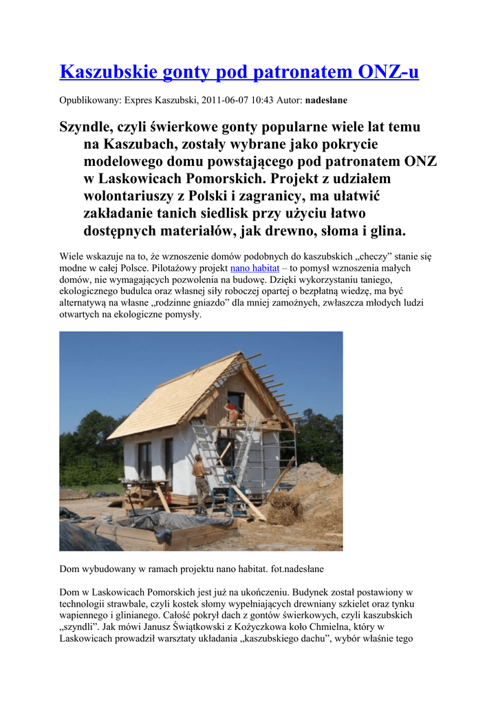 Kaszubskie gonty pod patronatem ONZ-u Opublikowany: Expres Kaszubski, 2011-06-07 10:43 Autor: nadesłane Szyndle, czyli świerkowe gonty popularne wiele lat temu na Kaszubach, zostały wybrane jako pokrycie modelowego domu powstającego pod patronatem ONZ w Laskowicach Pomorskich. Projekt z udziałem wolontariuszy z Polski i zagranicy, ma ułatwić zakładanie tanich siedlisk przy użyciu łatwo dostępnych materiałów, jak drewno, słoma i glina. Wiele wskazuje na to, że wznoszenie domów podobnych do kaszubskich „checzy” stanie się modne w całej Polsce. Pilotażowy projekt nano habitat – to pomysł wznoszenia małych domów, nie wymagających pozwolenia na budowę. Dzięki wykorzystaniu taniego, ekologicznego budulca oraz własnej siły roboczej opartej o bezpłatną wiedzę, ma być alternatywą na własne „rodzinne gniazdo” dla mniej zamożnych, zwłaszcza młodych ludzi otwartych na ekologiczne pomysły. Dom wybudowany w ramach projektu nano habitat. fot.nadesłane Dom w Laskowicach Pomorskich jest już na ukończeniu. Budynek został postawiony w technologii strawbale, czyli kostek słomy wypełniających drewniany szkielet oraz tynku wapiennego i glinianego. Całość pokrył dach z gontów świerkowych, czyli kaszubskich „szyndli”. Jak mówi Janusz Świątkowski z Kożyczkowa koło Chmielna, który w Laskowicach prowadził warsztaty układania „kaszubskiego dachu”, wybór właśnie tego pokrycia dachowego przez organizatorów, to spore wyróżnienie i promocja dla naszego regionalnego budownictwa. Janusz Świątkowski z Kożyczkowa prowadził w Laskowicach Pomorskich warsztaty układania kaszubskiego dachu. fot.nadesłane - Okazuje się, że kaszubskie gonty są unikalne w skali całego kraju, do tego, niezasłużenie, prawie zupełnie nieznane w innych regionach Polski – mówi Janusz Świątkowski. – Mam nadzieję, że medialne zainteresowanie projektem nano habitat spopularyzuje technologię wytwarzania i układania „szyndli”, znaną kiedyś w większości gospodarstw na Kaszubach. Odkurzona tradycja Czym różnią się świerkowe gonty z Pomorza od tych, które zdobią chaty góralskie? „Szyndle”, albo inaczej „szkudły” są cięte podobnie jak wióry osikowe – w cienkie plasterki na specjalnej maszynie. Dawniej, przed pojawieniem się na wsi eternitu i blachy, na Kaszubach wyrabianiem „szyndli” trudniły się całe rodziny. Jeśli brakowało rąk do pracy na dachu, pomagali sąsiedzi. Zdaniem Janusza Świątkowskiego, członka grupy Cohabitat, wspólnota wolontariuszy, która wytworzyła się podczas warsztatów w Laskowicach Pomorskich, może przypominać dawne sposoby budowania domów na Kaszubach. fot.nadesłane - Maszynę do gontów użyczył mi Andrzej Kostuch z Wichrowego Wzgórza w Chmielnie – wyjaśnia. – To właśnie jego ciotka nadzorowała na wybudowaniach chmieleńskich przygotowanie mieszanki gliny i krowiego nawozu, którą wypełniano ściany nowo budowanych checzy. Kiedy dwoje młodych brało ślub, cała wieś zabierała się do pracy i w ciągu kilku dni taka ekipa wykańczała dom, do którego można było się wprowadzać. W proces wznoszenia domu w Laskowicach Pomorskich zaangażowało się około pięćdziesięciu osób z różnych regionów Polski, byli też wolontariusze z Czech i Turcji. Jak tłumaczy Paweł Sroczyński założyciel grupy Cohabitat, zdobyte w ten sposób doświadczenie i umiejętności wystarczą do samodzielnego postawienia własnego domu, przy minimalnym zaangażowaniu własnych środków. fot.nadesłane - Połowę kosztów każdej budowy domu pochłania robocizna – tłumaczy Paweł Sroczyński. – Jeśli uda się nam stworzyć własną grupę budowlaną złożoną np. z rodziny i przyjaciół, to zostaje w kieszeni całkiem sporo. Wbrew pozorom zastosowanie słomy i gliny nie daje spektakularnych oszczędności, natomiast wymierną korzyścią są walory zdrowotne takiego domu i jego niskie koszty utrzymania. ONZ wspiera oszczędnych Według danych organizatorów warsztatów w Laskowicach, współczynnik przenikalności cieplnej dla ściany z bloczków słomy jest ten sam co dla styropianu o grubości 40 cm. Interesujące są parametry wewnętrznego tynku glinianego, który bardzo dobrze reguluje wilgotność powietrza w pomieszczeniach. Izoluje też przed niekorzystnym promieniowaniem elektromagnetycznym. Jako ciekawostkę podaje się, że odpowiednio ułożona glina praktycznie uniemożliwia korzystanie w domu z telefonów komórkowych. Patronat nad budową pierwszego w Polsce nano habitatu objął Program Narodów Zjednoczonych ds Rozwoju (UNDP). Jednym z jego celów jest zapobieganie marginalizacji społecznej ludzi, których nie stać na budowę własnego siedliska, przy rosnącej komercjalizacji rynków budowlanych i wzrastających kosztach budowy domu. - Mam nadzieję, że wkrótce podobne warsztaty będą mogły odbyć się na naszym terenie – dodaje Janusz Świątkowski, który informacjami na temat kaszubskich dachów dzieli się na swoim blogu swierkowegonty.wordpress.com. – Naszym bogactwem jest fakt, że domy tradycyjne, kaszubskie checze, zbudowane dzięki doświadczeniom wielu pokoleń, mamy obok siebie, na wyciągnięcie ręki. Żyje też sporo starszych osób, których wiedza może być punktem wyjścia do bardzo ciekawych projektów. (oprac.W.D.)