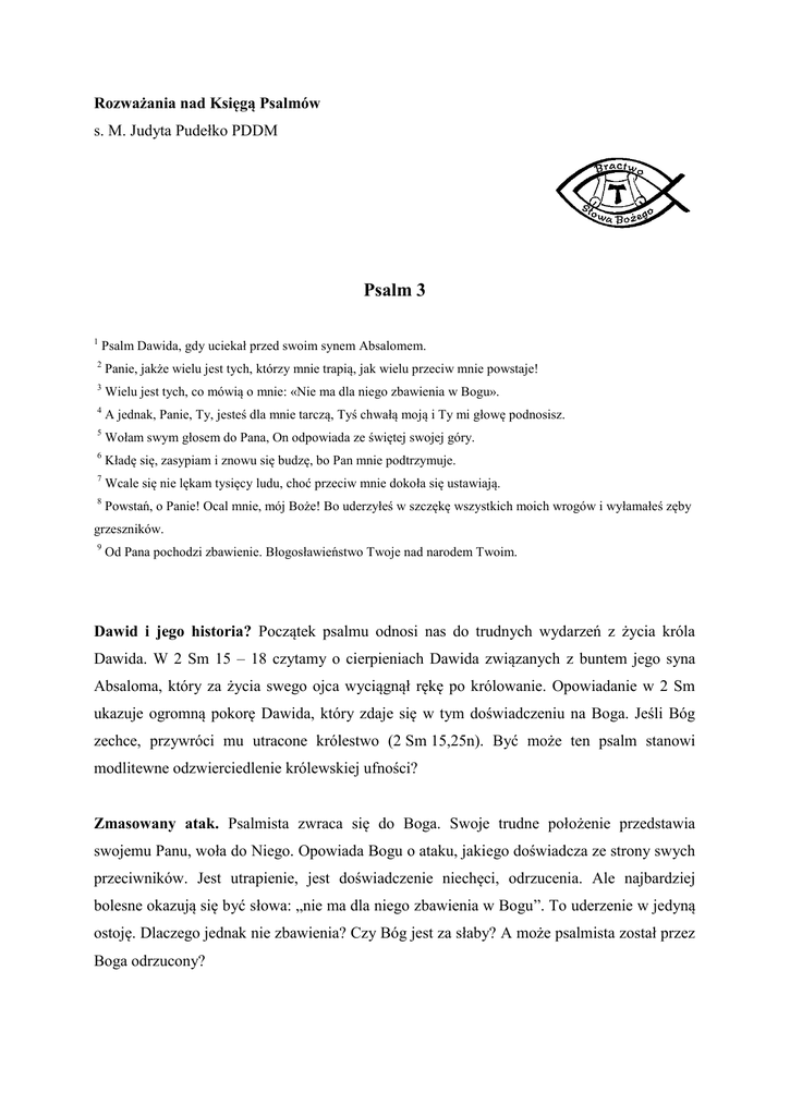 Rozważania nad Księgą Psalmów s. M. Judyta Pudełko PDDM Psalm 3 1 Psalm Dawida, gdy uciekał przed swoim synem Absalomem. 2 Panie, jakże wielu jest tych, którzy mnie trapią, jak wielu przeciw mnie powstaje! 3 Wielu jest tych, co mówią o mnie: «Nie ma dla niego zbawienia w Bogu». 4 A jednak, Panie, Ty, jesteś dla mnie tarczą, Tyś chwałą moją i Ty mi głowę podnosisz. 5 Wołam swym głosem do Pana, On odpowiada ze świętej swojej góry. 6 Kładę się, zasypiam i znowu się budzę, bo Pan mnie podtrzymuje. 7 Wcale się nie lękam tysięcy ludu, choć przeciw mnie dokoła się ustawiają. 8 Powstań, o Panie! Ocal mnie, mój Boże! Bo uderzyłeś w szczękę wszystkich moich wrogów i wyłamałeś zęby grzeszników. 9 Od Pana pochodzi zbawienie. Błogosławieństwo Twoje nad narodem Twoim. Dawid i jego historia? Początek psalmu odnosi nas do trudnych wydarzeń z życia króla Dawida. W 2 Sm 15 – 18 czytamy o cierpieniach Dawida związanych z buntem jego syna Absaloma, który za życia swego ojca wyciągnął rękę po królowanie. Opowiadanie w 2 Sm ukazuje ogromną pokorę Dawida, który zdaje się w tym doświadczeniu na Boga. Jeśli Bóg zechce, przywróci mu utracone królestwo (2 Sm 15,25n). Być może ten psalm stanowi modlitewne odzwierciedlenie królewskiej ufności? Zmasowany atak. Psalmista zwraca się do Boga. Swoje trudne położenie przedstawia swojemu Panu, woła do Niego. Opowiada Bogu o ataku, jakiego doświadcza ze strony swych przeciwników. Jest utrapienie, jest doświadczenie niechęci, odrzucenia. Ale najbardziej bolesne okazują się być słowa: „nie ma dla niego zbawienia w Bogu”. To uderzenie w jedyną ostoję. Dlaczego jednak nie zbawienia? Czy Bóg jest za słaby? A może psalmista został przez Boga odrzucony? A jednak, Panie, Ty… Nie ma żadnej rozpaczy ani zatrzymania się na bolesnych atakach. Bolesna sytuacja staje się niespodziewanie przestrzenią wyznania bezgranicznej ufności wobec Boga. Psalmista nie dyskutuje z przeciwnikami. Woła do Boga. On jest jego tarczą, to znaczy osłania go ze wszystkich stron i przyjmuje na siebie wszelkie uderzenia i ciosy. Psalmista odwołuje się tu do obietnic danych Abrahamowi. Kiedy Bóg zwraca się do niego, dodaje mu odwagi, określa samego siebie jako tarczę (Rdz 15,1). Wartość, znaczenie psalmista znajduje w Bogu, który jest jego chwałą. On jest Tym, który podnosi głowę człowieka (por. 2 Sm 15,30), to znaczy przywraca mu utraconą pozycję, przenosi z udręki do ufności. Bóg czynnie uczestniczy w życiu człowieka poprzez dialog, odpowiedź, troskę w jego codzienności, dniach i nocach. Bliskość i miłość Boga wyzwala od lęku. Mój Bóg jest Zbawicielem. Wierzę. Psalmista zwycięża. Nie dlatego, że jest silniejszy od swoich wrogów czy doświadczanych przeciwności. Dlatego, że potrafił oprzeć się na Jedynym, który jest Zbawieniem. Nie pozwolił odebrać sobie pełnej zaufania wiary. Bóg ocala i ratuje od wszelkiego zagrożenia. Ten psalm jest obrazem walki duchowej przeciwko złu. Przykład psalmisty uczy, aby w każdym położeniu zwracać się do Boga, Jego wzywać. W obliczu największych trudności skierować swój wzrok na Pana, który uzdalnia człowieka do zwycięstwa. Bóg zbawia. Łk 21,25-28: „Będą znaki na słońcu, księżycu i gwiazdach, a na ziemi trwoga narodów bezradnych wobec szumu morza i jego nawałnicy. Ludzie mdleć będą ze strachu, w oczekiwaniu wydarzeń zagrażających ziemi. Albowiem moce niebios zostaną wstrząśnięte. Wtedy ujrzą Syna Człowieczego, nadchodzącego w obłoku z wielką mocą i chwałą. A gdy się to dziać zacznie, nabierzcie ducha i podnieście głowy, ponieważ zbliża się wasze odkupienie”. Jezu, Ty uzdolniłeś Piotra, aby szedł do Ciebie po wodzie, wśród kłębiących się fal i wiatru. Daj nam światłe oczy wiary, abyśmy pośród wszelkich utrapień potrafili utkwić nasz wzrok w Tobie, Tobie zaufać i w Tobie zwyciężać.