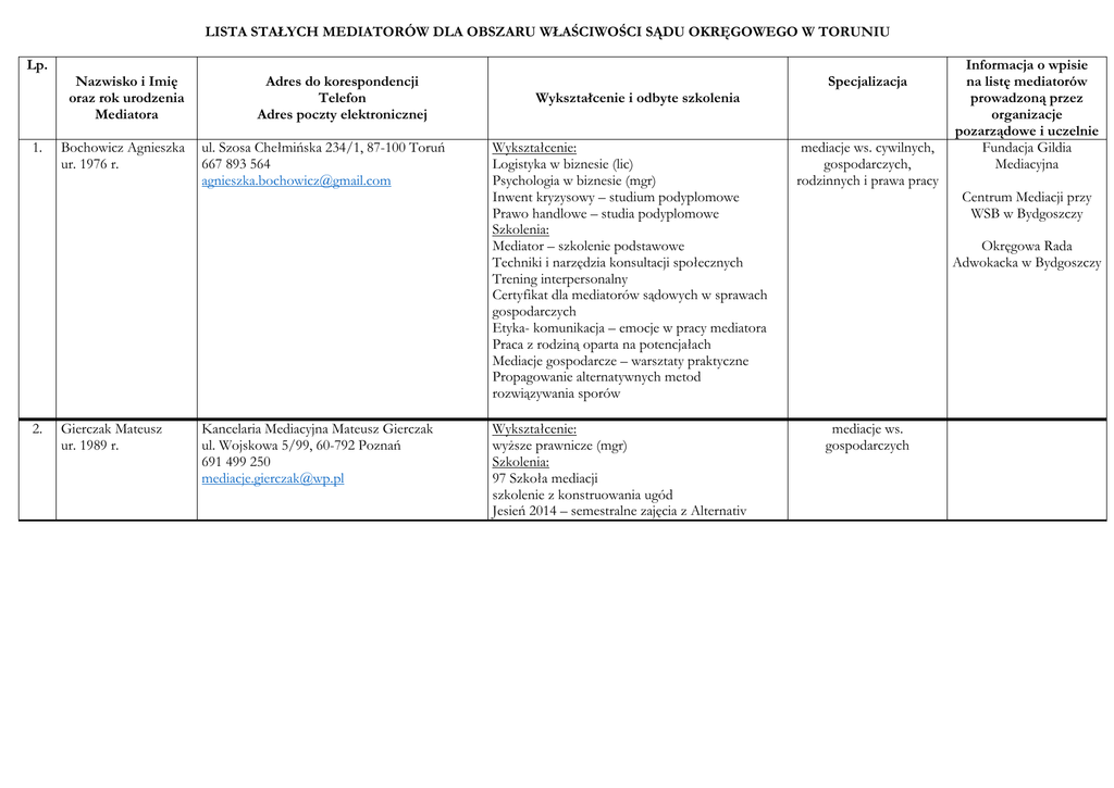LISTA STAŁYCH MEDIATORÓW DLA OBSZARU WŁAŚCIWOŚCI SĄDU OKRĘGOWEGO W TORUNIU Lp. Nazwisko i Imię oraz rok urodzenia Mediatora 1. 2. Bochowicz Agnieszka ur. 1976 r. Gierczak Mateusz ur. 1989 r. Adres do korespondencji Telefon Adres poczty elektronicznej ul. Szosa Chełmińska 234/1, 87-100 Toruń 667 893 564 [email protected] Kancelaria Mediacyjna Mateusz Gierczak ul. Wojskowa 5/99, 60-792 Poznań 691 499 250 [email protected] Wykształcenie i odbyte szkolenia Wykształcenie: Logistyka w biznesie (lic) Psychologia w biznesie (mgr) Inwent kryzysowy – studium podyplomowe Prawo handlowe – studia podyplomowe Szkolenia: Mediator – szkolenie podstawowe Techniki i narzędzia konsultacji społecznych Trening interpersonalny Certyfikat dla mediatorów sądowych w sprawach gospodarczych Etyka- komunikacja – emocje w pracy mediatora Praca z rodziną oparta na potencjałach Mediacje gospodarcze – warsztaty praktyczne Propagowanie alternatywnych metod rozwiązywania sporów Wykształcenie: wyższe prawnicze (mgr) Szkolenia: 97 Szkoła mediacji szkolenie z konstruowania ugód Jesień 2014 – semestralne zajęcia z Alternativ Specjalizacja mediacje ws. cywilnych, gospodarczych, rodzinnych i prawa pracy Informacja o wpisie na listę mediatorów prowadzoną przez organizacje pozarządowe i uczelnie Fundacja Gildia Mediacyjna Centrum Mediacji przy WSB w Bydgoszczy Okręgowa Rada Adwokacka w Bydgoszczy mediacje ws. gospodarczych 3. Kaźmierczak Janusz ur. 1979 r. Ośrodek Mediacyjny Fundacji Pracownia Dialogu ul. Ślusarska 2/1, 87-100 Toruń 56/471 02 21 607 904 796 [email protected] Wykształcenie: wykształcenie filozoficzne (lic) oraz socjologiczne ze specjalnością psychologia społeczna (mgr) Szkolenia: Wykorzystanie Dialogu Motywującego w mediacji Praca z rodziną oparta na potencjałach Restorative justice approaches Sexuality and Morality: Intercultural Perspectives and Mediations Wykorzystywanie analizy transakcyjnej w pracy mediatora Specjalistyczne szkolenie w zakresie alternatywnych sposobów rozwiązywania sporów w sprawach gospodarczych Organizacja i zarządzanie mediacją sądową Managing School Violence and Bullying: a Whole School Approach for Teachers Płeć w mediacji Jak efektywniej pracować i żyć z ludźmi Szkolenie ” Na prawo patrz” Warsztaty Umiejętności Trenerskich Tworzenie i zarządzanie projektami w ramach Europejskiego Funduszu Społecznego Prawa i potrzeby dziecka w konflikcie rozwodowym Szkolenie z mediacji rodzinnej Szkolenie podstawowe dla kandydatów na mediatorów mediacje ws. cywilnych, rodzinnych, gospodarczych Fundacja Pracownia Dialogu 4. Kaźmierczak Monika ur. 1979 r. Ośrodek Mediacyjny Fundacji Pracownia Dialogu ul. Ślusarska 2/1, 87-100 Toruń 56/471 02 21 502 306 110 [email protected] Wykształcenie: Kurs podstawowy terapii systemowej rodzin, małżeńskiej, indywidualnej i grupowej Studium Przeciwdziałania Przemocy w Rodzinie Szkoła trenerów ”Warsztat” Studia psychologiczne (mgr) Szkolenia: Wykorzystanie Dialogu Motywującego w mediacji Praca z rodziną oparta na potencjałach Warsztaty: Terapia par i małżeństw prowadzona w paradygmacie poznawczo behawioralnym Wykorzystywanie analizy transakcyjnej w pracy mediatora Szkolenie z zakresu mediacji gospodarczych Inteligencja emocjonalna Elementarz EFS Szkolenie z podstaw prawa Prawa i potrzeby dziecka w konflikcie rozwodowym Ekonomia społeczna jako nowe podejście do pracy socjalnej. Umiejętności psychologiczne i instrumenty ekonomii społecznej Szkolenie z mediacji rodzinnej Szkolenie dla koordynatorów konferencji sprawiedliwości naprawczej Szkolenie „ Jak zdobyć i zatrzymać wolontariusza” Szkolenie prawne dla mediatorów w zakresie mediacji cywilnej Szkolenie podstawowe dla kandydatów na mediatorów Przygotowanie do samodzielnej pracy z więźniami. Integracja i koordynacja działań różnych służb społecznych udzielających pomocy osobom opuszczającym jednostki penitencjarne Przemoc w rodzinie Niebieska linia Pierwsza pomoc dzieciom – ofiarom przemocy seksualnej mediacje ws. cywilnych, rodzinnych, gospodarczych Fundacja Pracownia Dialogu 5. Kubiak Aleksandra ur. 1975 ul. Robotnicza 1/19, 87-800 Włocławek 604 836 512 [email protected] 6. Paczkowska Irena ur. 1966 r. ul. Olszynowa 27, Brzozówka, 87-123 Dobrzejewice 669 696 619 [email protected] Wykształcenie: mediacje ws. cywilnych, wykształcenie wyższe prawnicze rodzinnych i studia podyplomowe „Mediacje sądowe i gospodarczych pozasądowe Szkolenia: Propagowanie alternatywnych metod rozwiązywania sporów Wykształcenie: mediacje ws. Negocjacje i mediacje – studia podyplomowe gospodarczych, cywilnych Negocjacje w usługach finansowych (mgr) i rodzinnych Psychologia w zarządzaniu (lic) Szkolenia: Propagowanie Alternatywnych Metod Rozwiązywania Sporów Szkolenie dla mediatorów organizowane przez Ośrodek Mediacji przy Okręgowej Izbie Radców Prawnych Szkolenie dla mediatorów z zakresu mediacji karnych i cywilnych Trener Zmian Trener NGO Szkolenia z zakresu konsultacji społecznych Szkolenia z zakresu mediacji – uzyskanie kwalifikacji mediatora Warsztaty menadżerskie Motywowanie i wynagradzanie pracowników Negocjacje Warsztaty z zakresu psychologii i organizacji pracy : Komunikacja, Funkcjonowanie grupy, Stres. Szczęście i satysfakcja Ośrodek Mediacji przy Okręgowej Izbie Radców Prawnych w Bydgoszczy Toruński Ośrodek Mediacji Gospodarczych przy Izbie Przemysłowo Handlowej w Toruniu 7. Podgórska Renata ur. 1962 r. 8. 9. Kancelaria Mediacyjna Na – Tak we Włocławku, ul. Towarowa 2/4, 87-800 Włocławek 604 256 868 [email protected] Wykształcenie: Zarządzanie zasobami ludzkimi Nauczanie matematyki z informatyką (lic) Szkolenia: Mediacje i negocjacje Mediacje rodzinne Przygotowanie kadry do prowadzenia kształcenia ustawicznego na odległość Propagowanie alternatywnych metod rozwiązywania sporów Mediator pilnie poszukiwany Szkolenie w zakresie alternatywnych sposobów rozwią
