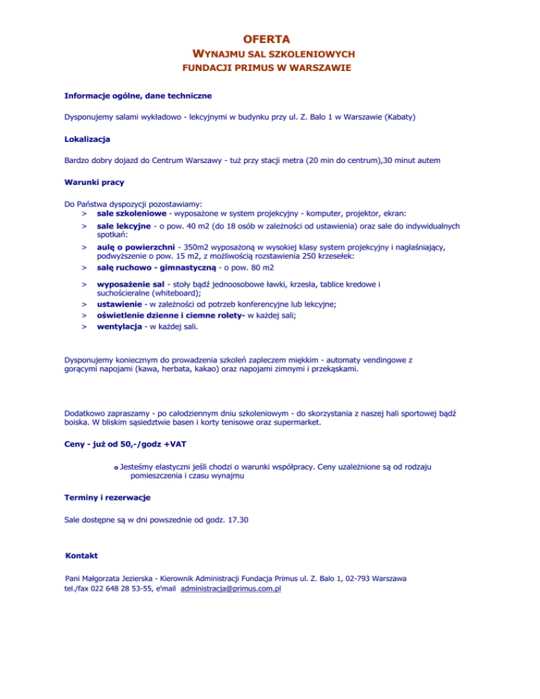 OFERTA WYNAJMU SAL SZKOLENIOWYCH FUNDACJI PRIMUS W WARSZAWIE Informacje ogólne, dane techniczne Dysponujemy salami wykładowo - lekcyjnymi w budynku przy ul. Z. Balo 1 w Warszawie (Kabaty) Lokalizacja Bardzo dobry dojazd do Centrum Warszawy - tuż przy stacji metra (20 min do centrum),30 minut autem Warunki pracy Do Państwa dyspozycji pozostawiamy: > sale szkoleniowe - wyposażone w system projekcyjny - komputer, projektor, ekran: > sale lekcyjne - o pow. 40 m2 (do 18 osób w zależności od ustawienia) oraz sale do indywidualnych spotkań: > aulę o powierzchni - 350m2 wyposażoną w wysokiej klasy system projekcyjny i nagłaśniający, podwyższenie o pow. 15 m2, z możliwością rozstawienia 250 krzesełek: > salę ruchowo - gimnastyczną - o pow. 80 m2 > wyposażenie sal - stoły bądź jednoosobowe ławki, krzesła, tablice kredowe i suchościeralne (whiteboard); > > > ustawienie - w zależności od potrzeb konferencyjne lub lekcyjne; oświetlenie dzienne i ciemne rolety- w każdej sali; wentylacja - w każdej sali. Dysponujemy koniecznym do prowadzenia szkoleń zapleczem miękkim - automaty vendingowe z gorącymi napojami (kawa, herbata, kakao) oraz napojami zimnymi i przekąskami. Dodatkowo zapraszamy - po całodziennym dniu szkoleniowym - do skorzystania z naszej hali sportowej bądź boiska. W bliskim sąsiedztwie basen i korty tenisowe oraz supermarket. Ceny - już od 50,-/godz +VAT o Jesteśmy elastyczni jeśli chodzi o warunki współpracy. Ceny uzależnione są od rodzaju pomieszczenia i czasu wynajmu Terminy i rezerwacje Sale dostępne są w dni powszednie od godz. 17.30 Kontakt Pani Małgorzata Jezierska - Kierownik Administracji Fundacja Primus ul. Z. Balo 1, 02-793 Warszawa tel./fax 022 648 28 53-55, e'mail [email protected]
